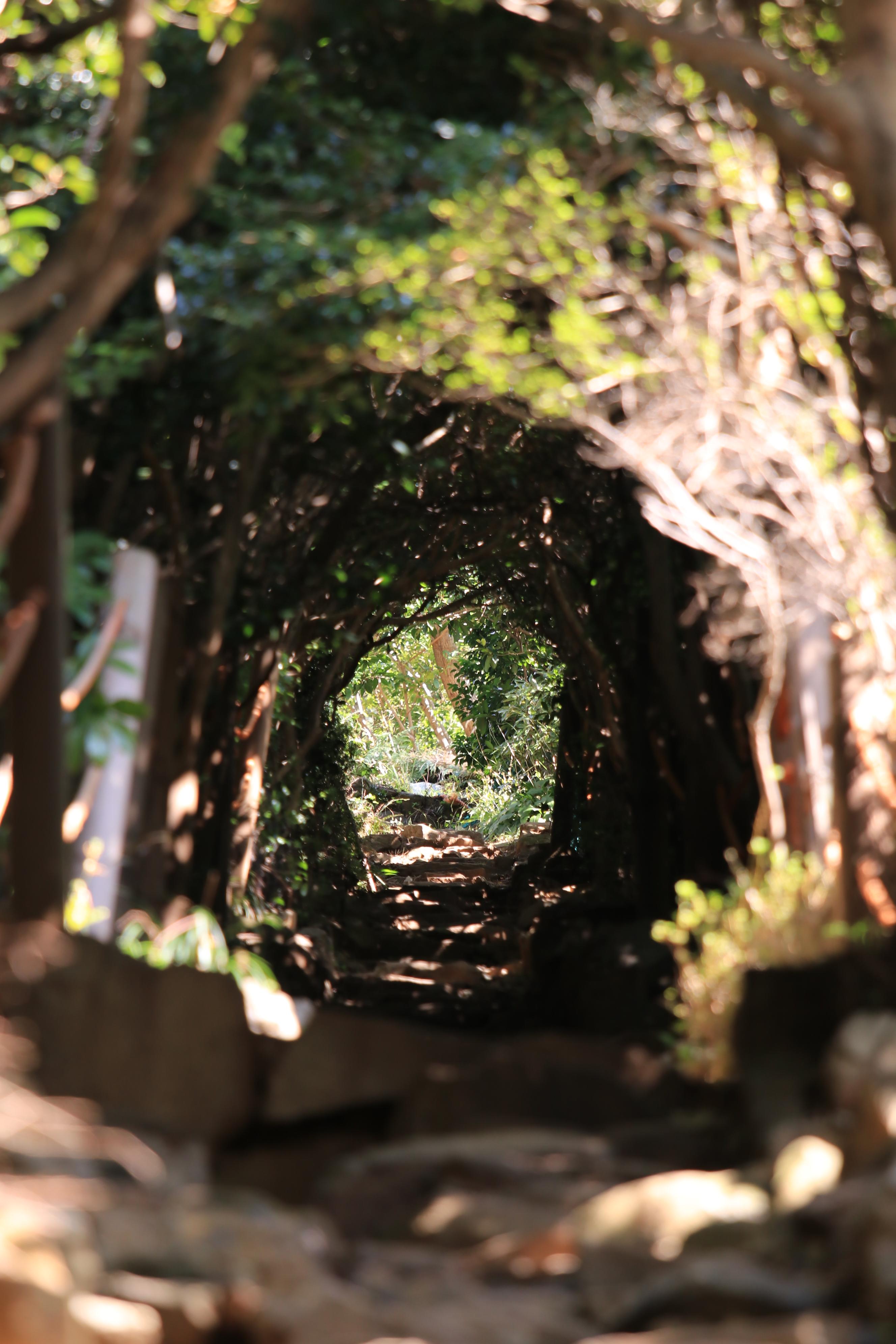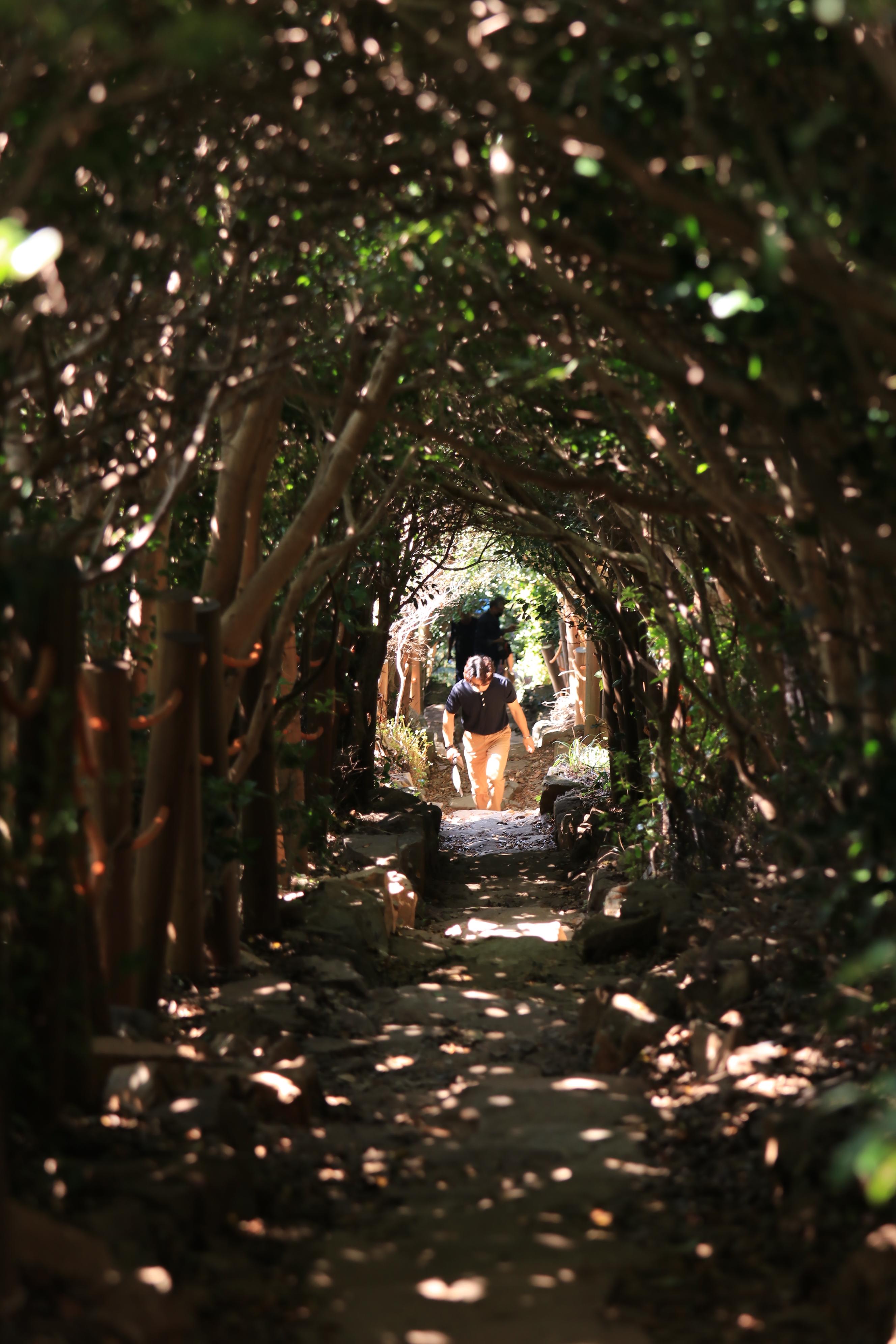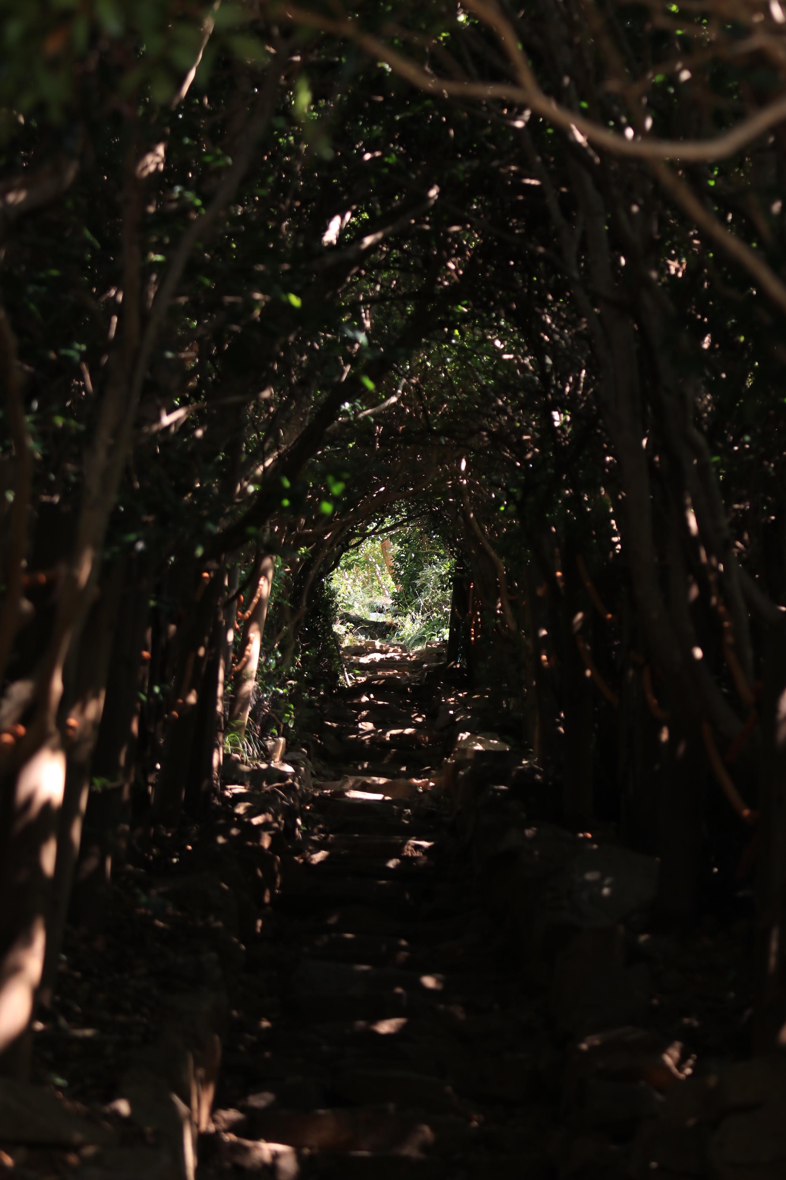 두 사람 정도 비켜갈 수 있는 좁디좁고, 높이도 키가 큰 사람은 허리를 숙여야 할 정도의 동백나무 터널은