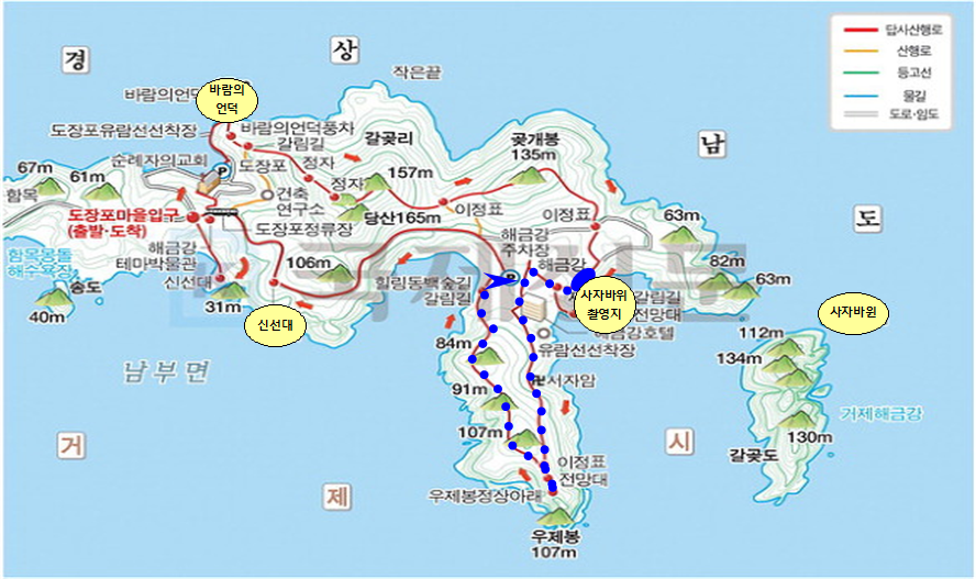 사자바위 일출 - 우제봉 둘레길(서자암, 우제봉 전망대 등, 55분 소요) - 신선대 - 바람의 언덕 - 공곶지