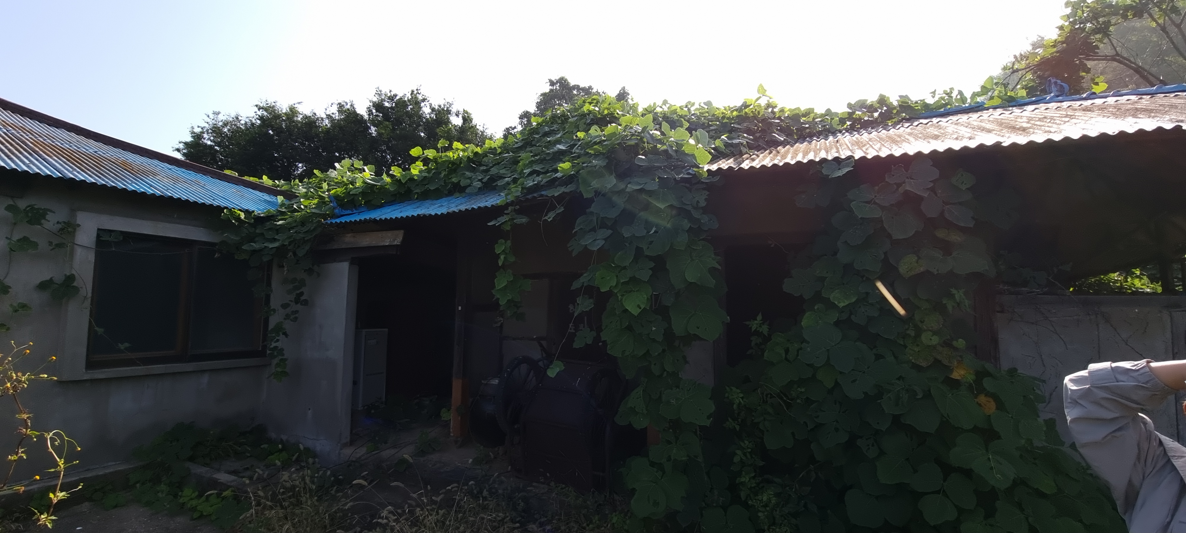 - 장화와 비닐 우의를 착용하고는 풀자르는 가위, 정글도 등으로 마당 및 지붕에 어지럽게 나 있는 각종 풀과