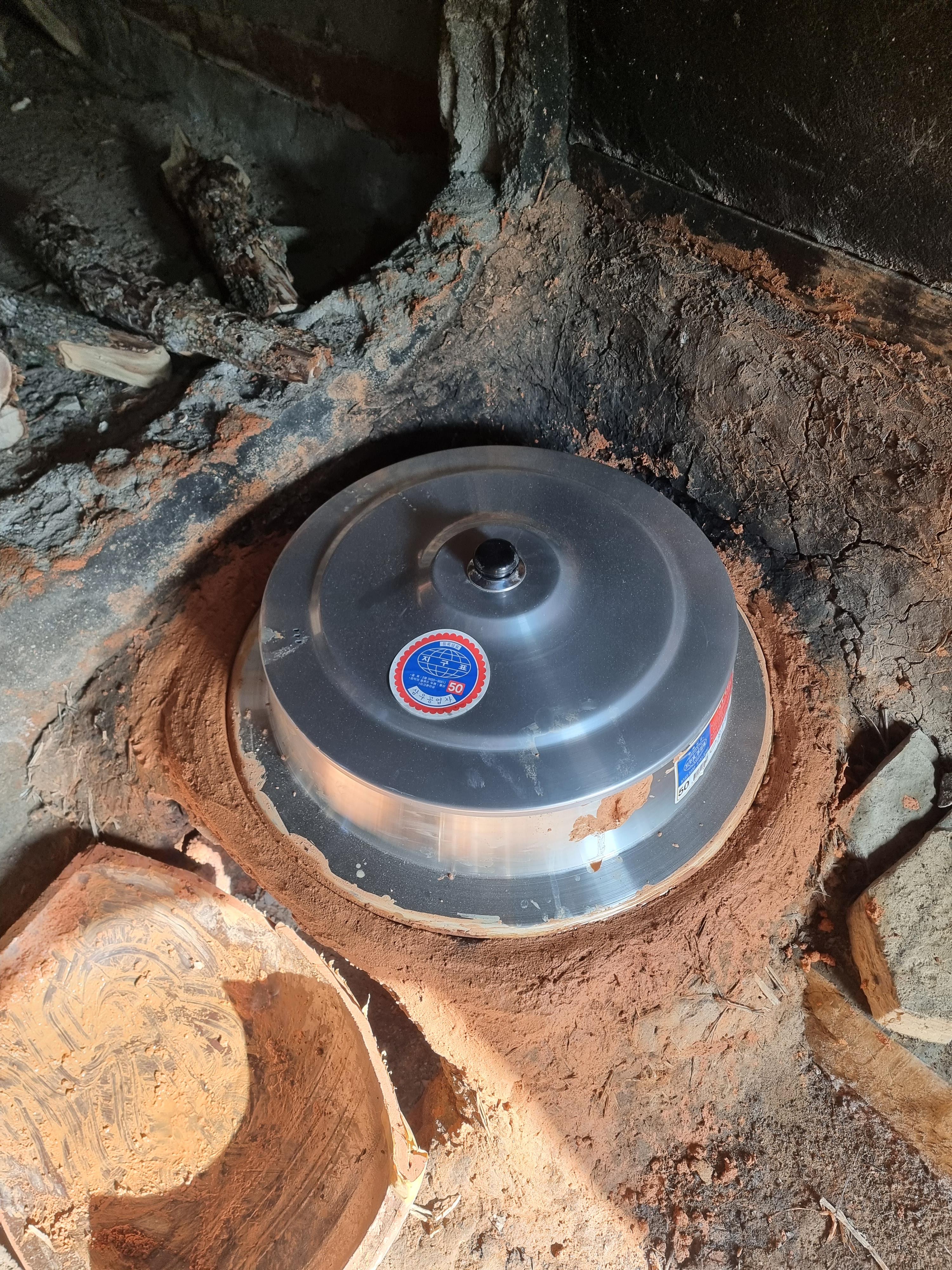 - 화구의 앞쪽 마개는 장독 두껑을 적당하게 잘라, 장독과 마찬가지로 황토로 조치.