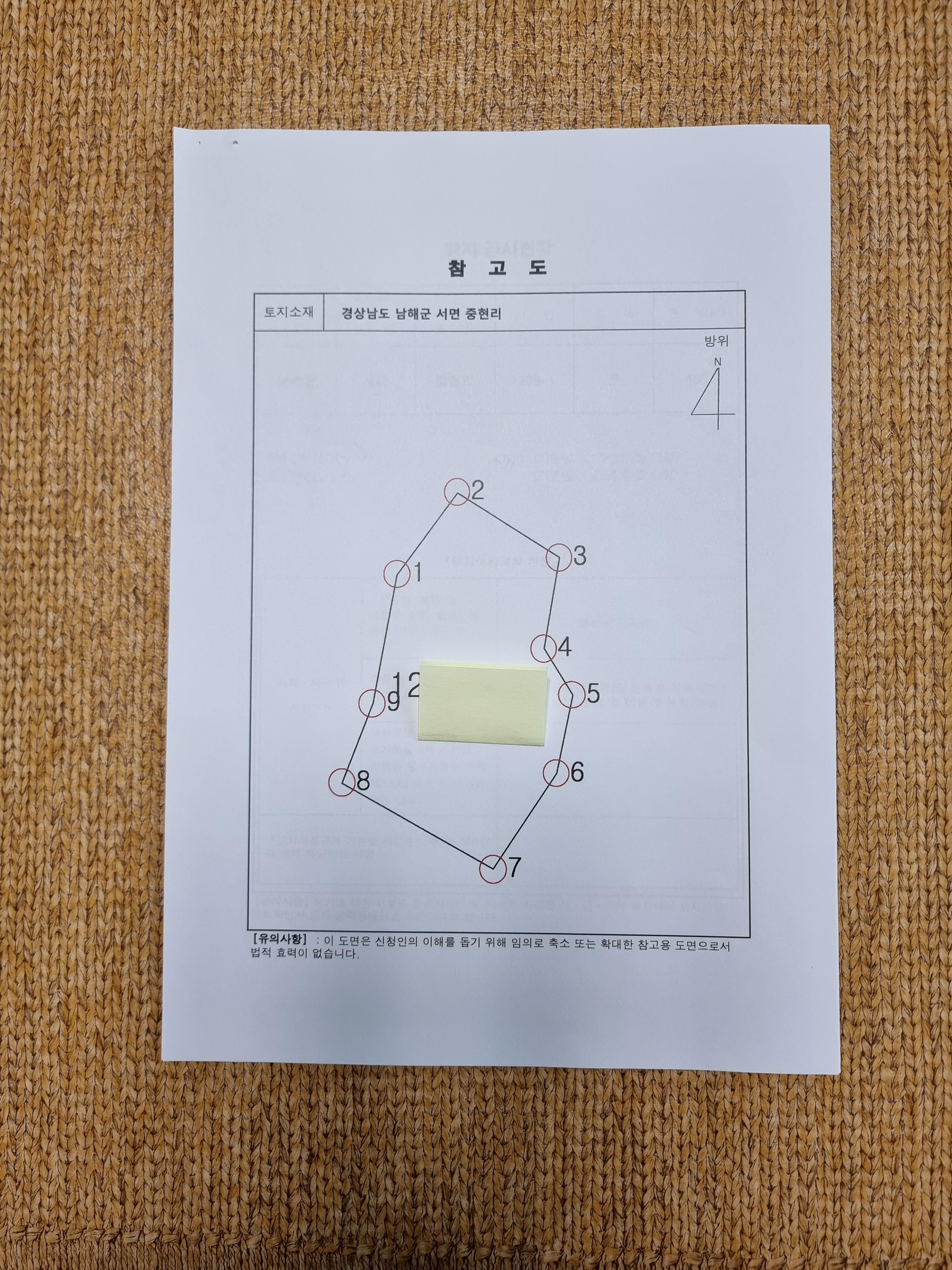- 소재지: 경남 남해군 서면 **리 000-0외 4필지, 대지 1018㎡(308평), 전 774㎡(234평), 총 1,792㎡(542평)