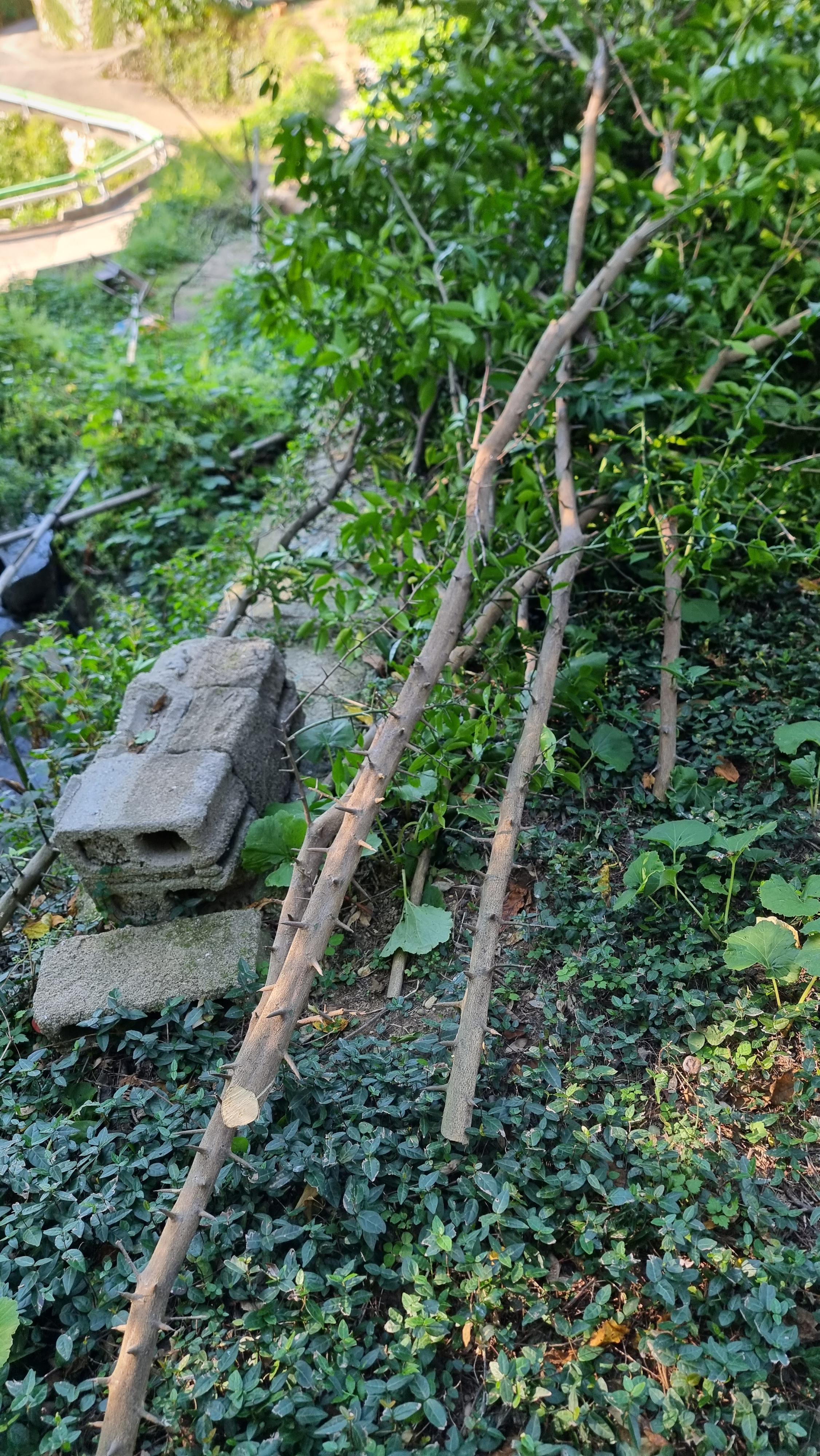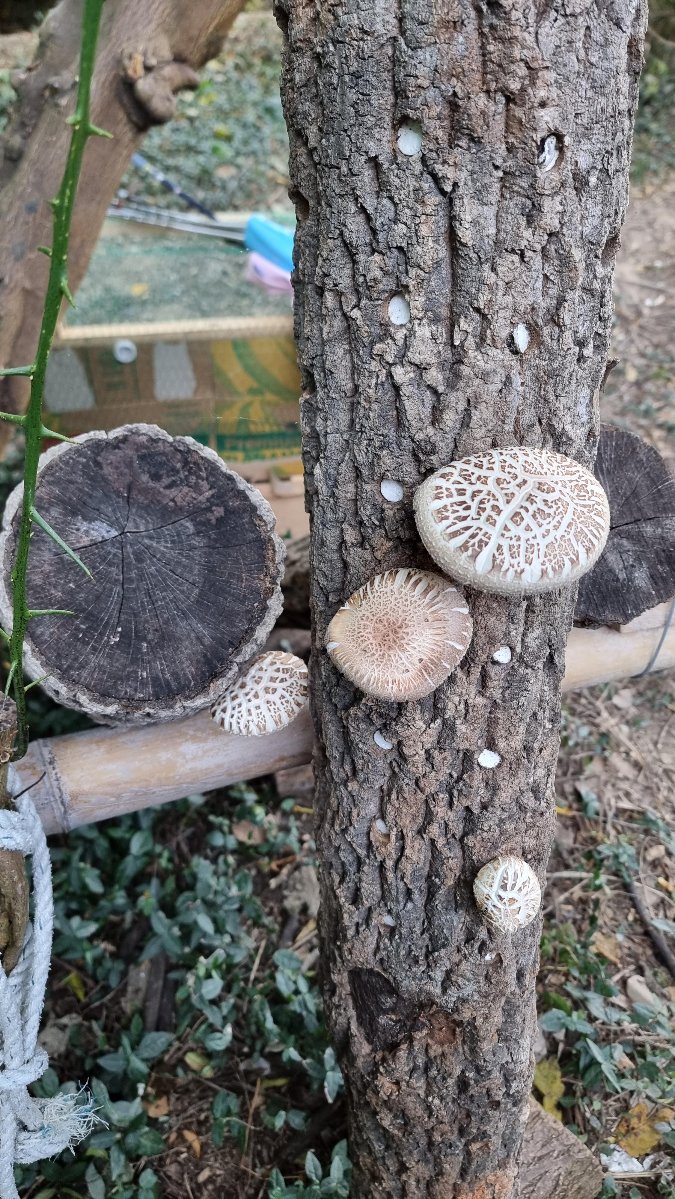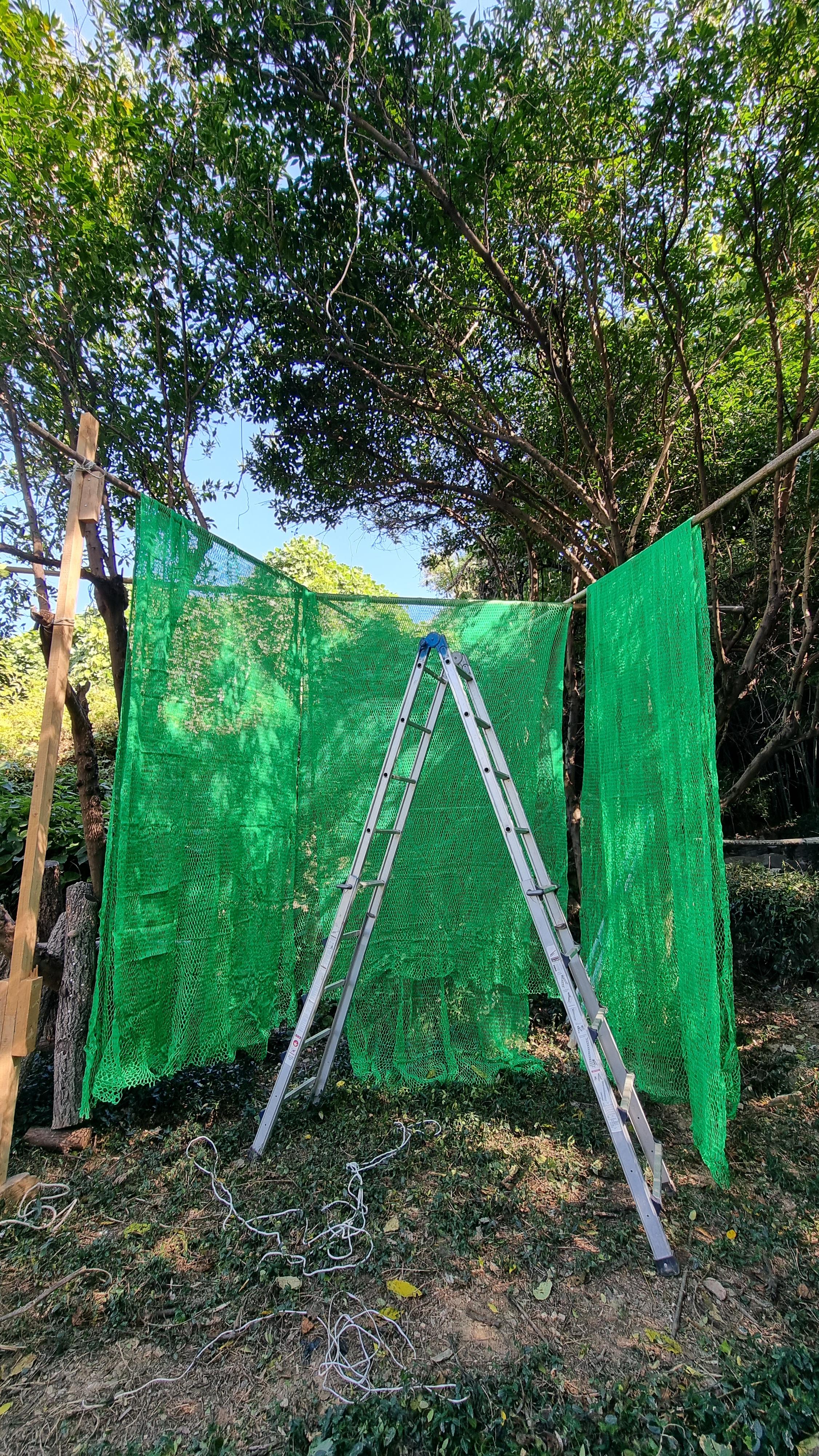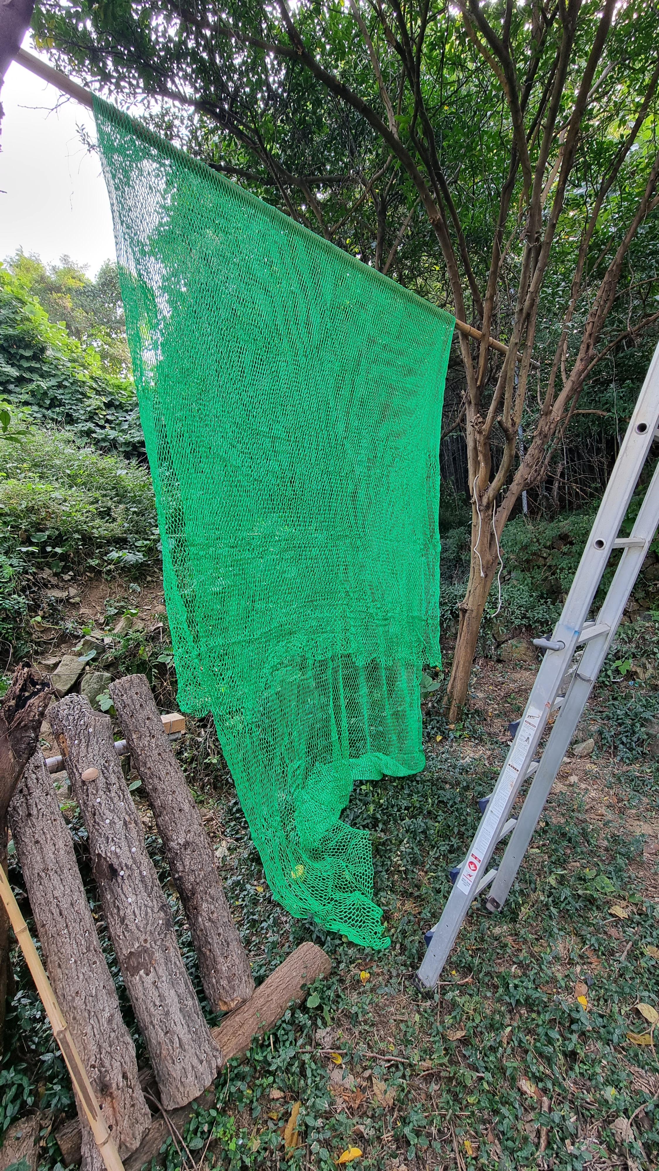 - 아무튼 우여곡절을 겪으면서 대나무 지지대를 설치하고 그 위에 그물을 얹어서 널어 뜨리고 밧줄로 이음새를 엮어 놓았다. 유자나무 밑에 있던 표고목도 옆으로 옮겼는데, 표고버섯이 몇 개 달려 있었다. 이제 위쪽에 대나무를 걸치고 고정시킨 뒤 그물망을 얹어 뒤쪽으로 널어 뜨린 뒤 양 가쪽으로 밧줄로 엮으면 끝이 난다.