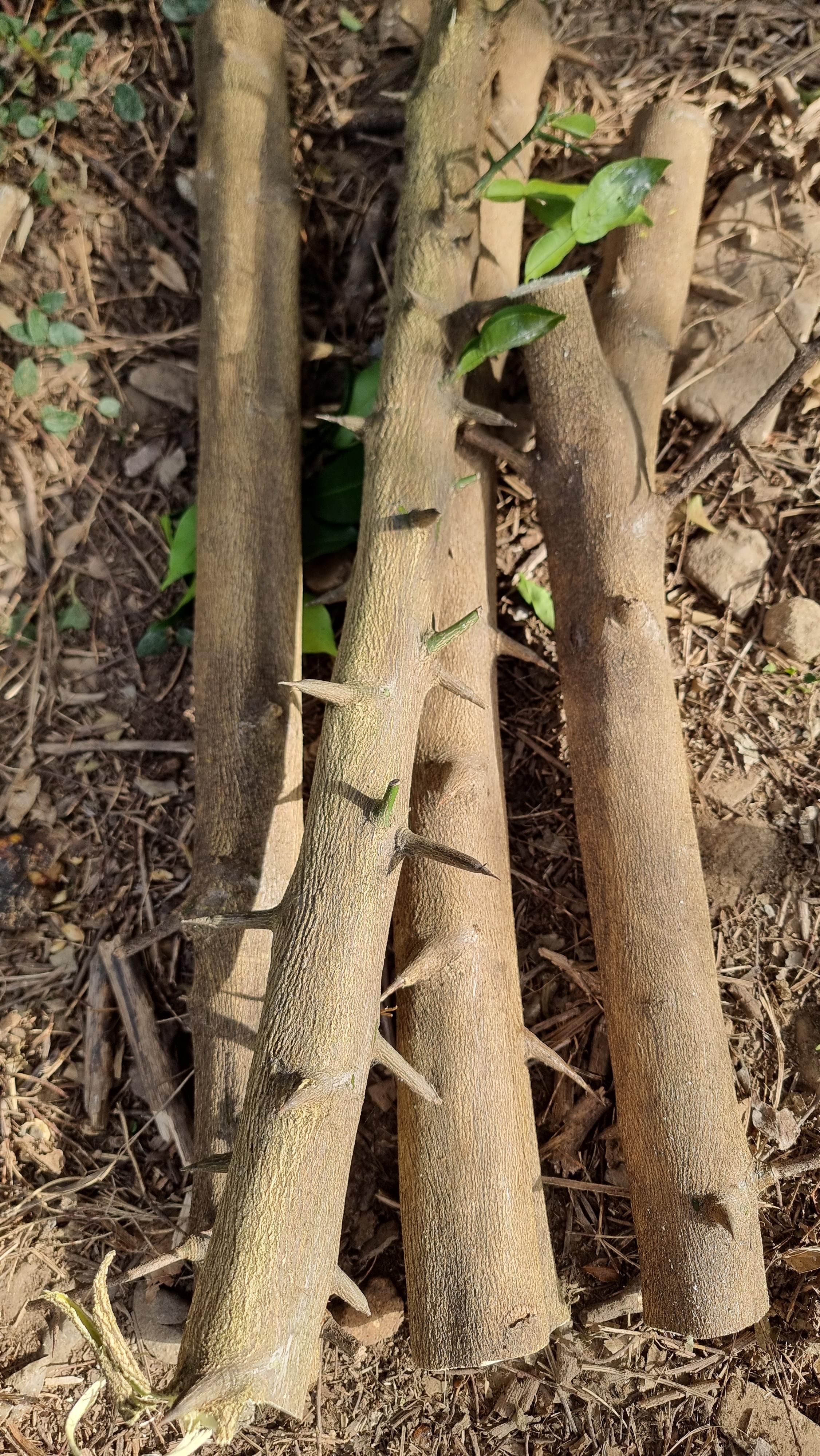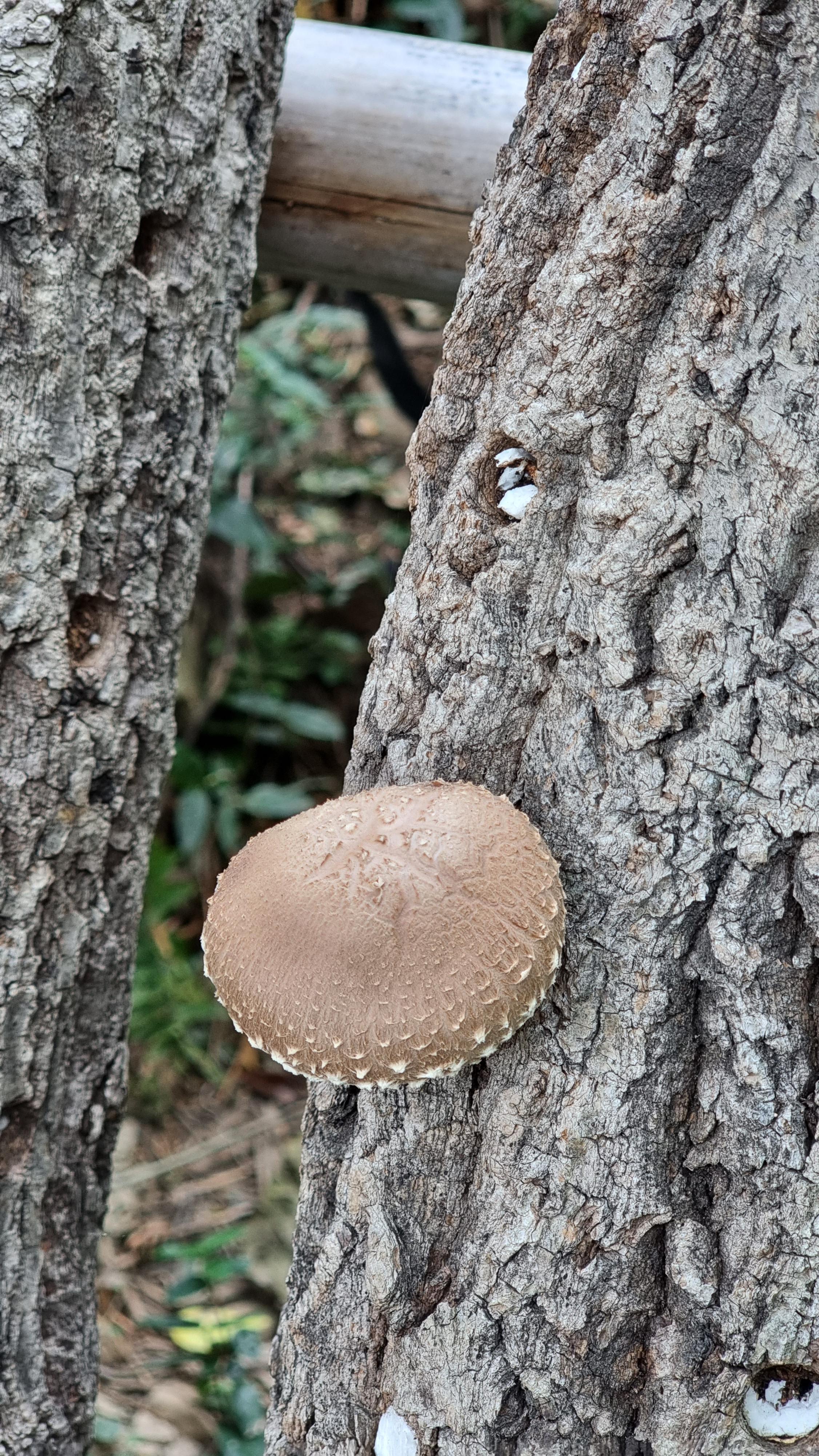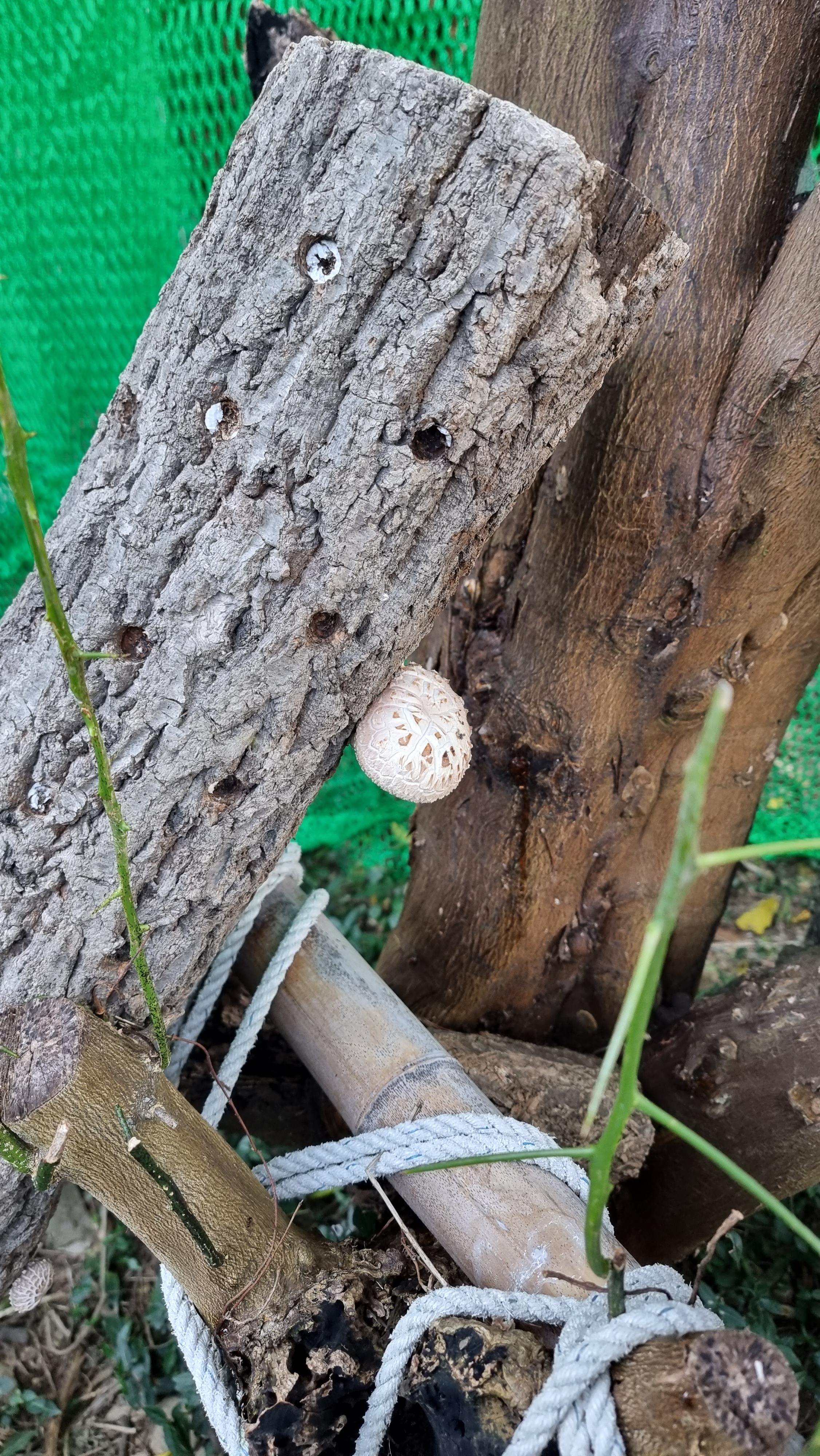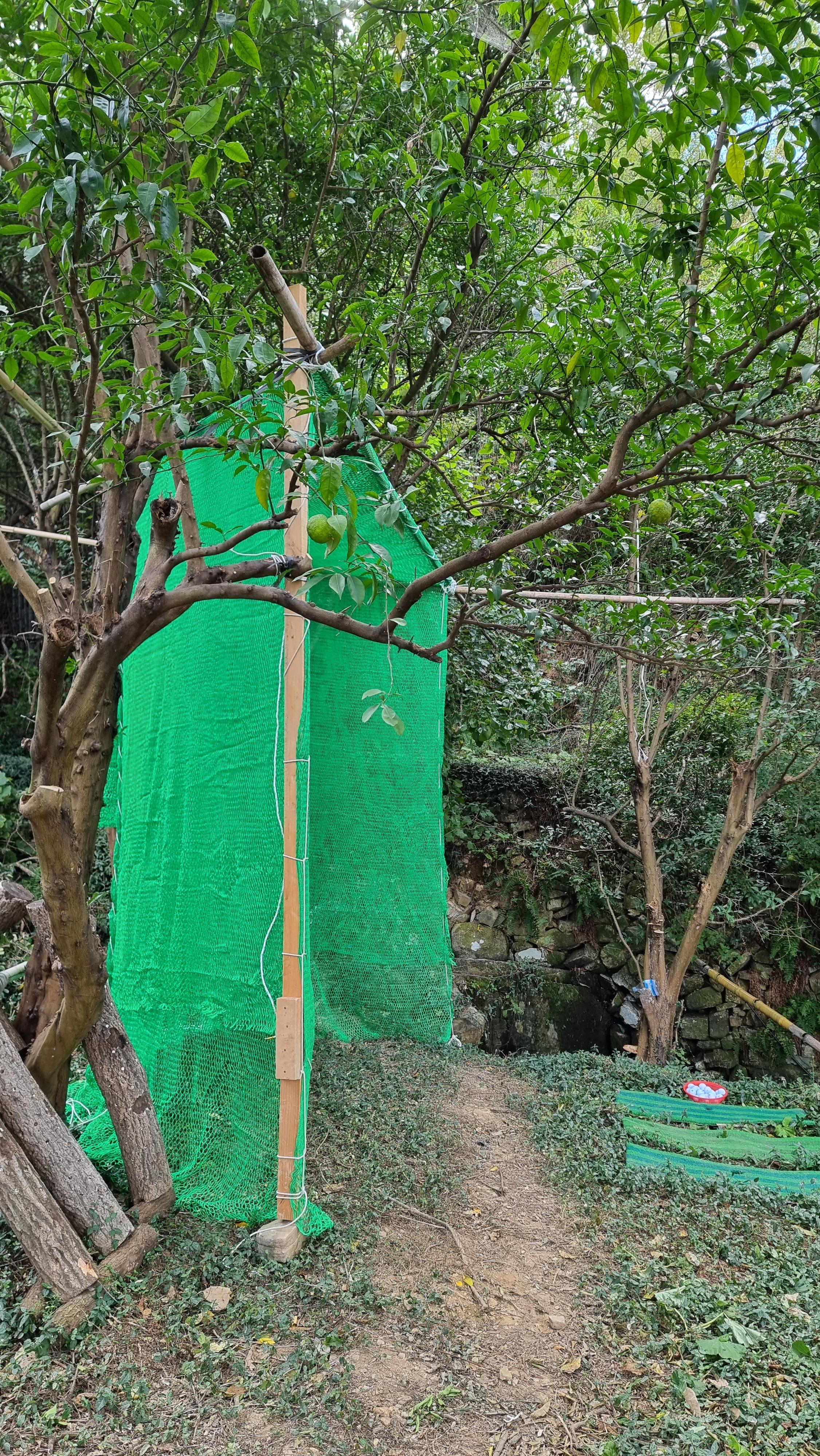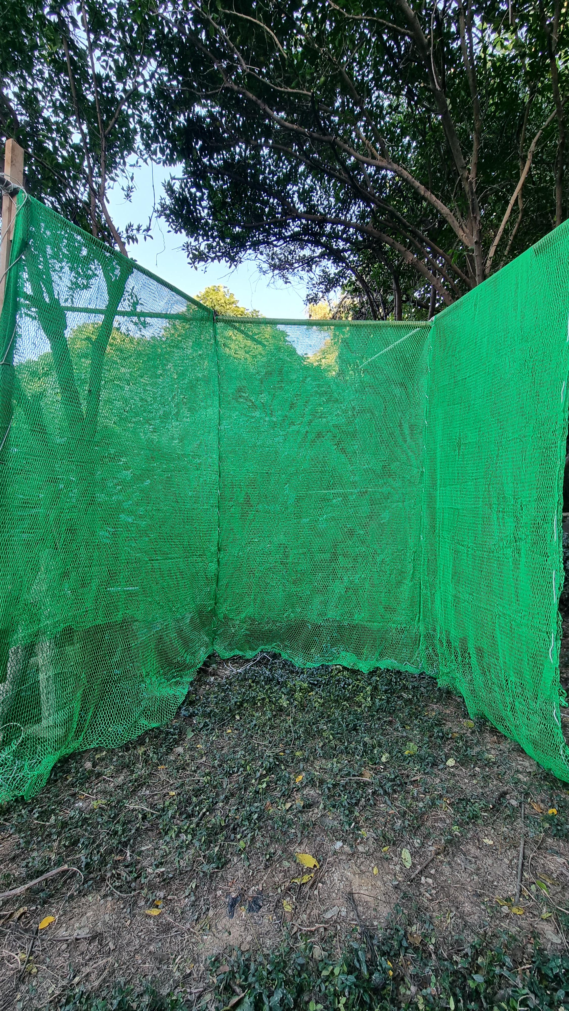 - 아무튼 우여곡절을 겪으면서 대나무 지지대를 설치하고 그 위에 그물을 얹어서 널어 뜨리고 밧줄로 이음새를 엮어 놓았다. 유자나무 밑에 있던 표고목도 옆으로 옮겼는데, 표고버섯이 몇 개 달려 있었다. 이제 위쪽에 대나무를 걸치고 고정시킨 뒤 그물망을 얹어 뒤쪽으로 널어 뜨린 뒤 양 가쪽으로 밧줄로 엮으면 끝이 난다.