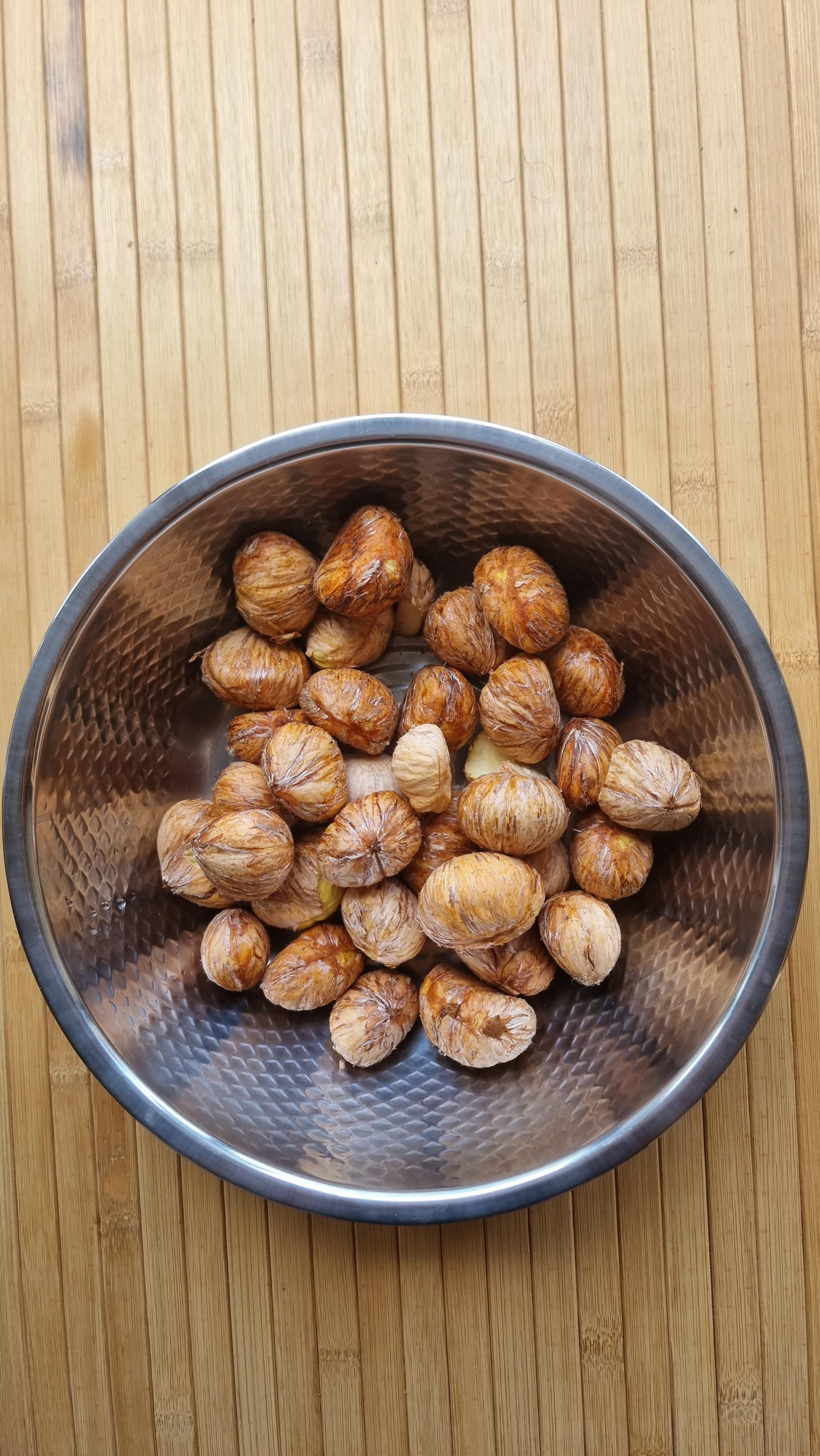 - 오늘 점심은 밤 잔치다. 점심을 지을 때 알밤 두 개, 바깥 껍질만 깐 것 세 개, 알밤을 반으로 자른 것 두 개, 완전히 깐 것 세 개 등 10개를 넣었다. 어떤 게 더 맛있는지를 알아보기 위해서인데, 먹어보니 알밤을 반으로 자른 것이 좋았던 것 같다. 그것이 적당한 물기를 머금고 있어서 그런 듯 했는데, 완전히 깐 것과 바깥 껍질을 깐 것은 물기가 많아 물컹한 느낌이었고, 반대로 완전한 알밤은 너무 타박한 느낌이라서 그런 듯하다.