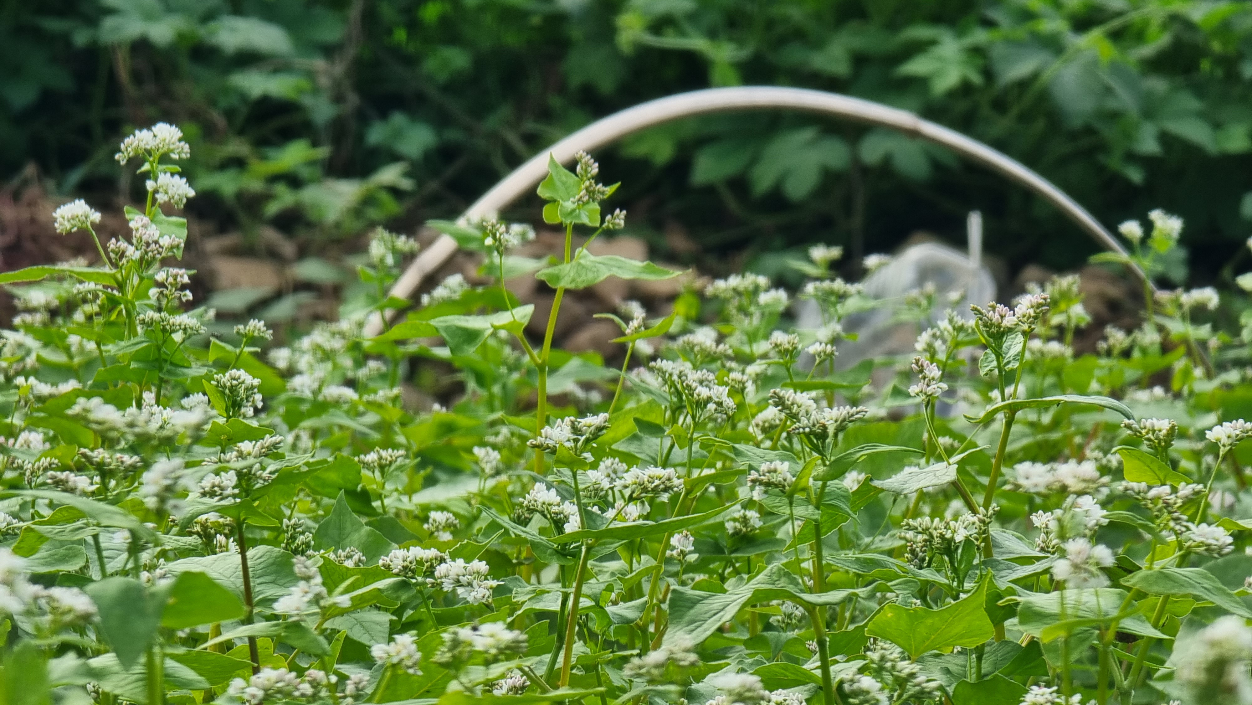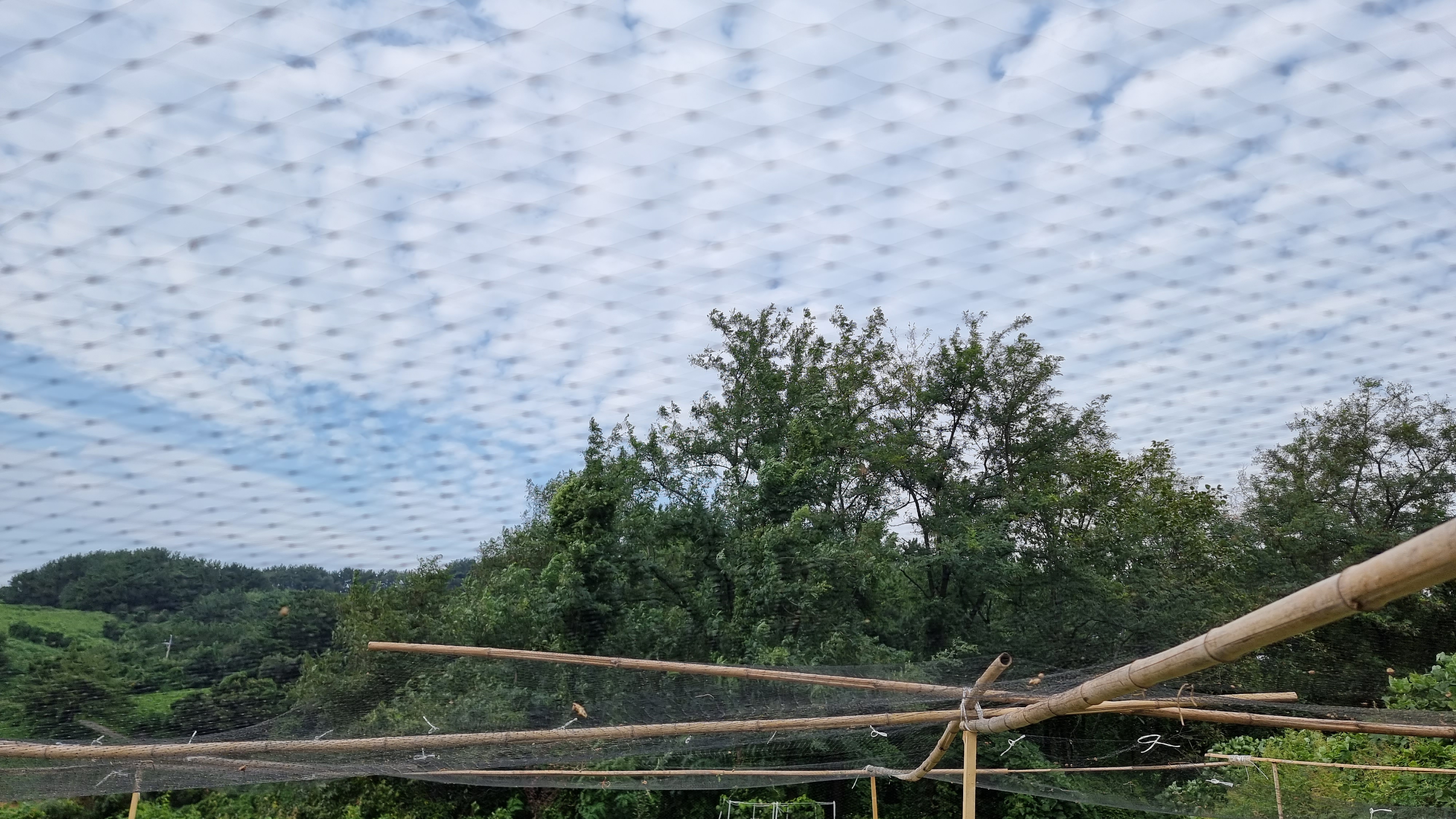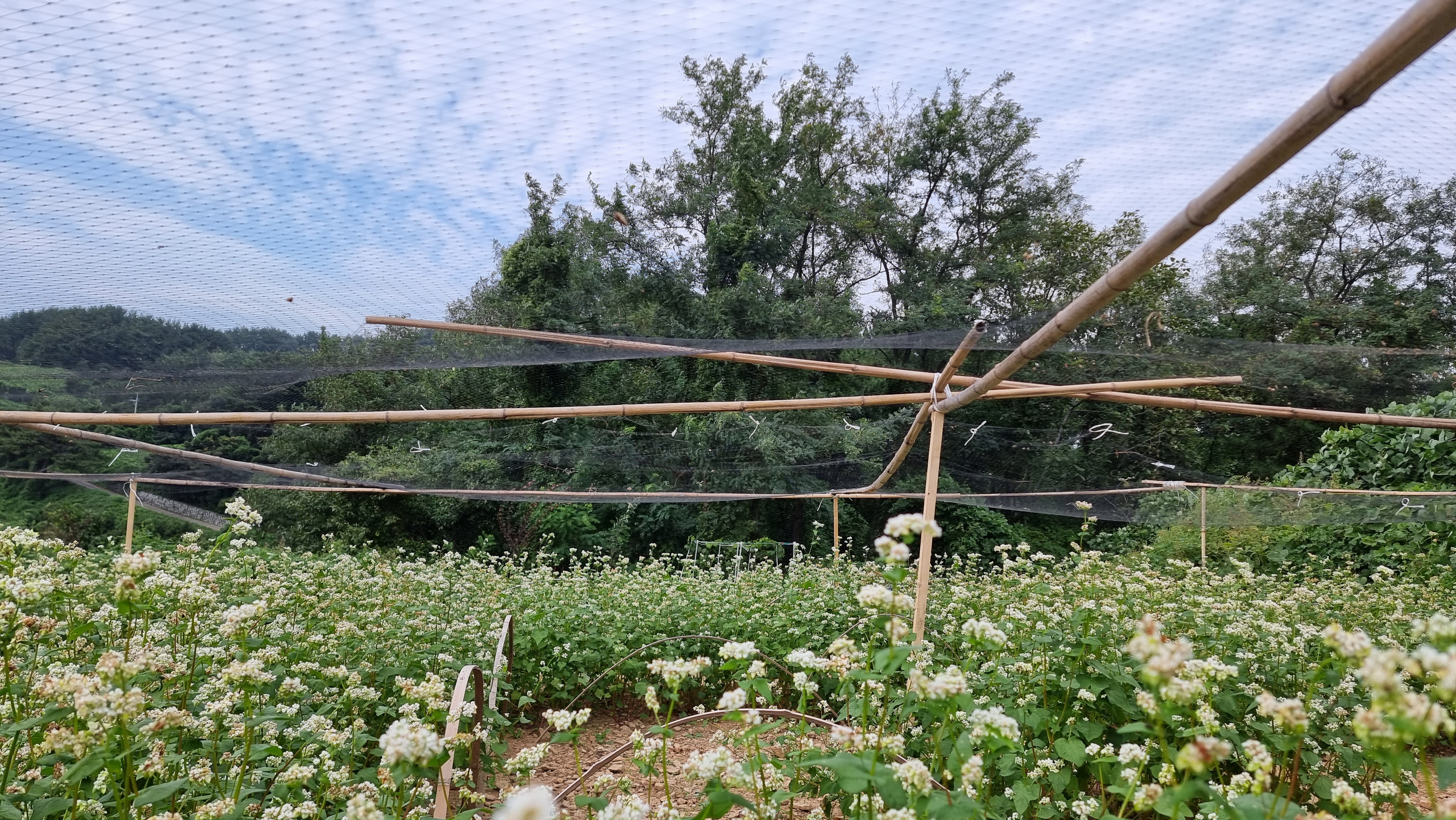 - 오늘 아침도 밤과 땅콩을 넣어서 지어 먹었다. 아침을 먹고 바로 집 뒤 메밀 밭에 새 방지망 설치 준비를 시작했는데, 메밀이 이제 열매를 맺기 시작했기 때문이다. 씨앗을 파종했을 때는 낮게 새 방지 그물을 설치하면 되기 때문에 별로 어려운 점은 없었지만, 이미 훌쩍 자란 메밀 위에 새 방지 그물을 치기 위해서는 지지대를 높이 설치해야 하기 때문에 쉬운 일이 아니다. 먼저 긴 말뚝을 땅에 박고, 이 집을 구입했을 때 앞집에서 확보해 놓은 대나무를 사용해 거치대를 만들었다. 그때 가져온 대나무들이 우리 집에 많은 역할을 한다.