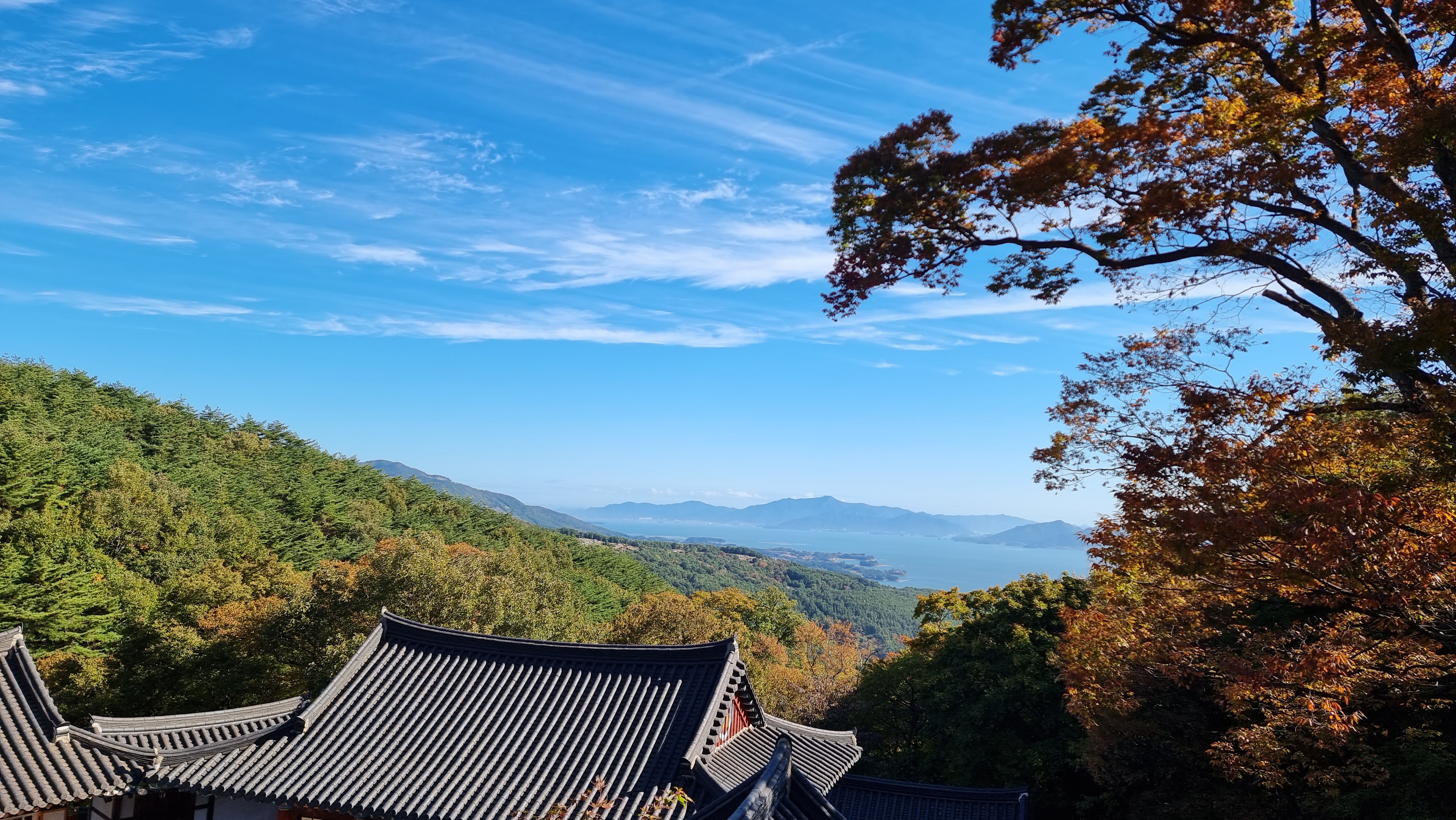 ☞ 남해 용문사는 신라 애장왕 때 창건된 절로 열 두명의 고승을 배출한 남해 최대의 사찰이란다. 이 절은 치마폭처럼 펼쳐진 앵강만 바다를 바라보는 남해읍 이동면의 호구산 (해발 560m) 기슭에 자리 잡고 있는데, 호구산은 북쪽과 남쪽에 각기 망운산과 금산을 마주 보는 산이란다. 호구산은 사실 망운산과 금산의 유명세에 가려 잘 알려지진 않았지만, 호젓하고 빼어난 아름다움으로 인해 남해군에서 군립공원으로 지정한 산이란다. 정상에 서면 북쪽으로 망운산을 넘어 하동 일대의 층첩한 산줄기와 광양 백운산, 그리고 멀리 지리산 줄기가 아스라이 보인단다. 남으로는 그림같은 앵강만의 풍경이 눈에 들어오고, 그 앞에는 서포 김만중이 유배되어 사씨남정기를 집필하였던 노도가 보인단다. 또한 동쪽으로는 보리암을 품고 있는 금산과 멀리 통영, 거제도에 이르기까지 그리고 창선도와 위로는 사천, 고성의 해안마을과 내륙의 풍경들이 보이고 서쪽 여수반도 쪽으로는 여천 석유화학단지나 거대한 광양제철의 인공섬 금호도의 다소 생경한 풍경이 시야에 들어온단다.