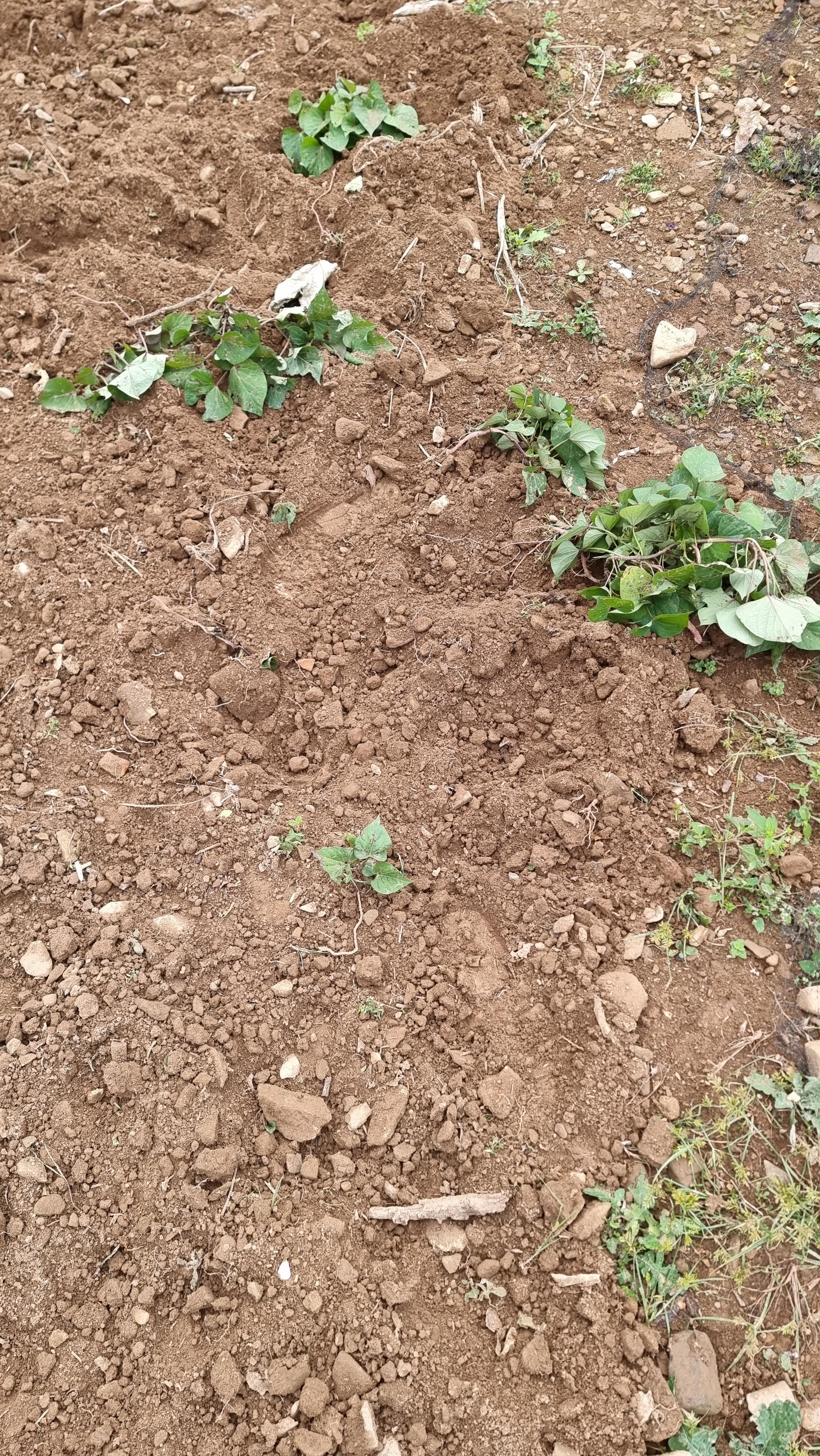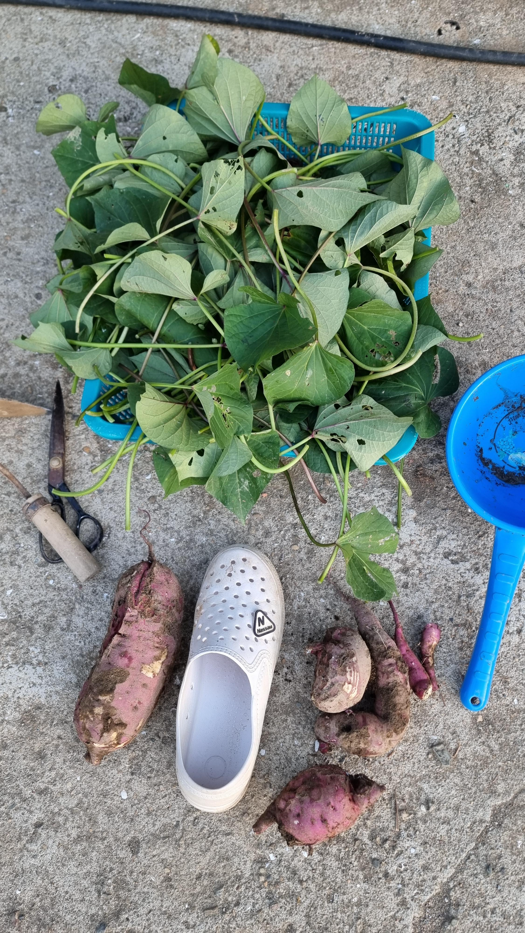 - 고구마 한 개를 캐 봤다. 고구마는 5월 중순 쯤 집 뒤 밭에 모종 20개 정도를 심었고, 집 앞 채소밭에 4개를 심었다. 뒷 밭에 심은 고구마는 두 차례에 걸쳐 멧돼지의 소행으로 추정되는 일로 한 개도 얻지 못했다. 집 앞 밭에 심은 고구마는 온전하게 자랐다. 그 중 오늘 한 개를 캤다. 고구마 한 개는 신 발 만하게 크다. 고구마 줄기도 땄다. 그것을 삶아 말려 놓으면 나중에 반찬으로 유용하단다. 하루에 한 개씩 캘까한다. 또 그기서 줄기도 따고....