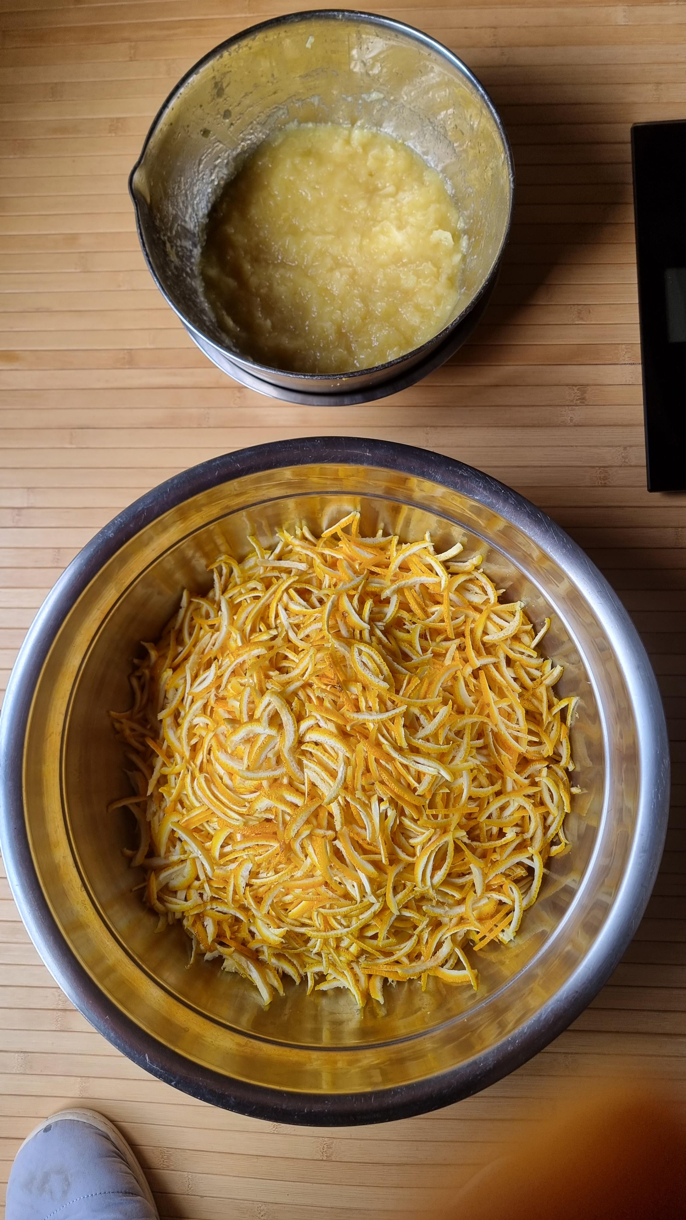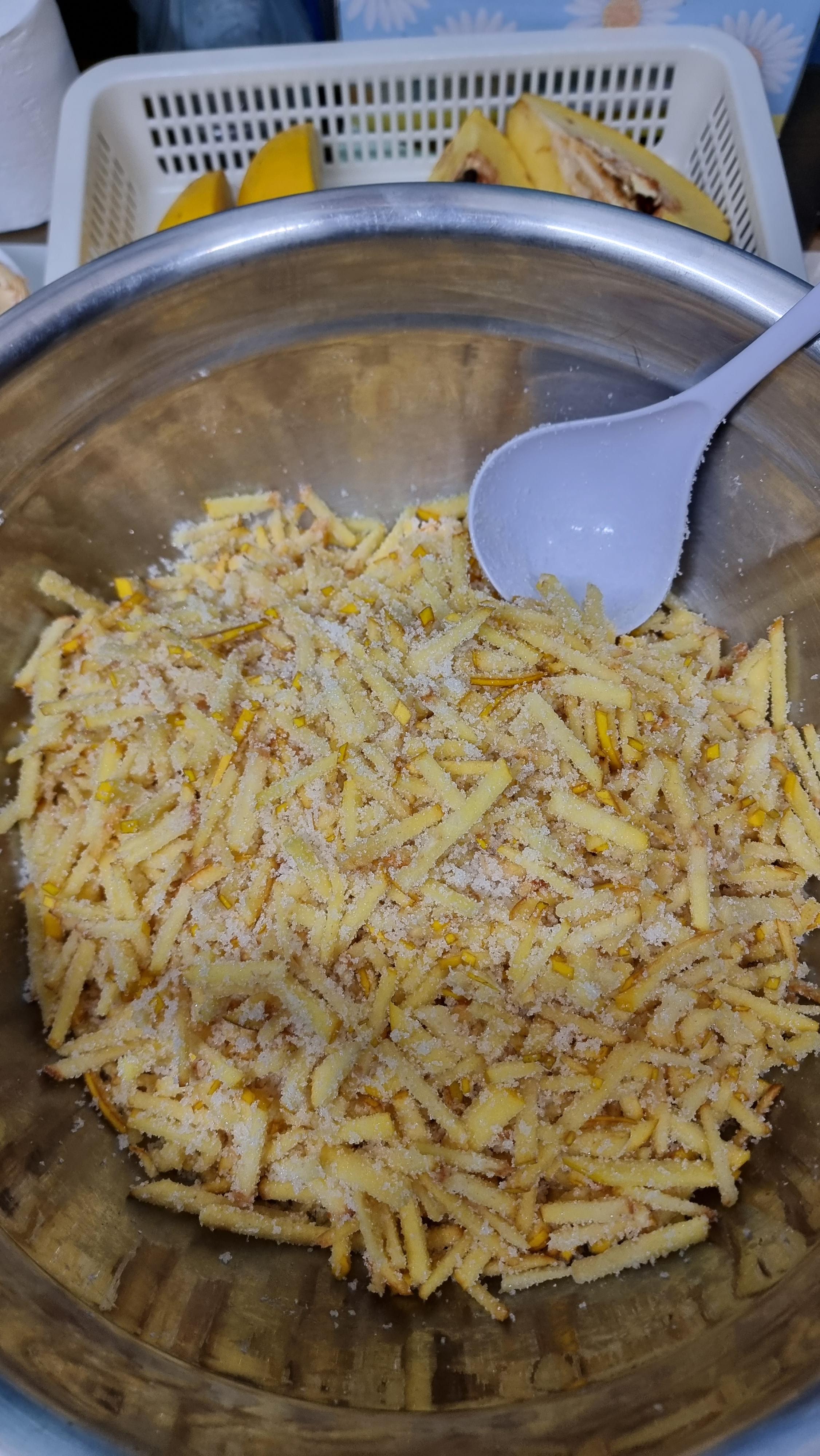 8. 채로 썬 유자 껍질과 믹서기로 간 유자 속을 같이 섞은 후, 이들과 설탕을 1:1로 넣고 골고루 섞는다.