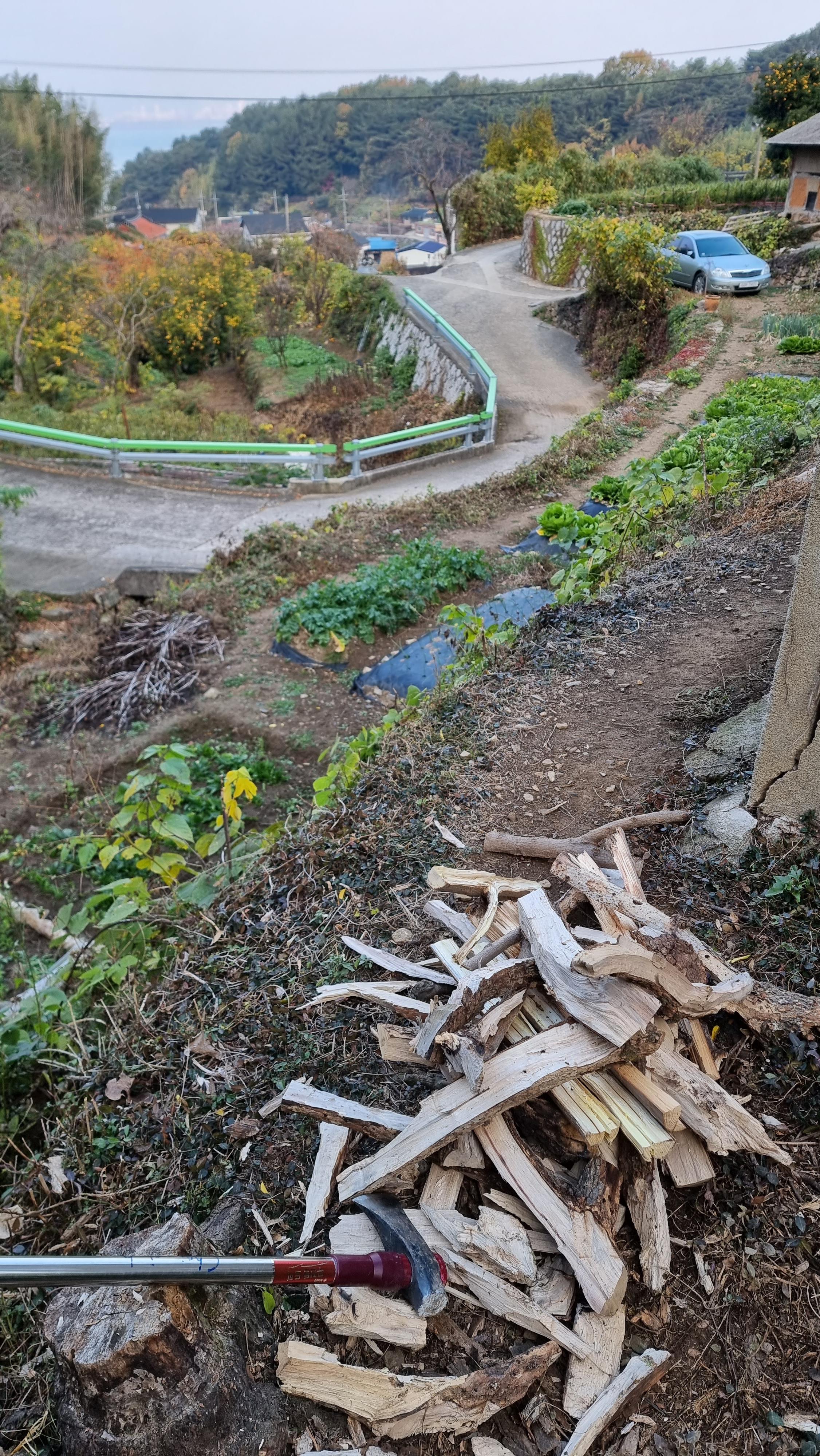 ▣ 2022.11.08. 화. 남해 - 장작 쪼개기, 배출 쓰레기 정리, 마늘, 시금치밭 물주기 등.