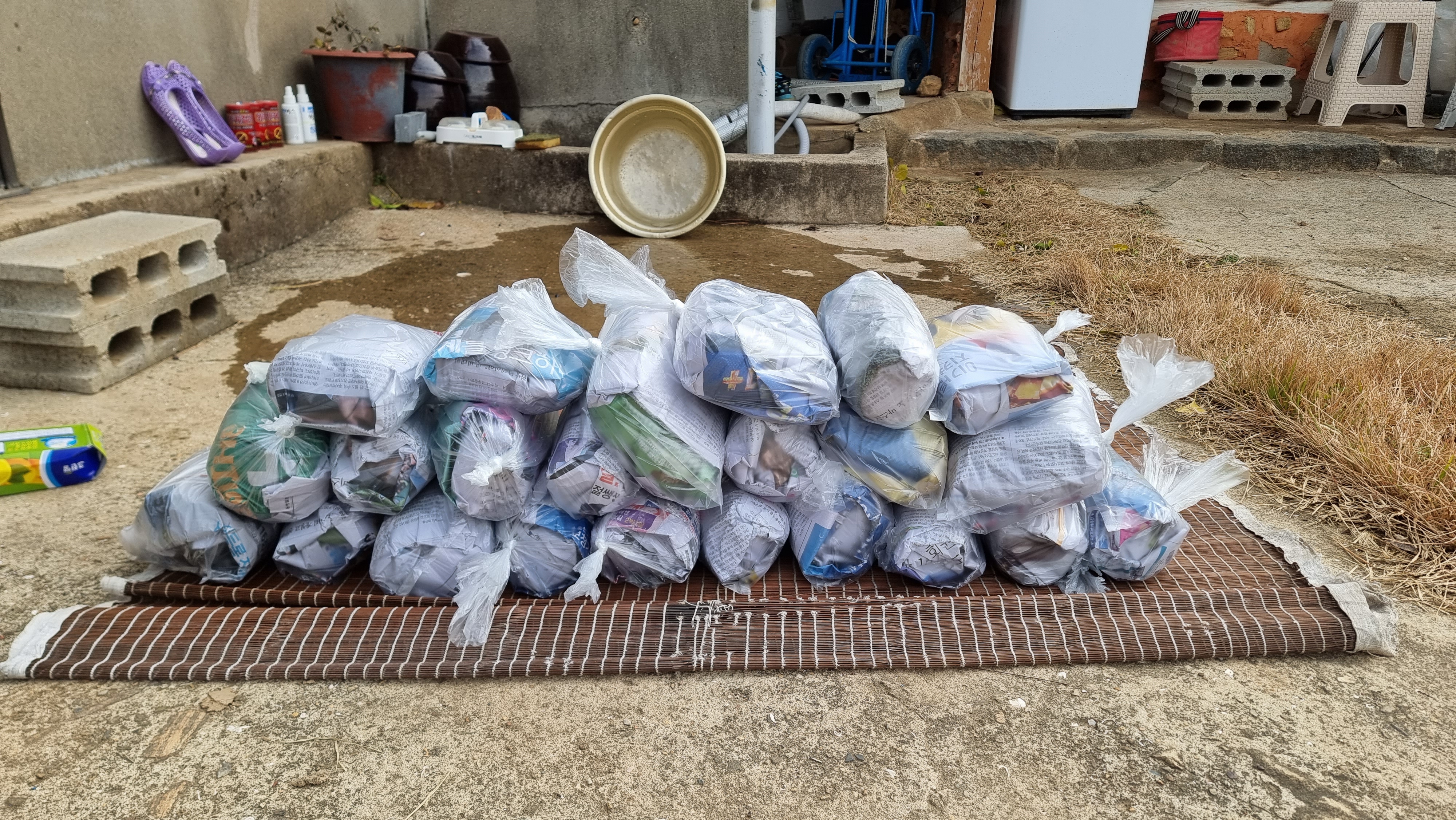 - 아침에 일어나자 마자 어제 저녁부터 새는 상수도를 뜯었다. 수도관이 파손되었거나 터진것은 아니었다. 용도는 잘 모르겠지만 수도 파이프에 뚫어 놓은 작은 구멍에서 물이 새고 있었다. 그래서 넓은 고무줄로 단단히 맨 후 테이프를 발라 더 이상 물이 새어 나오지 않게 조치했다. 완전한 마무리는 시간이 좀 걸릴 듯하다. 날씨가 추워 시멘트 양생 시간이 필요하고 수도 파이프를 고정하는 작업도 해야 한다. 빨래도 했다. 며칠 물이 나오지 않는 바람에 하지 못한 빨래를 해서 널었더니 엄청 많다.