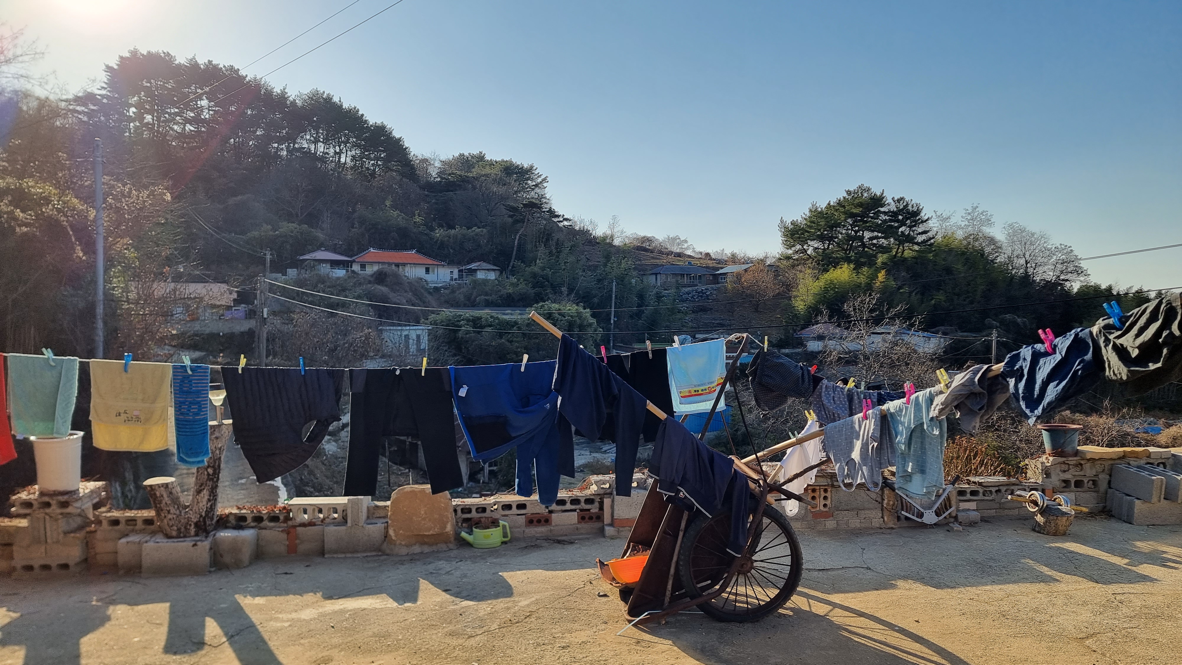 - 점심도 평소대로 해 먹었다. 어제 집에서 가져온 반찬들과 아침에 끓인 무우국과 함께 먹었다. 날씨가 춥긴해도 햇볕이 있어 빨래도 마르긴 마르나 보다. 저녁 때쯤 빨래 중 얇은 것들은 걷었고, 두꺼운 것들은 처마 밑으로 옮겼다. 내일 한 번 더 말려서 걷어야겠지.