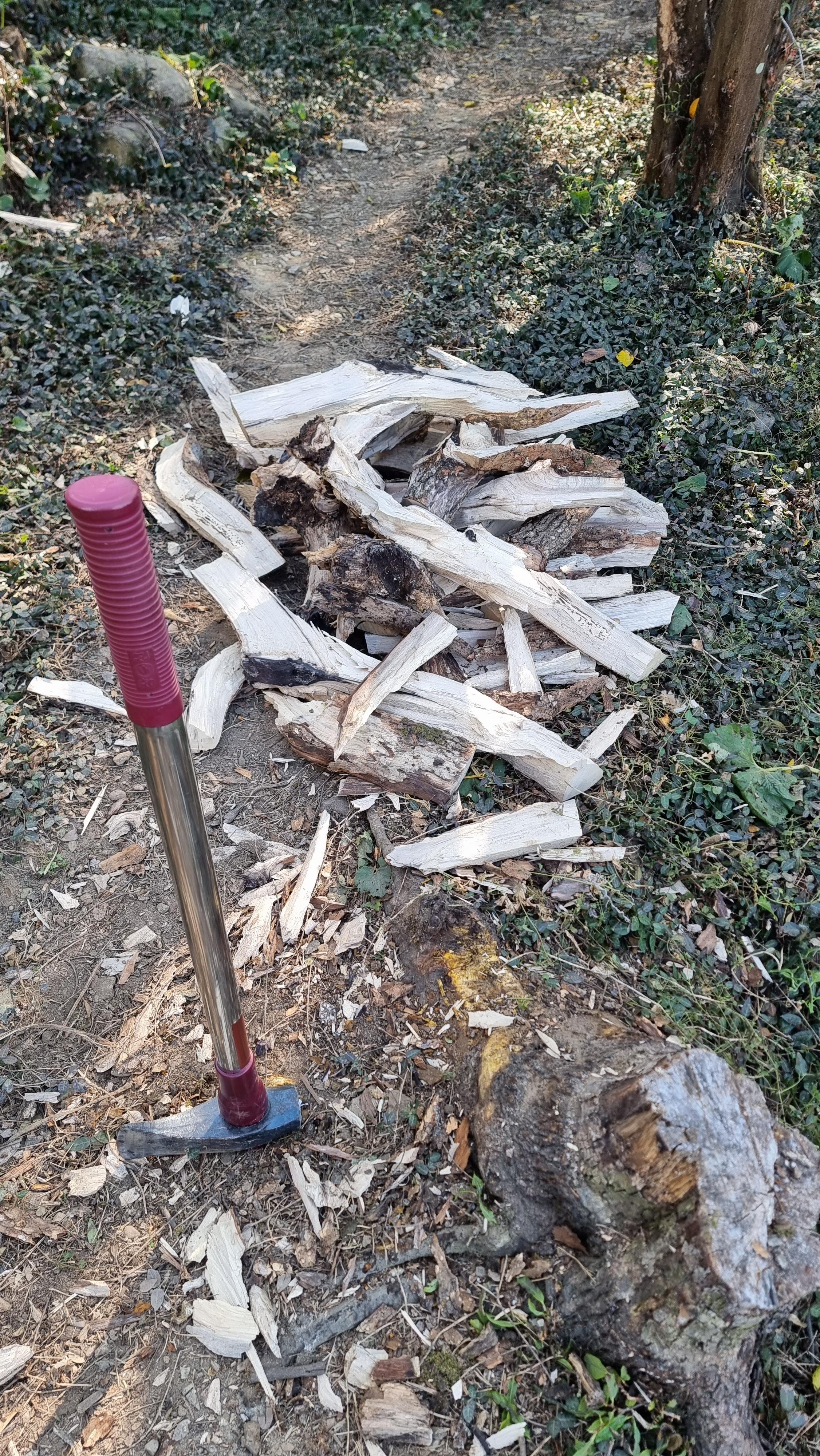 - 오늘 아침에는 평소와 같이 일정을 소화한 뒤, 감나무 장작을 팼다. 예전에 이 집에 커다란 감나무가 두 그루 있었던 모양인데 다 베어 놓았다. 이제 마른 상태가 되어 장작으로 쪼개어 올 겨울 추울 때 군불용으로 사용할 예정이다. 그외 이것저것 하다보니 오늘도 아침을 10시 정도에 먹었다.