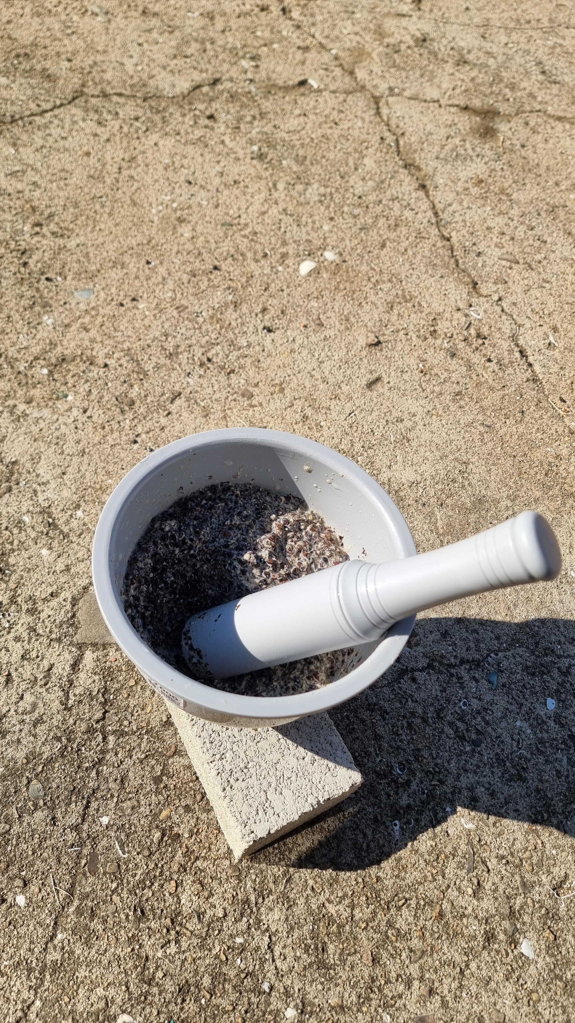 4. 메밀을 절구통에 넣어 빻는다.