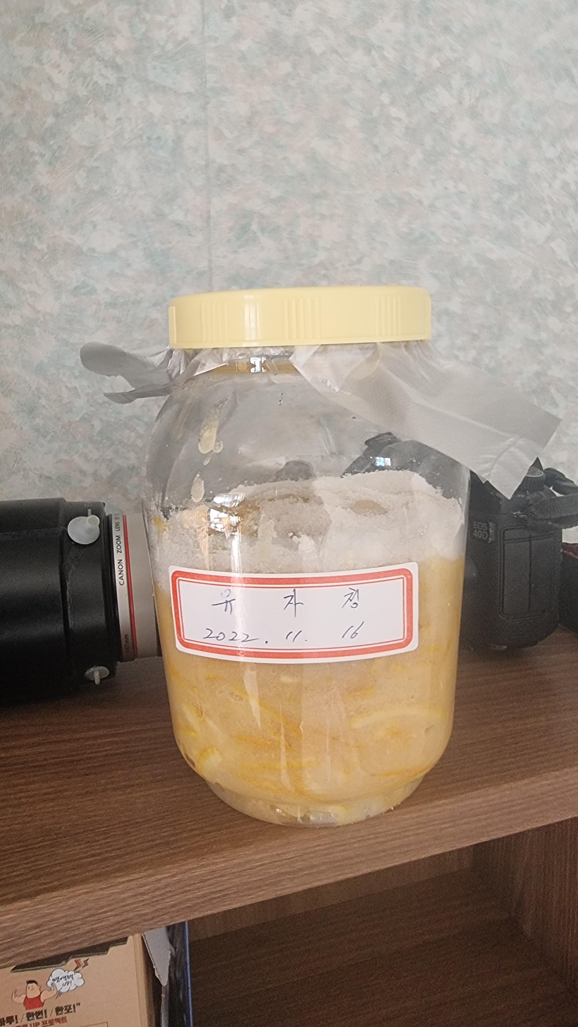 - 오늘 유자차를 처음 시식을 했는데, 우리집 유자를 따서 11월 16일에 내가 직접 담은 것이다. 유자속은 믹서기로 갈아서 채 썰은 유자껍질과 함께 섞어 만들었는데, 유자의 새콤한 맛과 향이 참으로 좋았다. 추울 때 가끔 마셔야겠다. 그때쯤 만들은 '모과'청은 좀 더 숙성시킨 뒤 맛 보아야겠다.