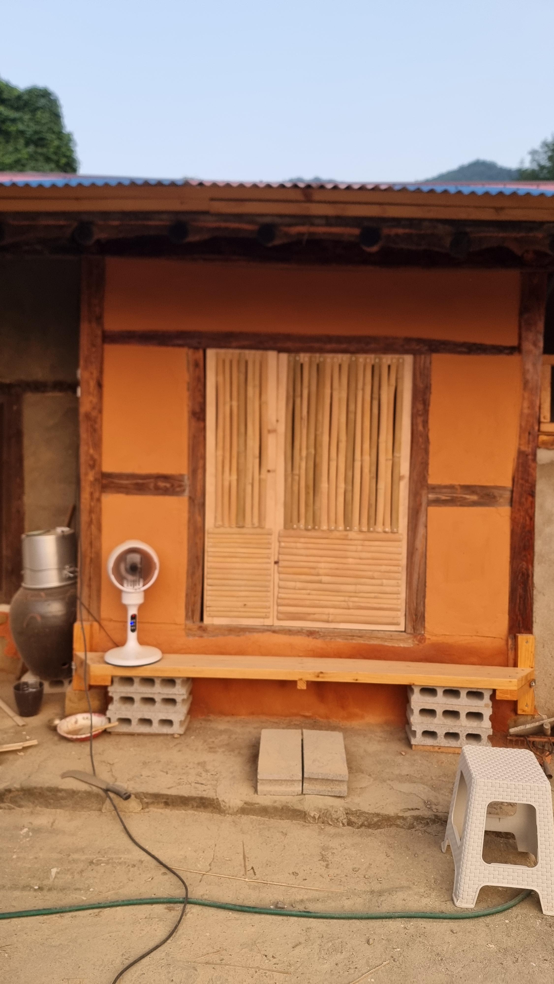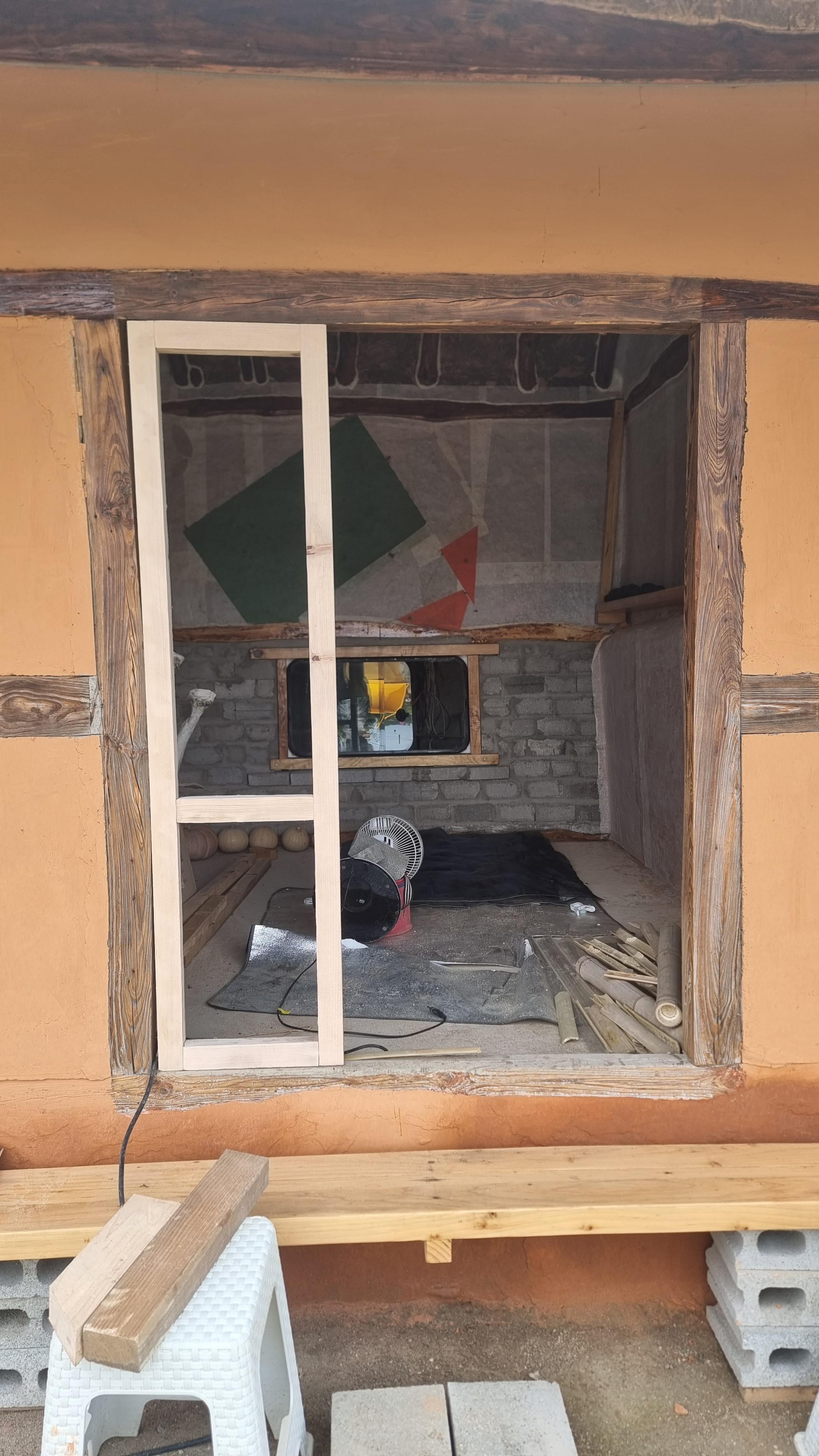 - 아침을 먹고는 어제 황토를 칠해 놓은 쉼터에 기둥과 벽이 맞닿은 곳에 한지를 꼬아서 바르고, 벽에서 흙이 떨어질 만한 곳에도 한지를 발랐다. 이 작업을 하는데도 오전 시간이 꼬박 갔다. 점심을 먹고도 바로 다실 도배 마무리 작업을 했었는데, 이제 도배는 다 했다. 오늘도 쉼없이 일을 했다. 이제 문을 구하는 일이 가장 어려울 듯하다.