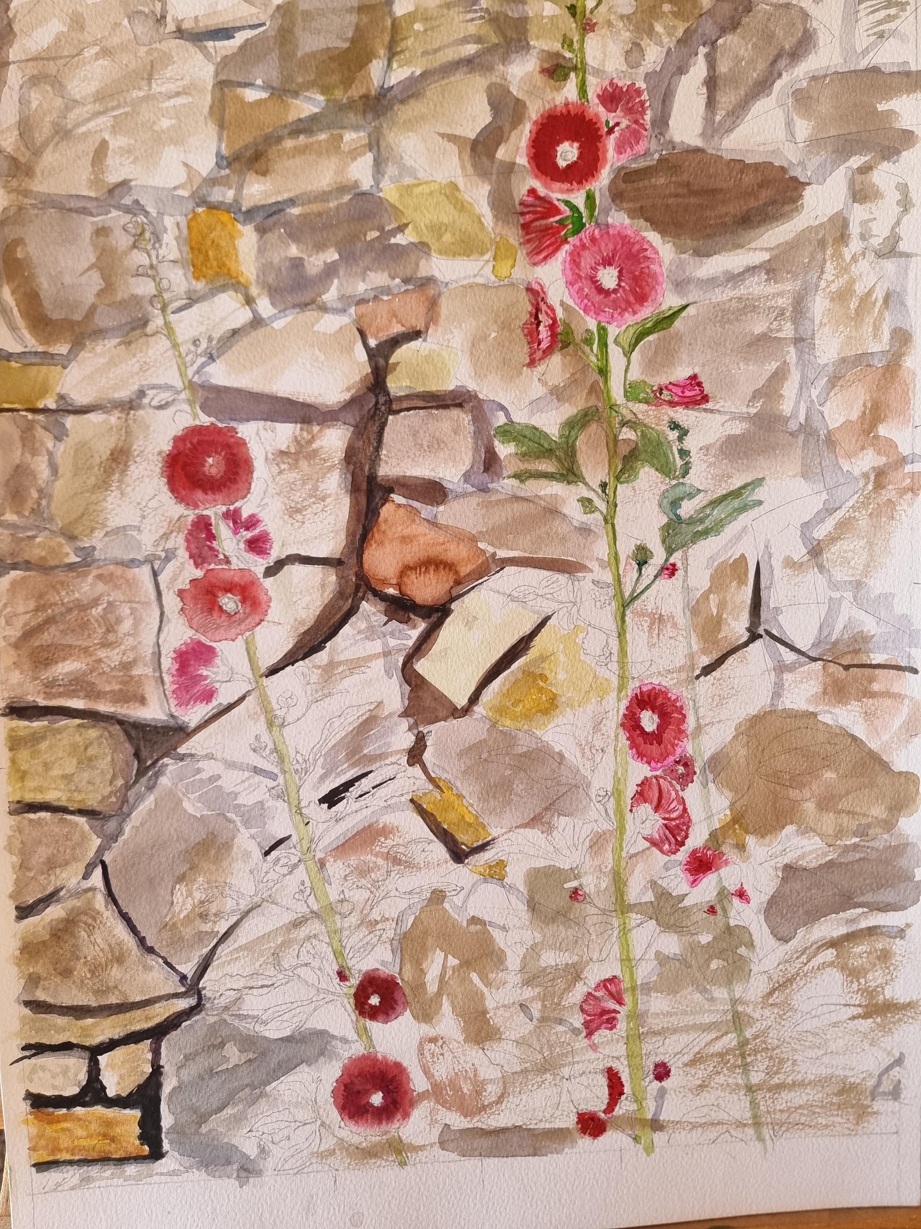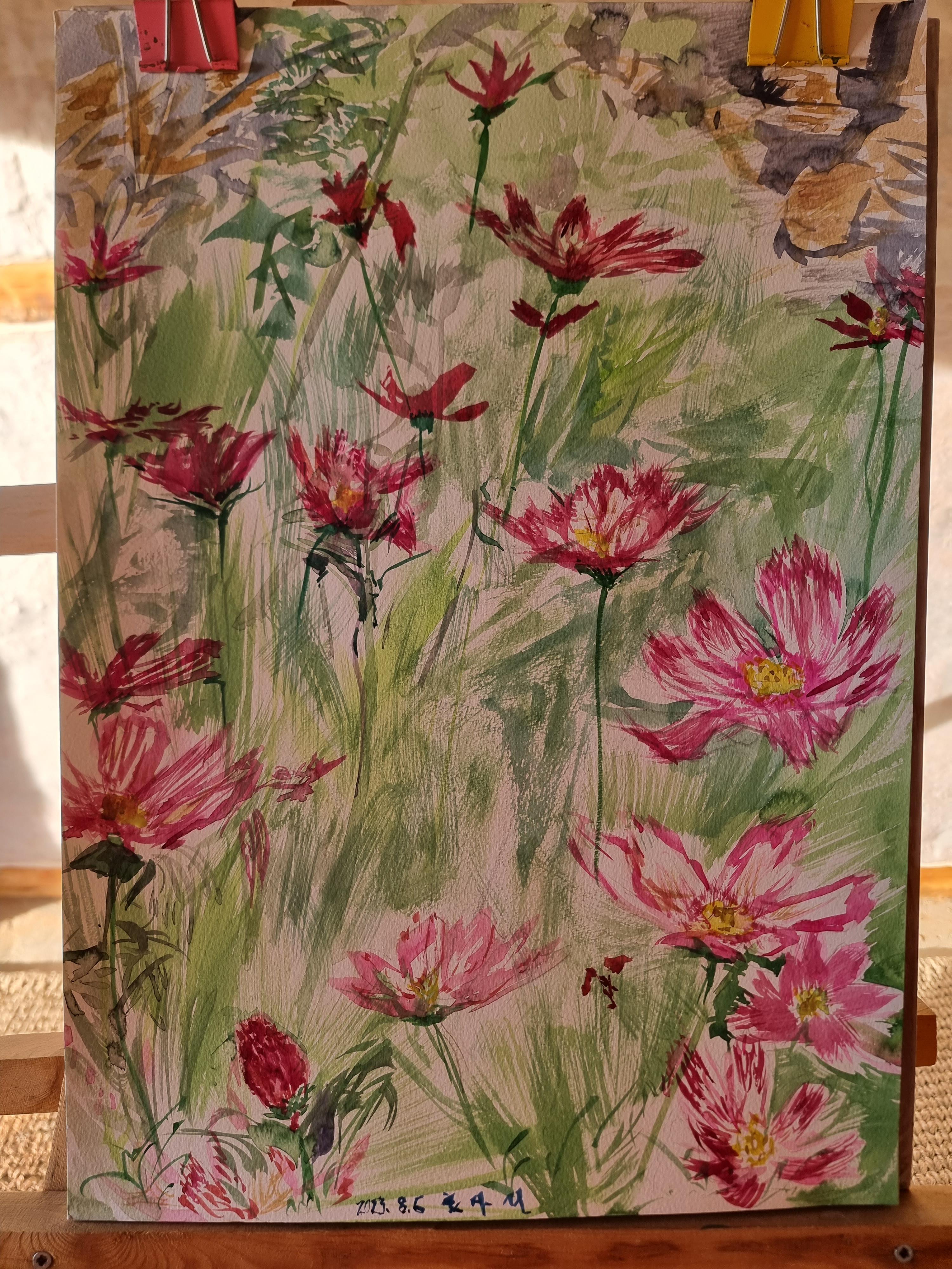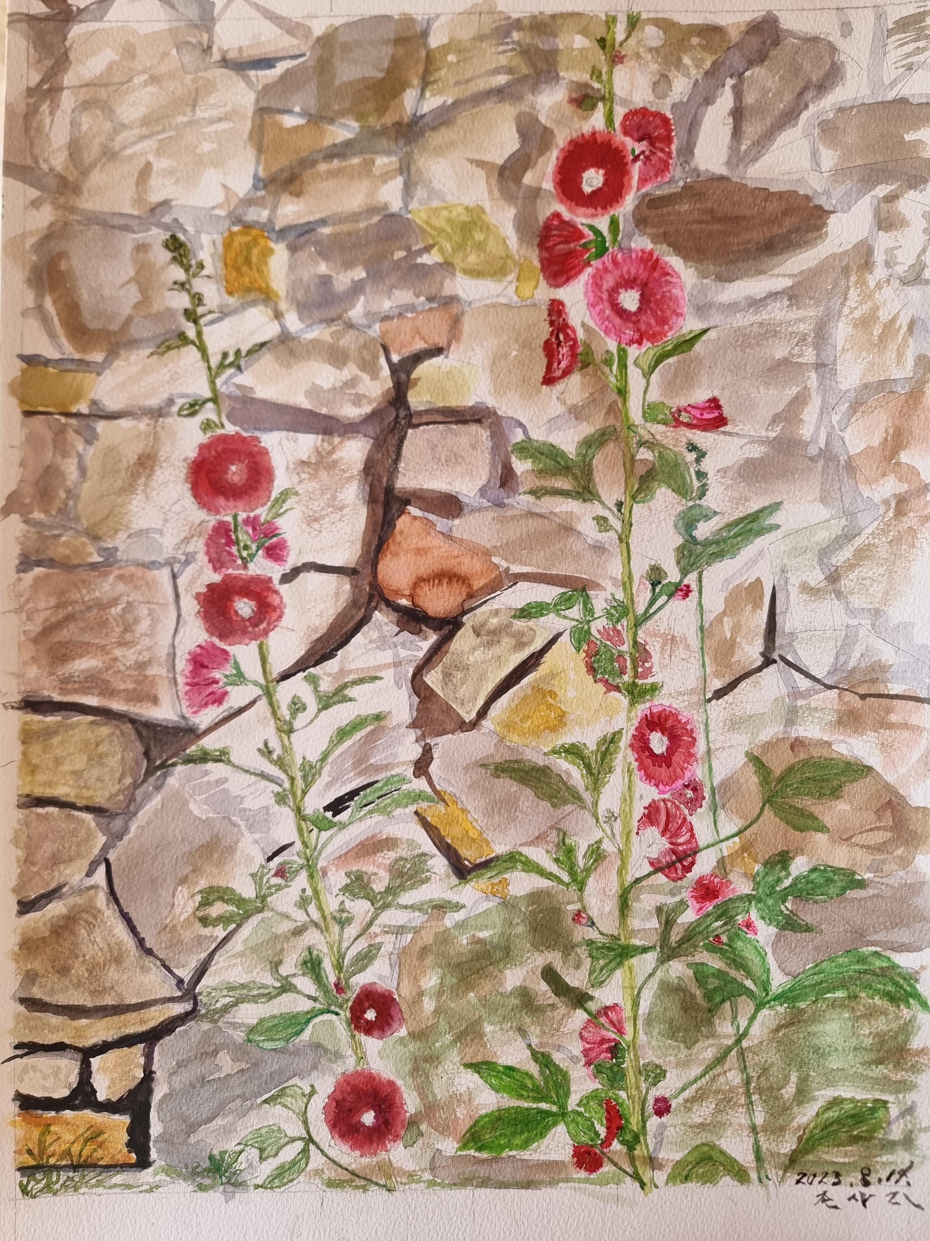 - 한창 더운 낮에는 그림 연습을 조금 했다. 우리집 돌담 밑에 핀 접시꽃 그림인데, 내가 보기에도 이상하다. 저녁 6시 쯤부터 다시 채소밭 일구기 작업을 했다. 땀을 팥죽같이 흘리는 힘든 일이다. 해질녘에는 마당에 널어 놓은 고추랑 참깨를 정리하는 일도 제법 시간이 걸린다. 또 하루가 간다.