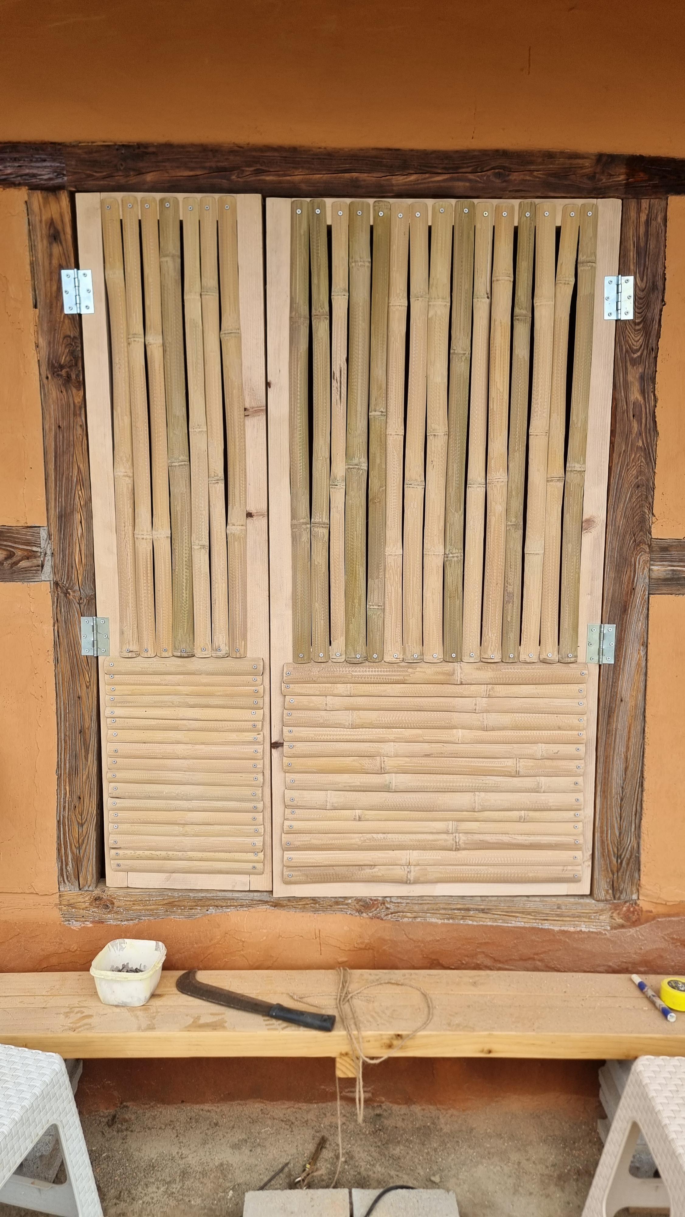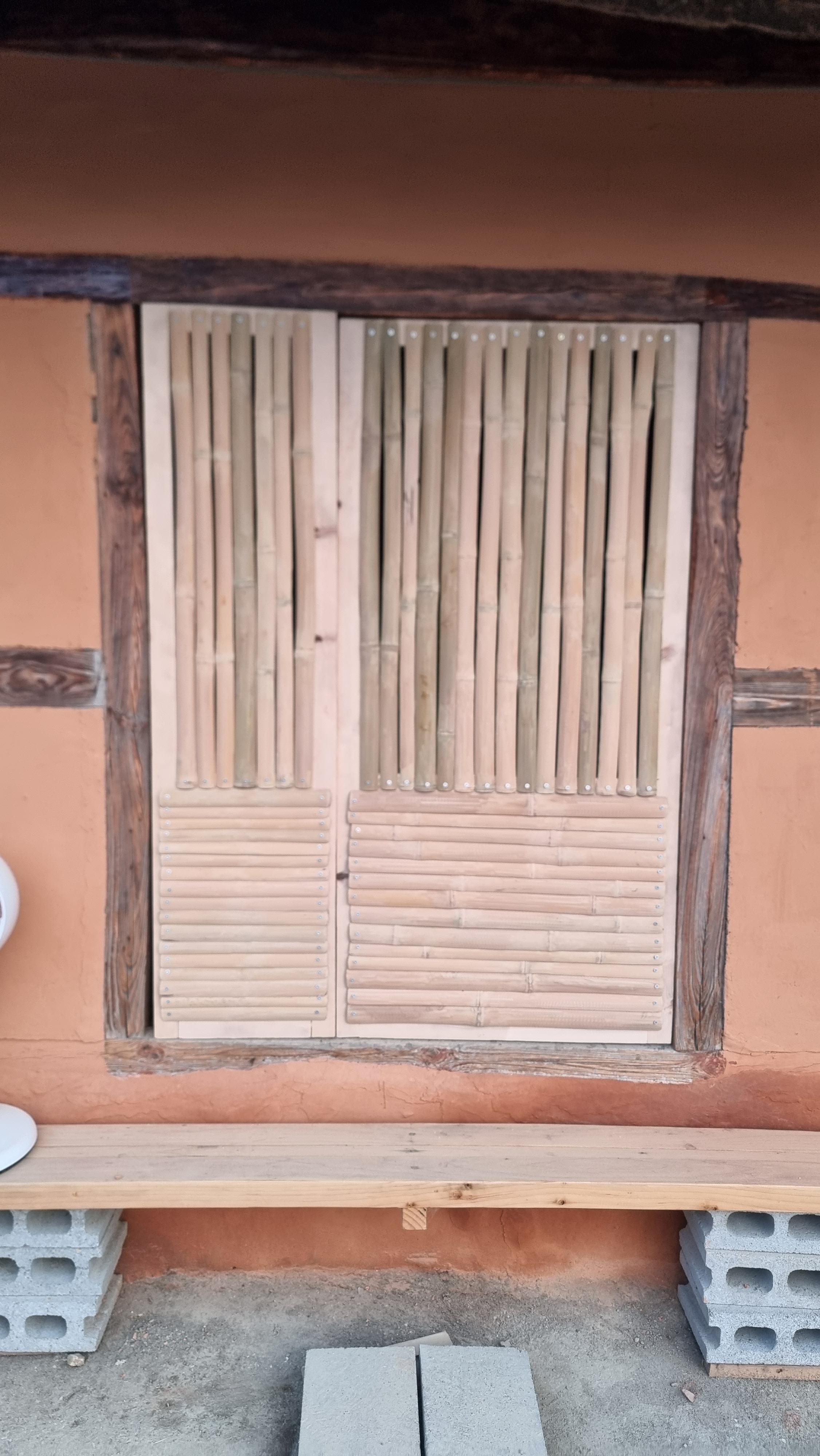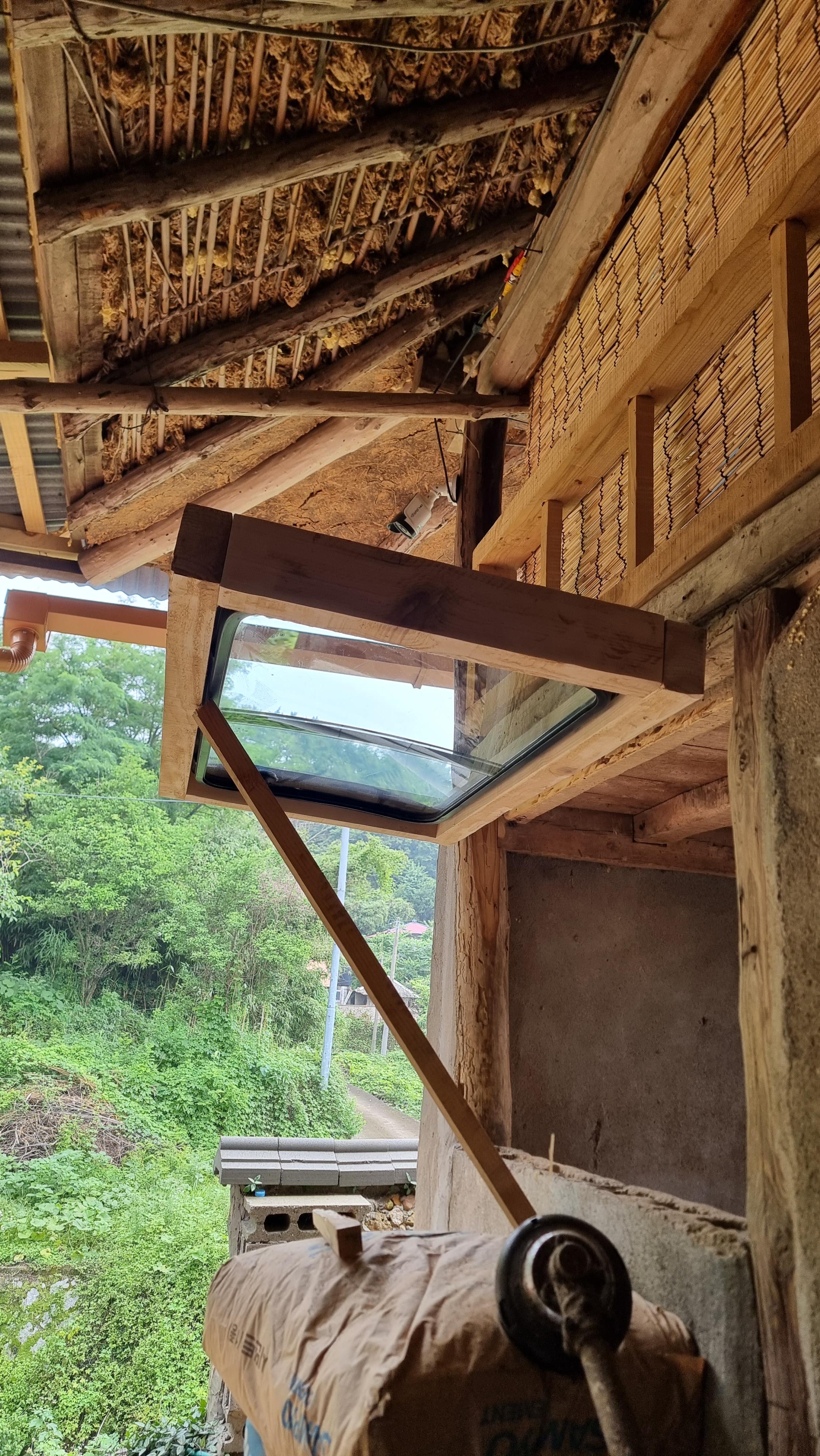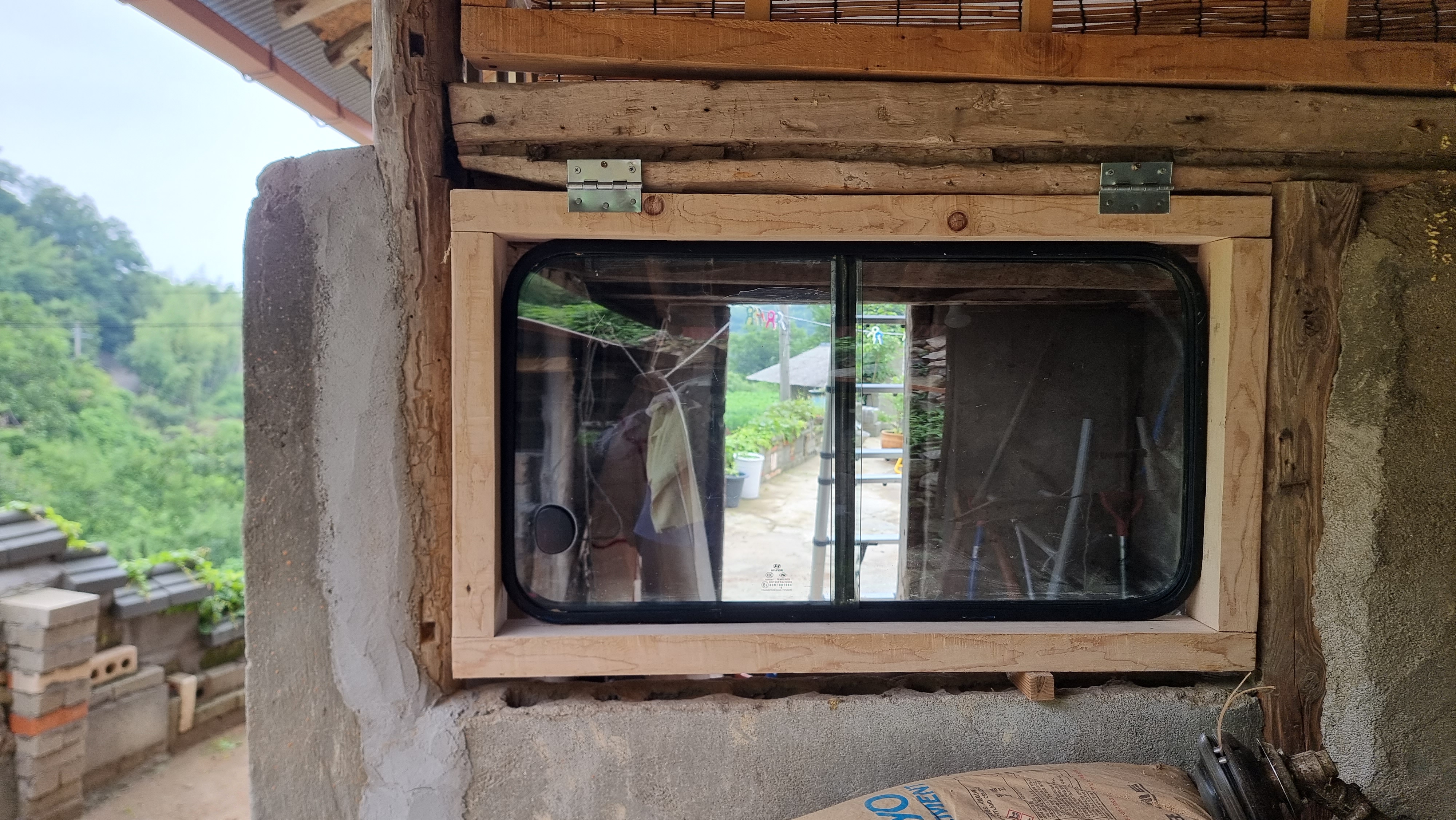 - 아침을 먹고는 어제 다실 뒷벽에 설치할 창틀을 만들었던 것과 똑같은 과정으로 창고 뒷벽에 창틀을 만들어 붙였다. 각목을 자르고, 그라인더로 각목을 갈고, 차문을 고정할 수 있게 홈을 파고, 그것들을 조립하여 못으로 고정시키고....그런데 창고 뒷 벽에 있던 공간이 차문과 어찌 그렇게 딱 맞을 수 있었을까? 희안한 우연이다. 오늘 설치한 창문은 차문 자체가 옆으로 열리지만, 창문 전체가 위로 열리도록 위쪽에 장석을 붙였다. 많은 환풍이 필요하거나 큰 물건들을 옮길 때도 용이할 듯하다.