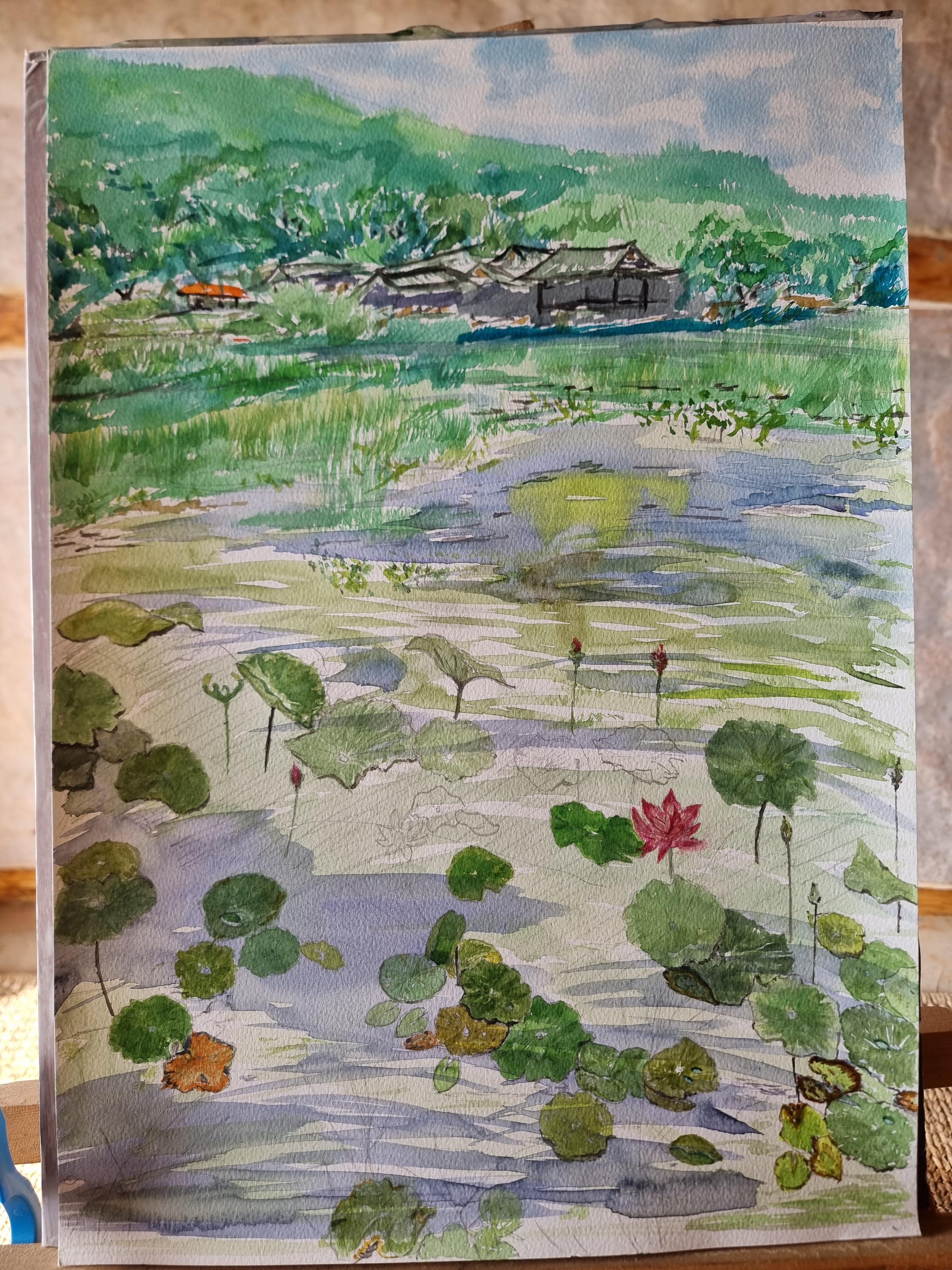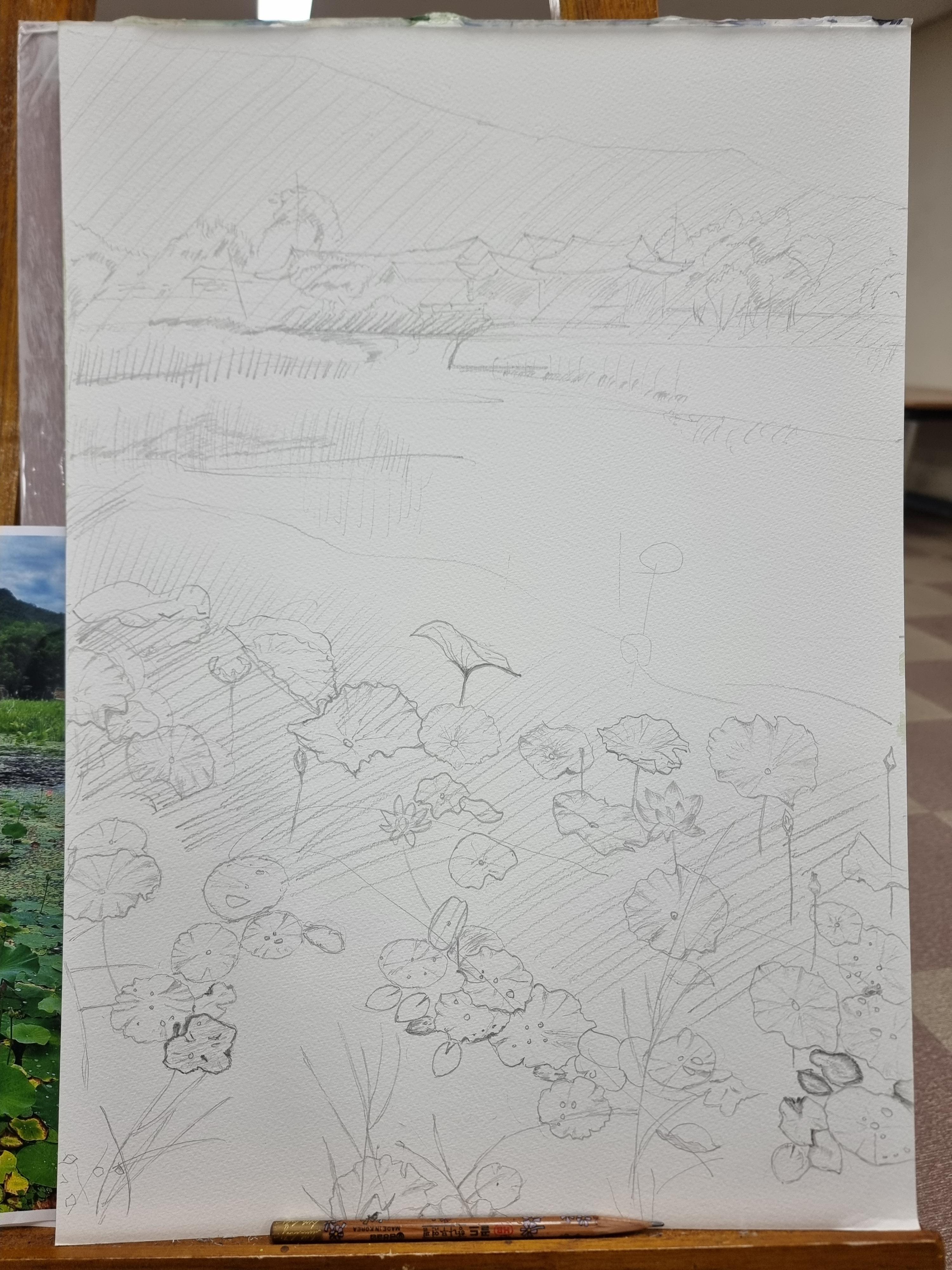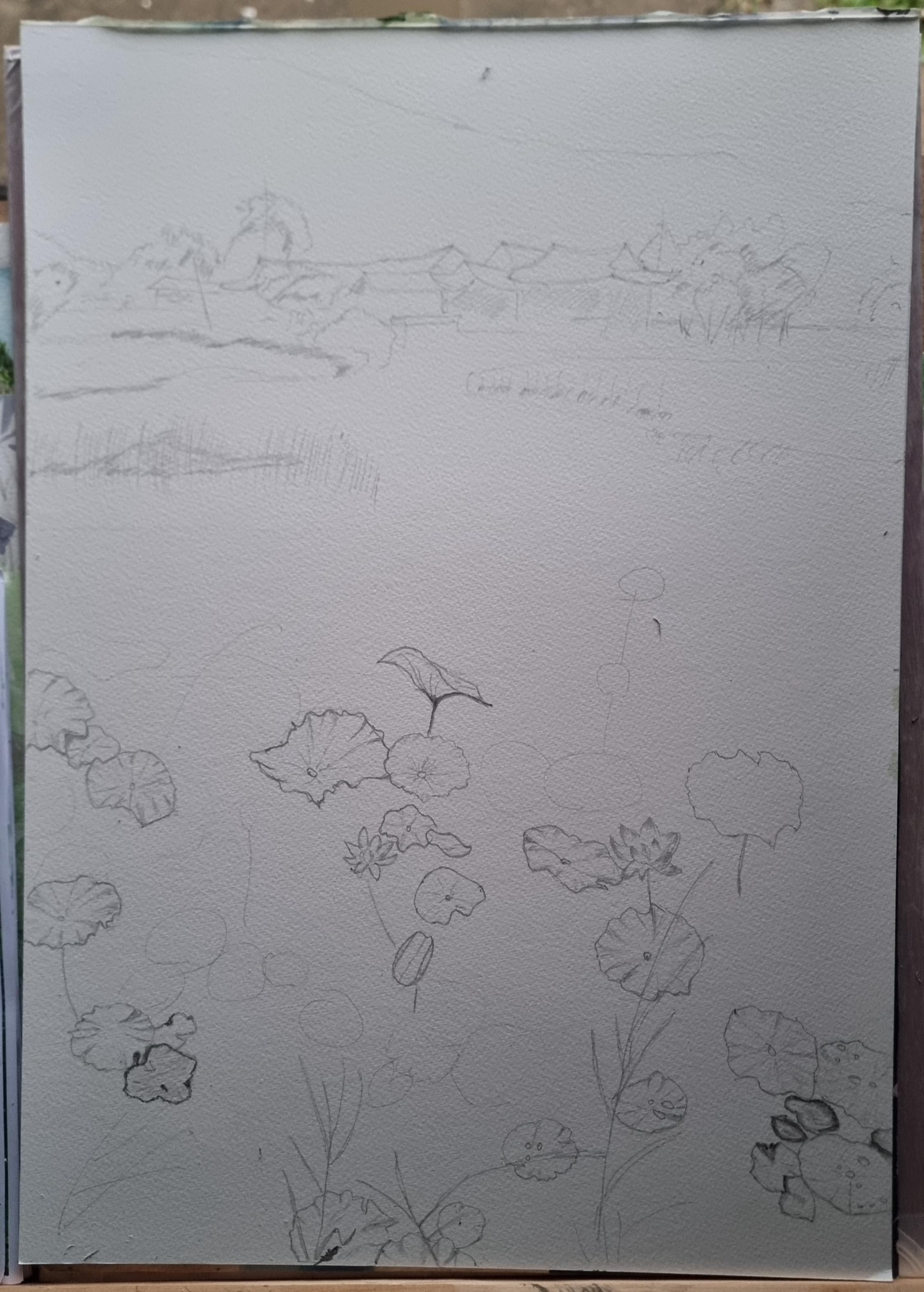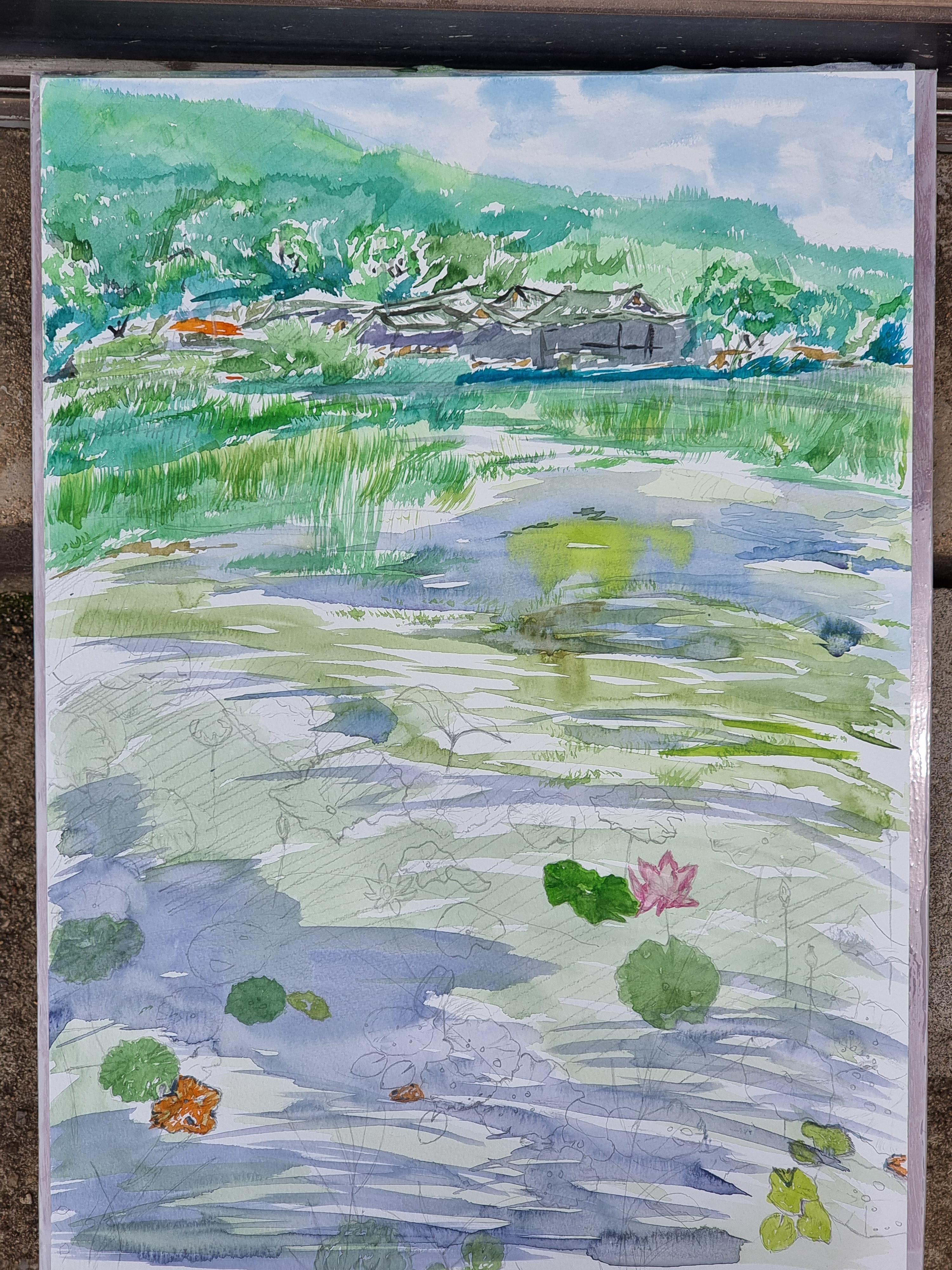 - 계속 비가 이어지는 날이다. 어제 밤에도 물론 비가 왔다. 오늘도 아침도 계속해서 비가 내린다. 지금 만들고 있는 다실도 확보한 자재들을 가지고 할 수 있는 일은 다했다. 비가 계속 왔다갔다 하는 탓에 밖에서 하는 일은 생각도 안한다. 그래서 지난 주 서양화 강사님께서 과제를 주신 '연밭'을 일부 스케치 했다.