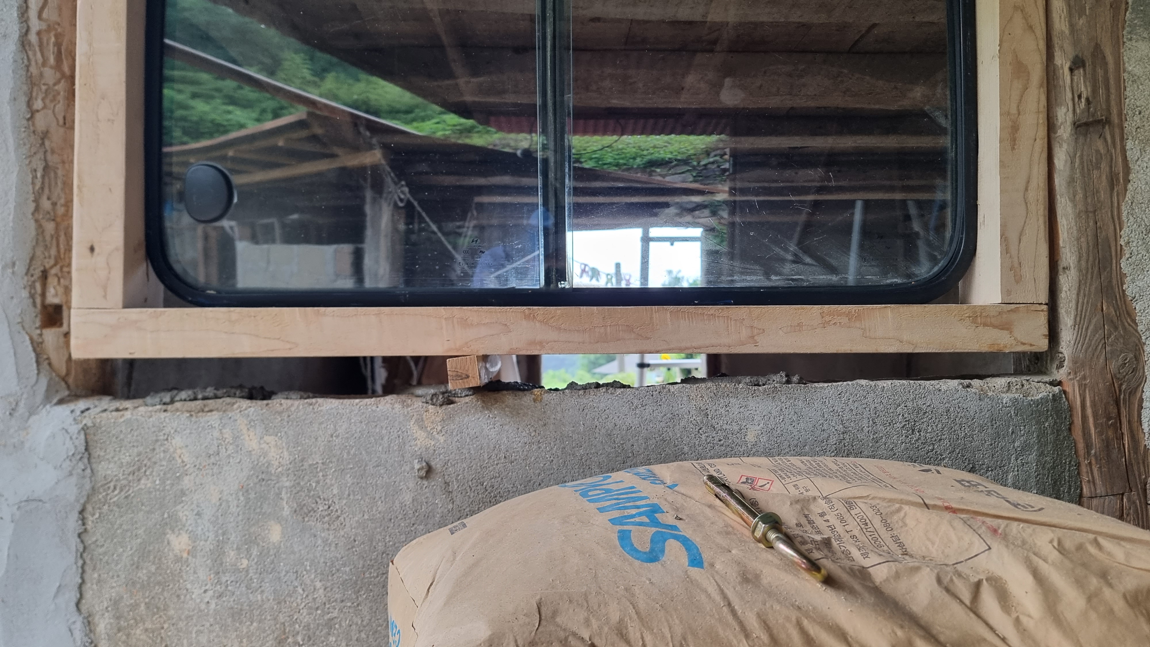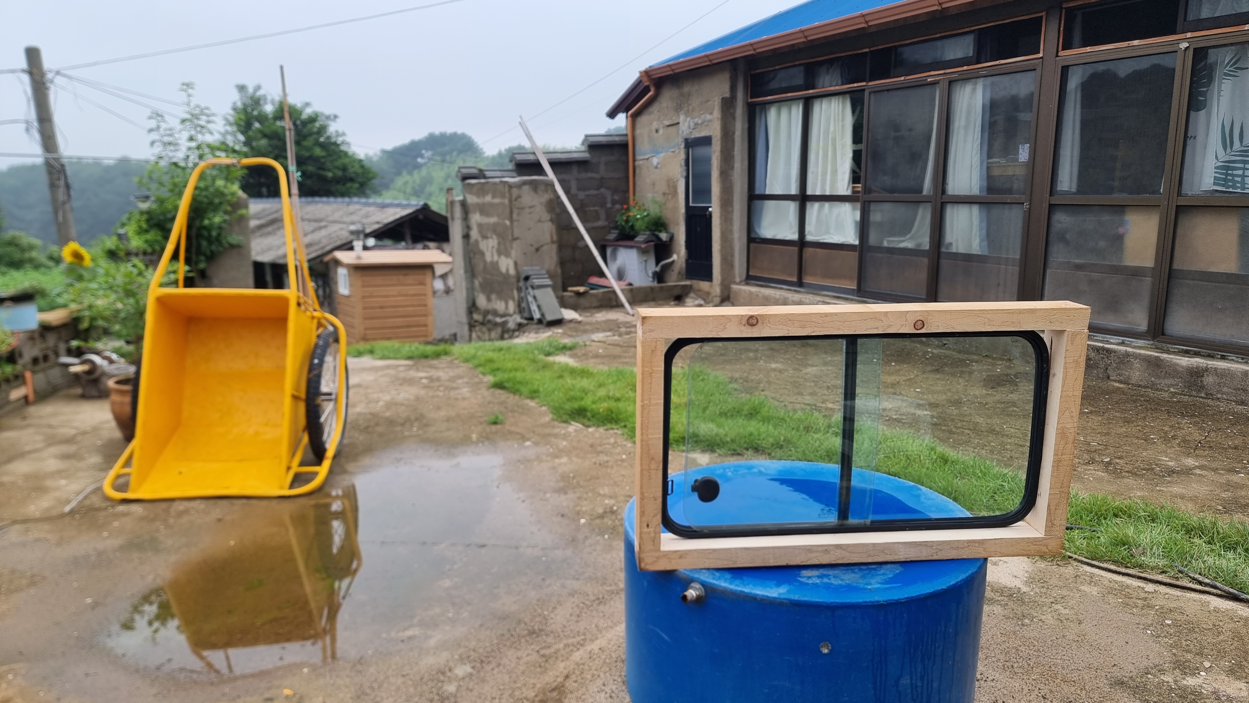 - 아침 일찍은 비가 오지 않았다. 그래서 한 시간쯤 들깨밭에 나가 풀을 좀 뽑았고, 아침을 먹을 쯤해서는 비가 세차게 내렸다가 또 그치기를 반복했다. 아침을 먹고서는 며칠 전에 자동차 문으로 다락 쉼터 아랫쪽 뒤편에 창문을 만들어 달았는데, 그 창문틀과 벽 사이에 공간이 있어 이것을 메꾸는 작업을 했다. 이곳에는 벽에 거푸집을 설치해 시멘트를 타설하는 방법으로 했는데 시멘트가 굳으면 거푸집을 떼어내면 된다.