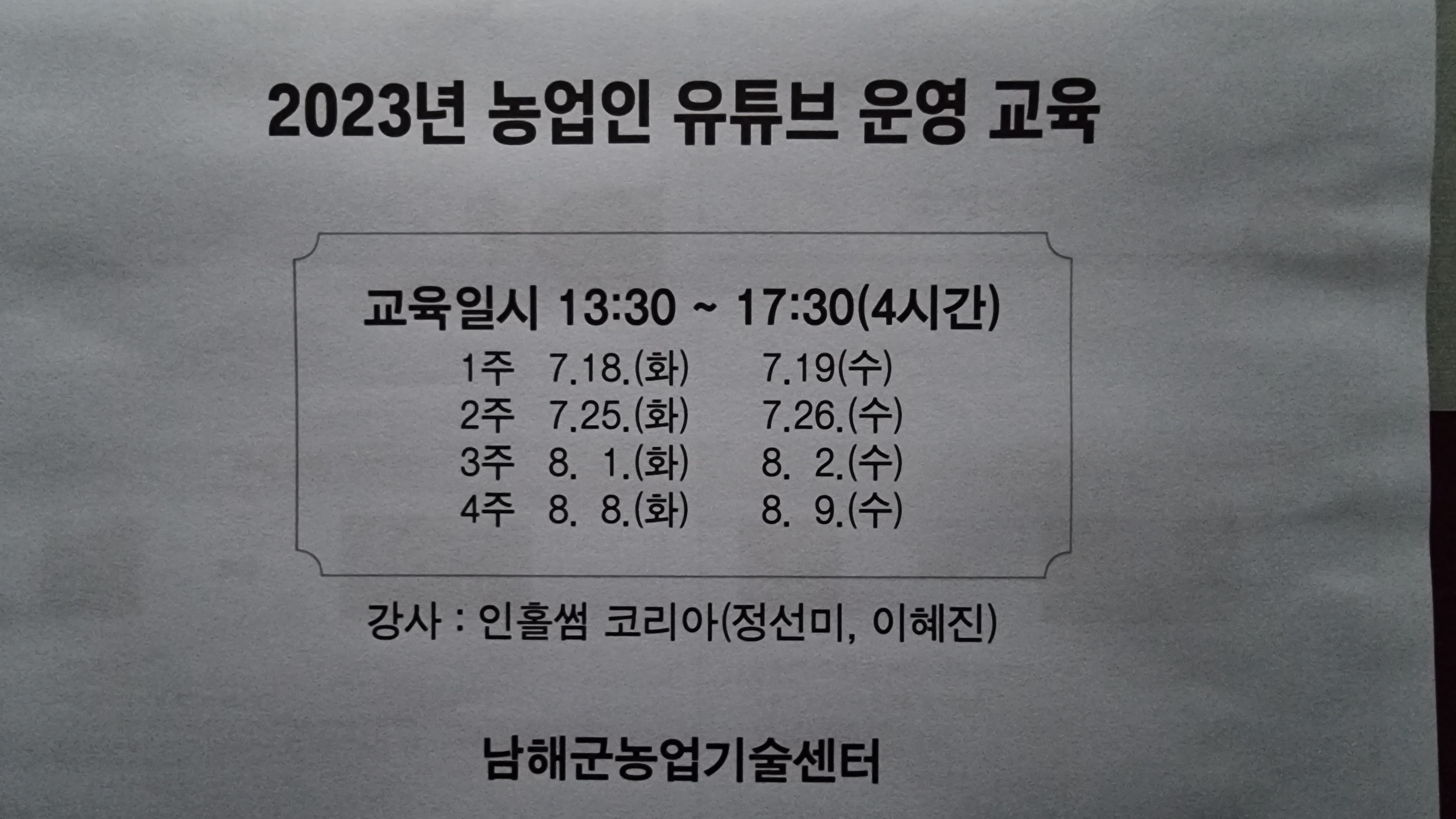 ◈ 23.07.18 - 남해, 화(비) : 농업인 유튜브 운영 교육 참가 등.