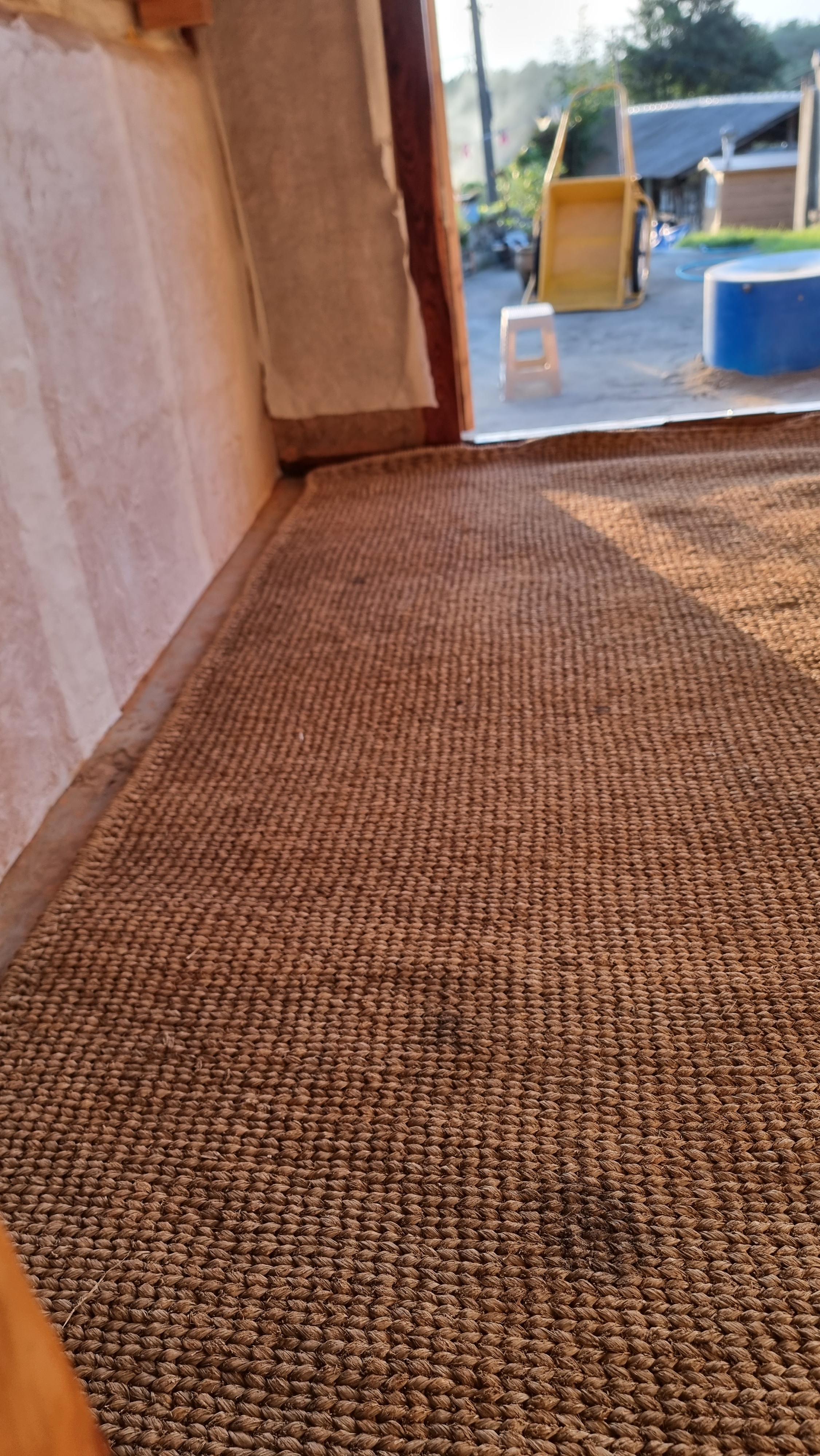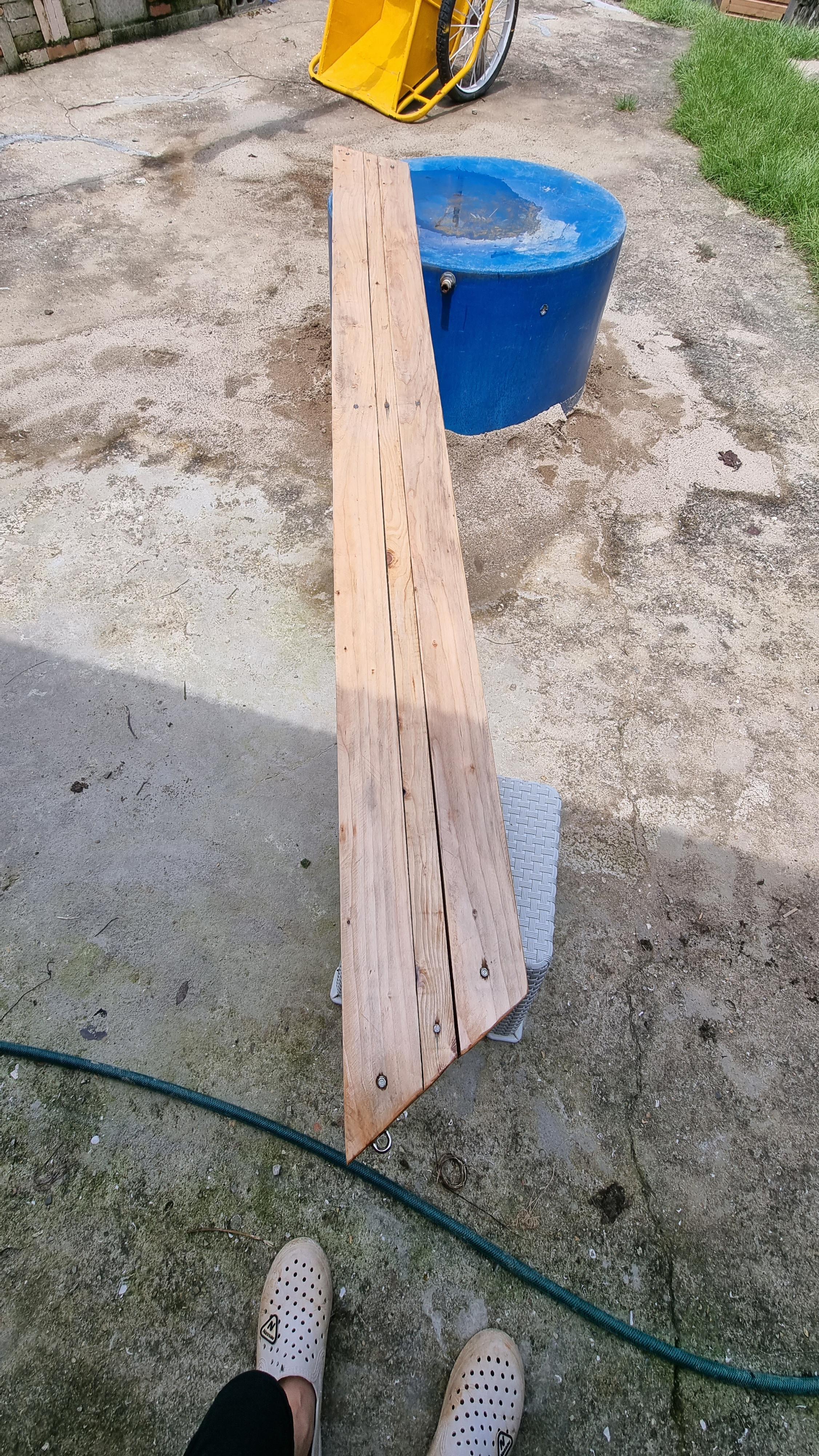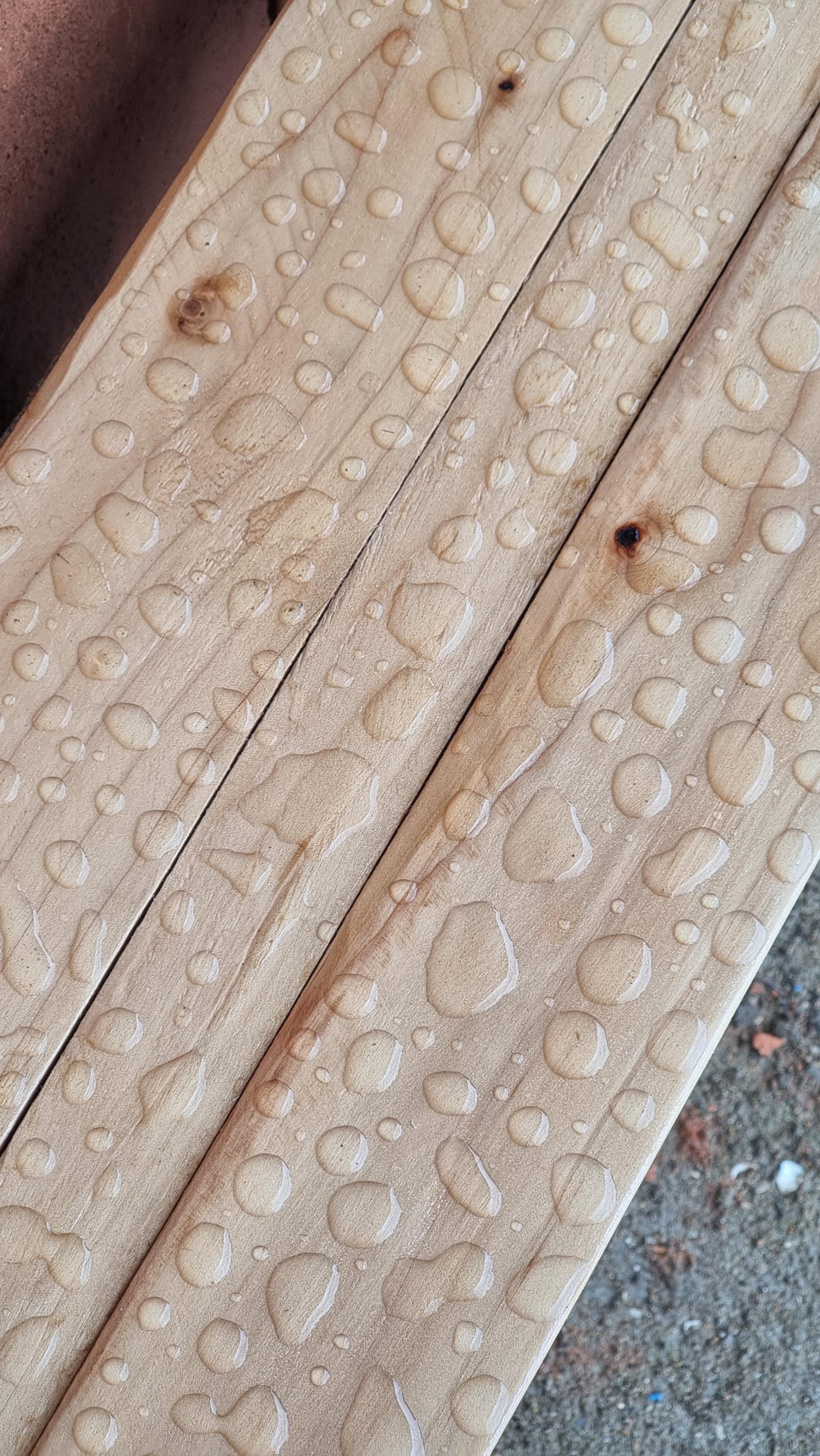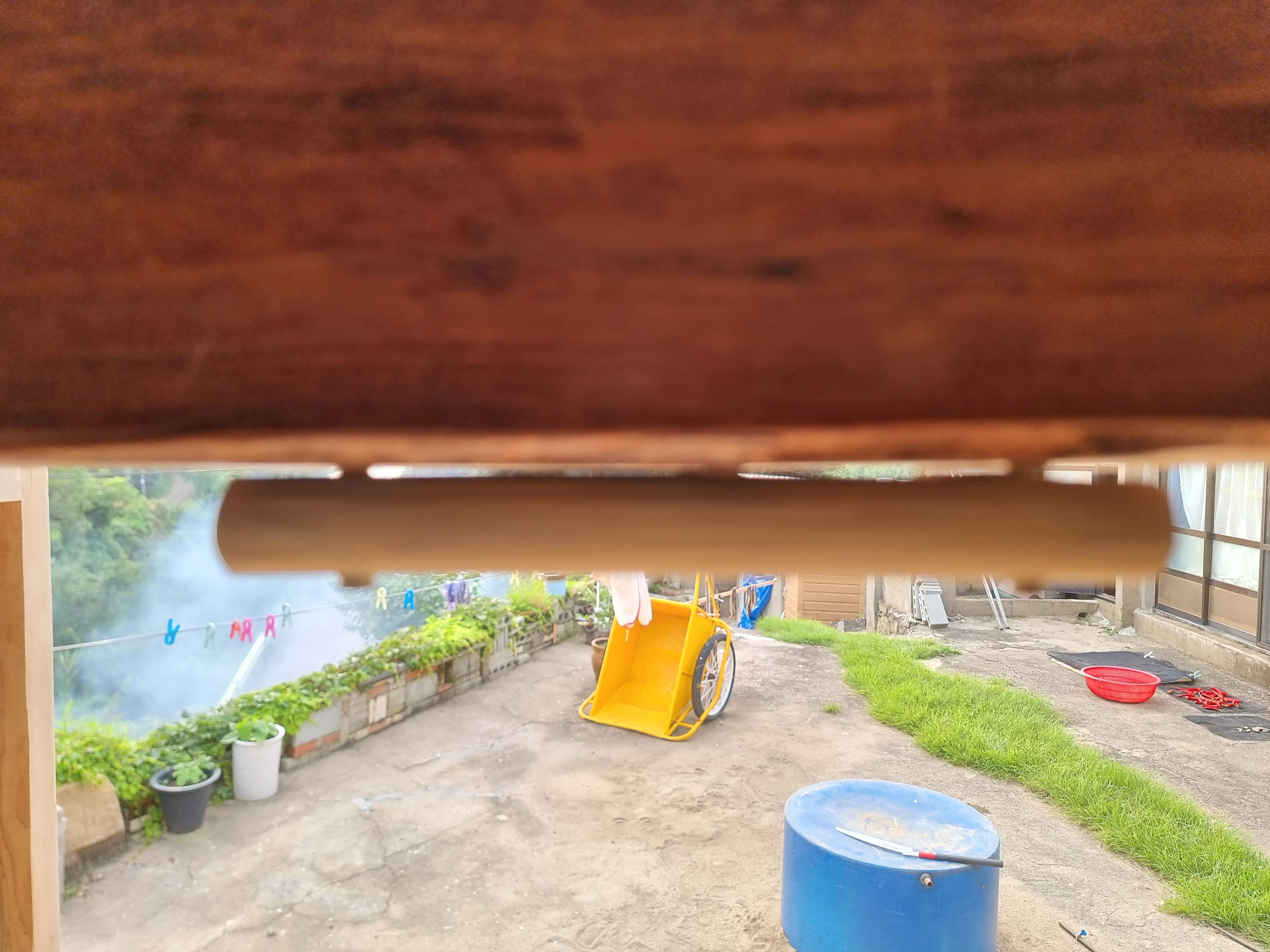 - 오늘도 하루 종일 비가 오락가락했다. 억수같은 비가 내리기도 했고, 보슬비나 이슬비처럼 내리기도 했고, 한참 동안은 조용하기도 했다. 처마 밑에서 간단한 체조를 하고 아침을 해 먹었다. 아침 후에는 다실 정면 외벽을 좀 정리했는데, 벽에 땜질한 시멘트를 기둥에 맞게 그라인더로 잘라냈다. 그리고 어제 만들어 놓은 마루 상판도 그라인더로 매끈하게 만들었다.