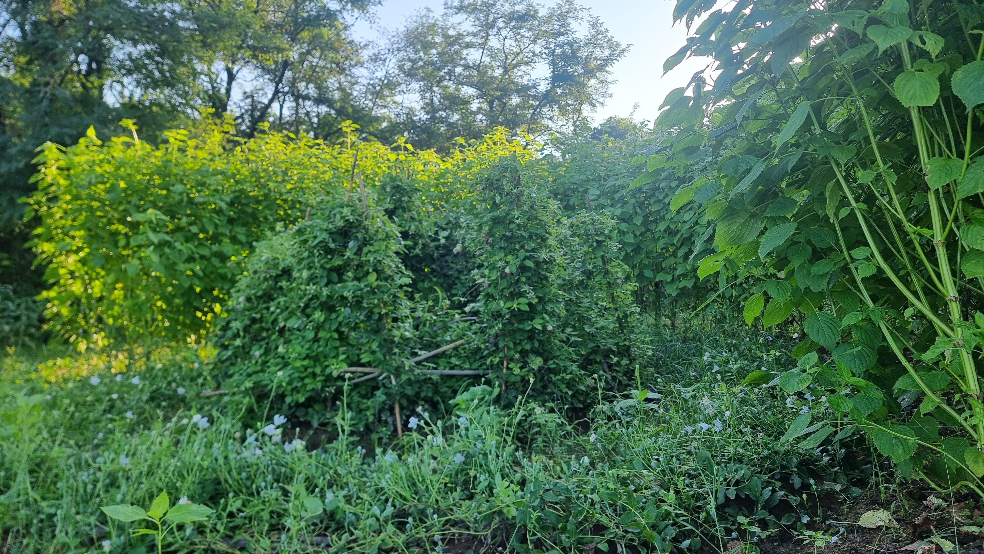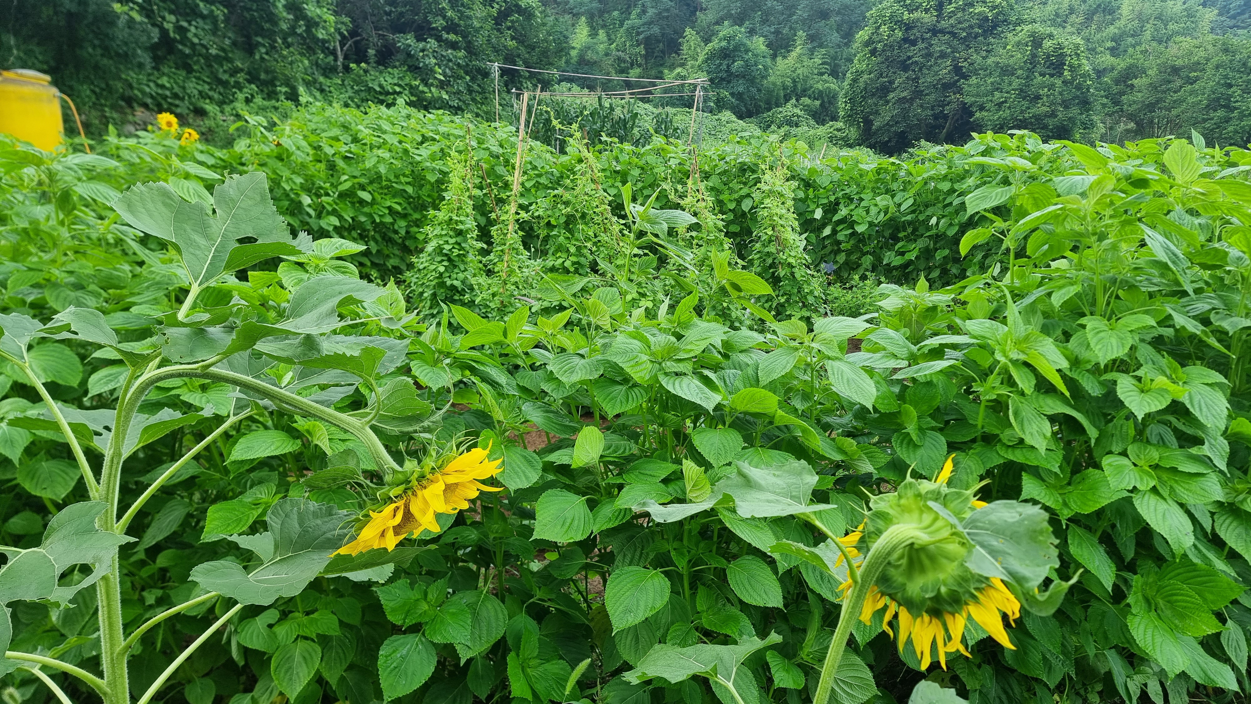 - 오늘 저녁에 옥수수 하나를 땄다. 잘 여물었는지 보기 위함인데 속은 알차다. 아직 조금 덜 여문 듯한데, 언제든지 따 먹어도 될 듯하다. 맷돌 호박도 여러 개 달려 익어가고 있다. 그런데 좀 생소한 호박도 보인다. 처음 보는 듯한데 무슨 호박일까? 표적지 모양의 둥근 밭 중 맨 바깥쪽에 심은 들깨가 내 키 만큼 커서 그 안쪽에 심어져 있는 더덕과 도라지가 잘 보이지 않는다. 더덕과 도라지는 성벽 역할을 하는 들깨의 보호 아래 있는 듯하다.