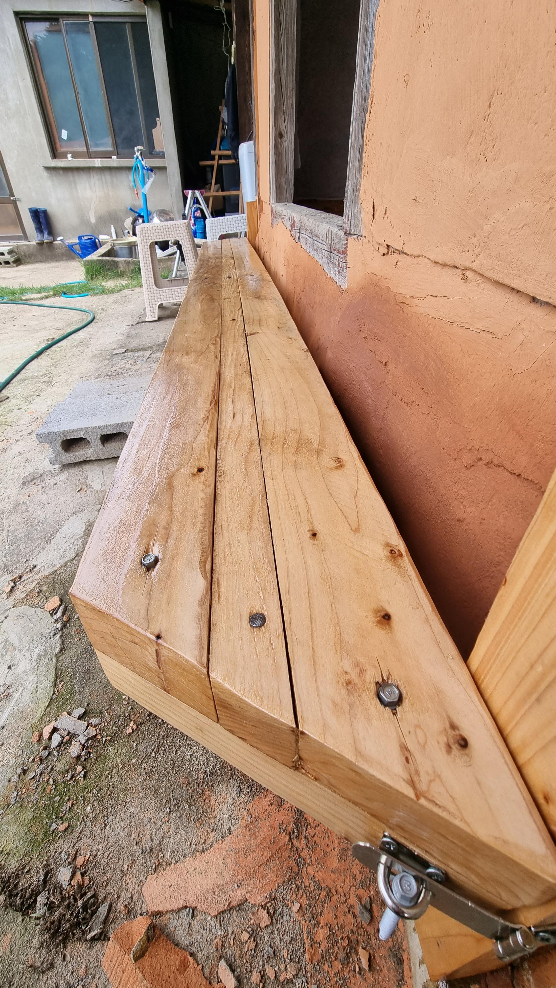 ◈ 23.07.19 - 남해, 수(맑음, 흐림) : 본채 뒷벽 처마 밑 보수, 농업인 유튜브 운영 교육 참가, 다실 마루 부착 고리 설치 등.