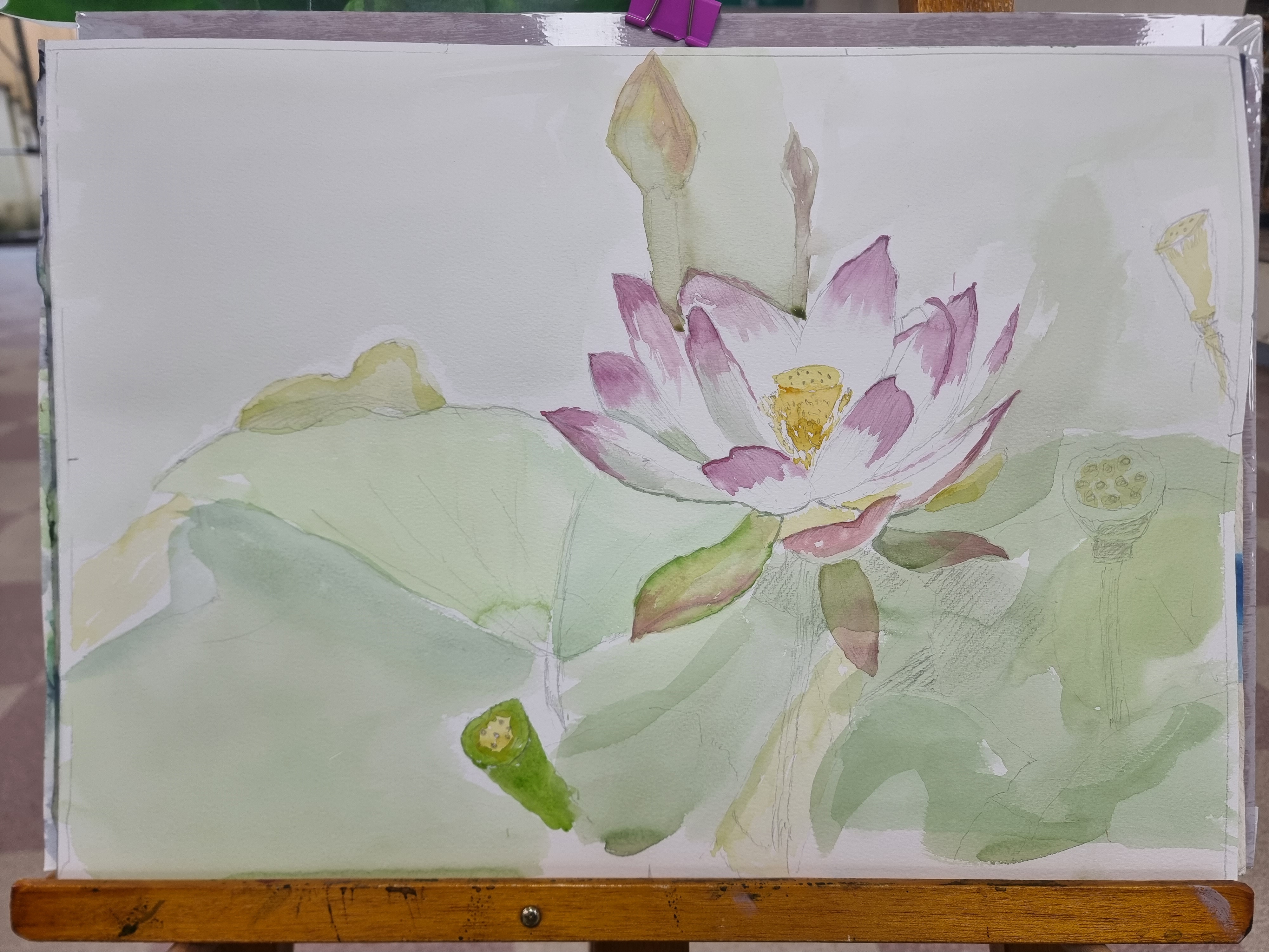 - 아침을 먹고는 서양화 수업을 위해 문화원에 갔는데, 집에서 출발할 때 약한 비가 내렸고, 문화원에 도착해서도 그랬다. 오늘은 전 시간에 스케치 했던 연꽃에 채색을 했는데, 집에서는 펼쳐보지도 못했다. 두 시간이 금방 갔다. 강사님의 말씀을 들어가면서 채색을 했지만 조금밖에 하지 못했다. 강사님께서 다음 시간에 올 때는 '연밭'을 스케치 해 오라신다.