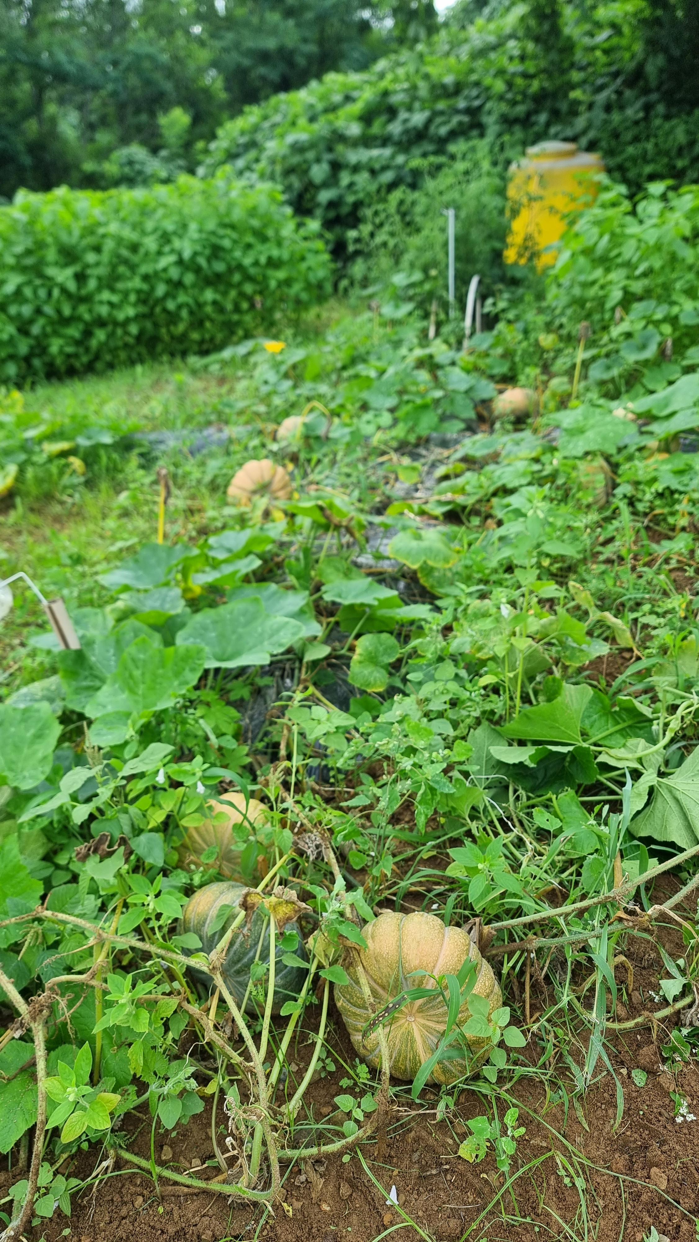 - 점심을 먹고는 단호박을 몇 개(9개)를 땄다. 지금까지 103개를 땄다. 아직 몇 개 정도 더 딸 것이 남아 있으니 110개 정도는 딸 듯하다. 비온 뒤라 오후는 후텁지근하다. 그래서 샤워를 하고는 다락 쉼터에서 잠시 낮잠도 잤다. 4시가 넘어서는 작물밭인지 풀밭인지 모를 정도가 된 뒷밭에 나가 도라지밭에 풀을 좀 뽑았다. 아직 땅이 질척한 상태라 풀뿌리에 흙들이 달라붙어 흙을 털어내기가 어려웠다. 엄청 열린 고추밭에 벌써 빨갛게 익어가는 고추가 보인다. 참깨밭은 호박줄기들이 침범을 해서 깨밭인지, 호박밭인지, 풀밭인지 모르겠다. 수박도 익었는지 알 수가 없다. 옥수수도 많이 열렸다.