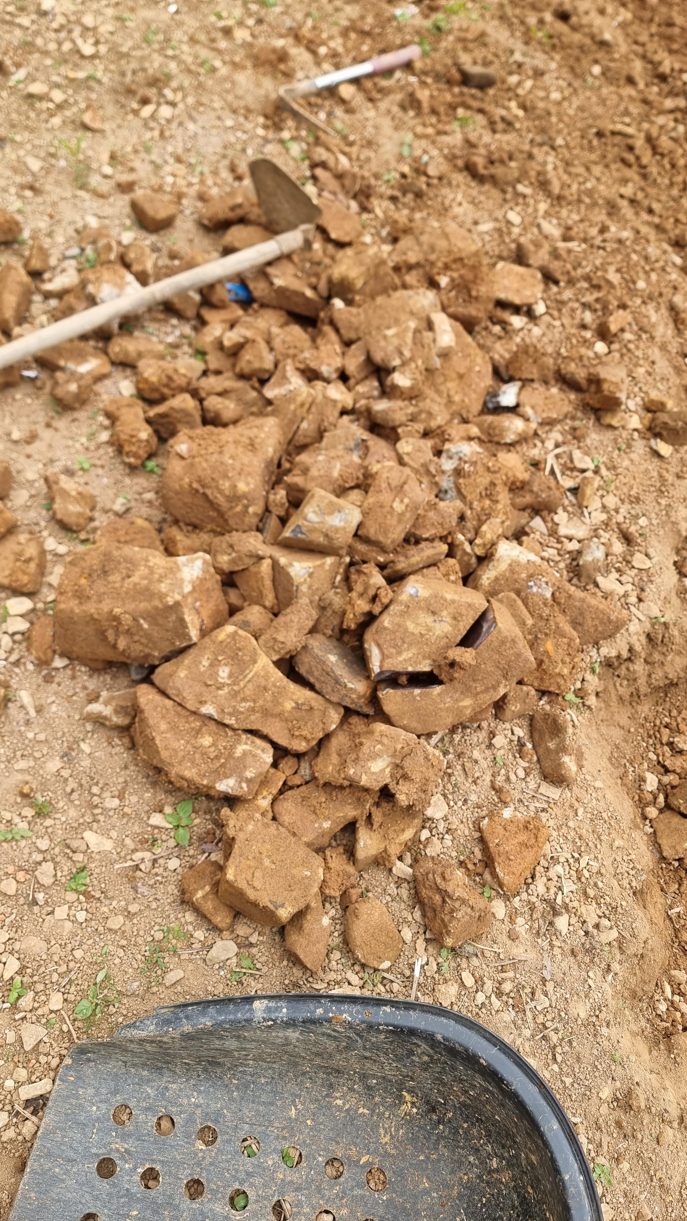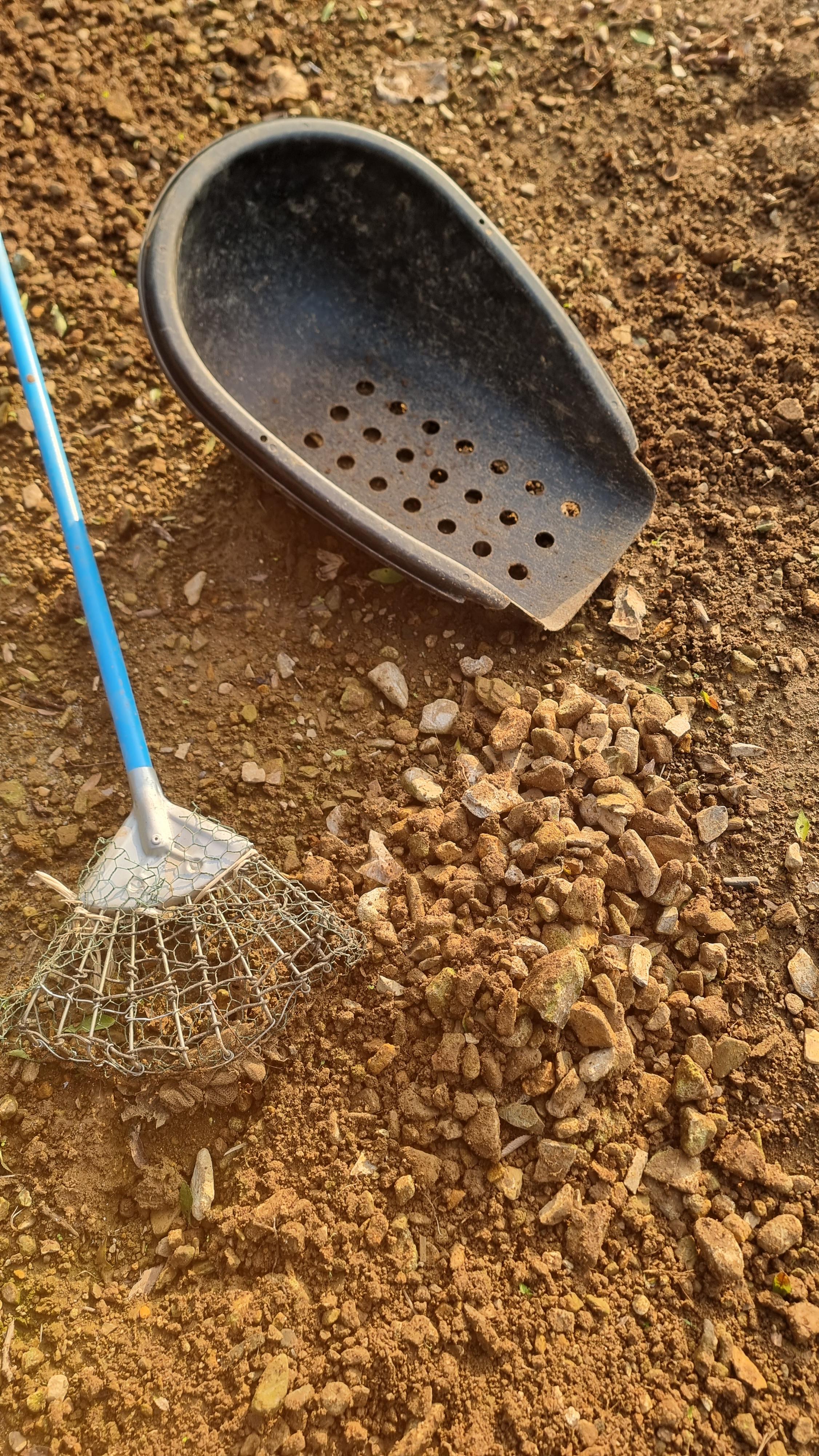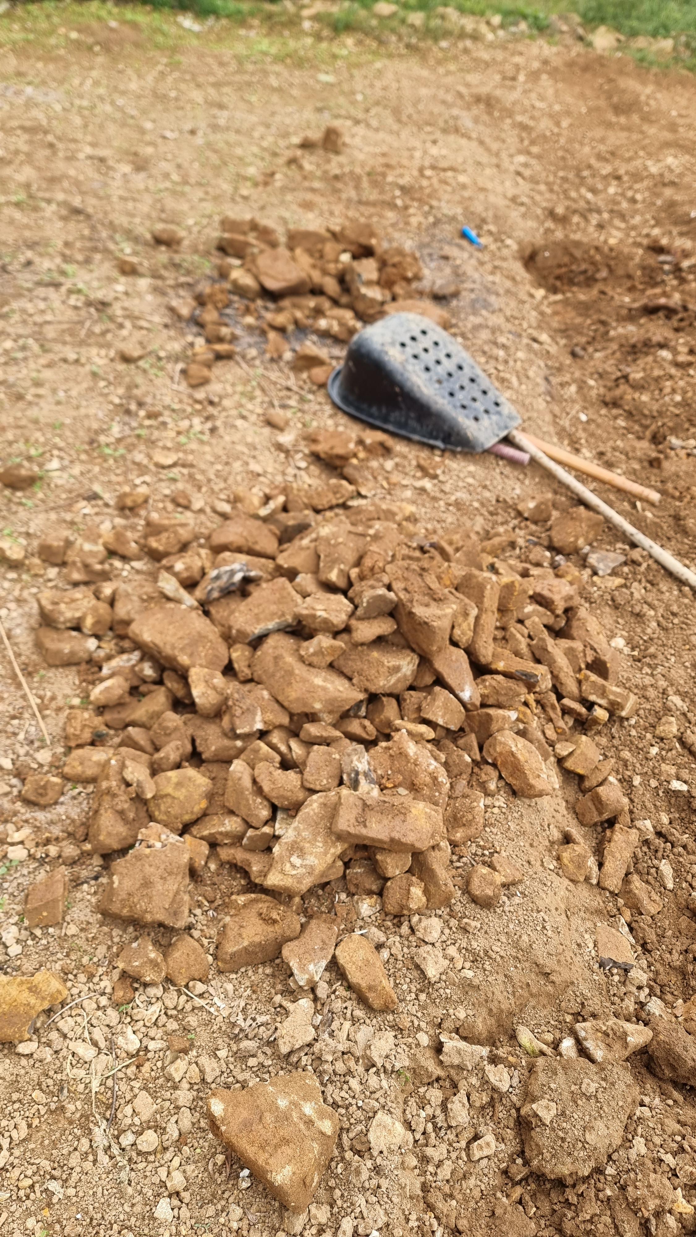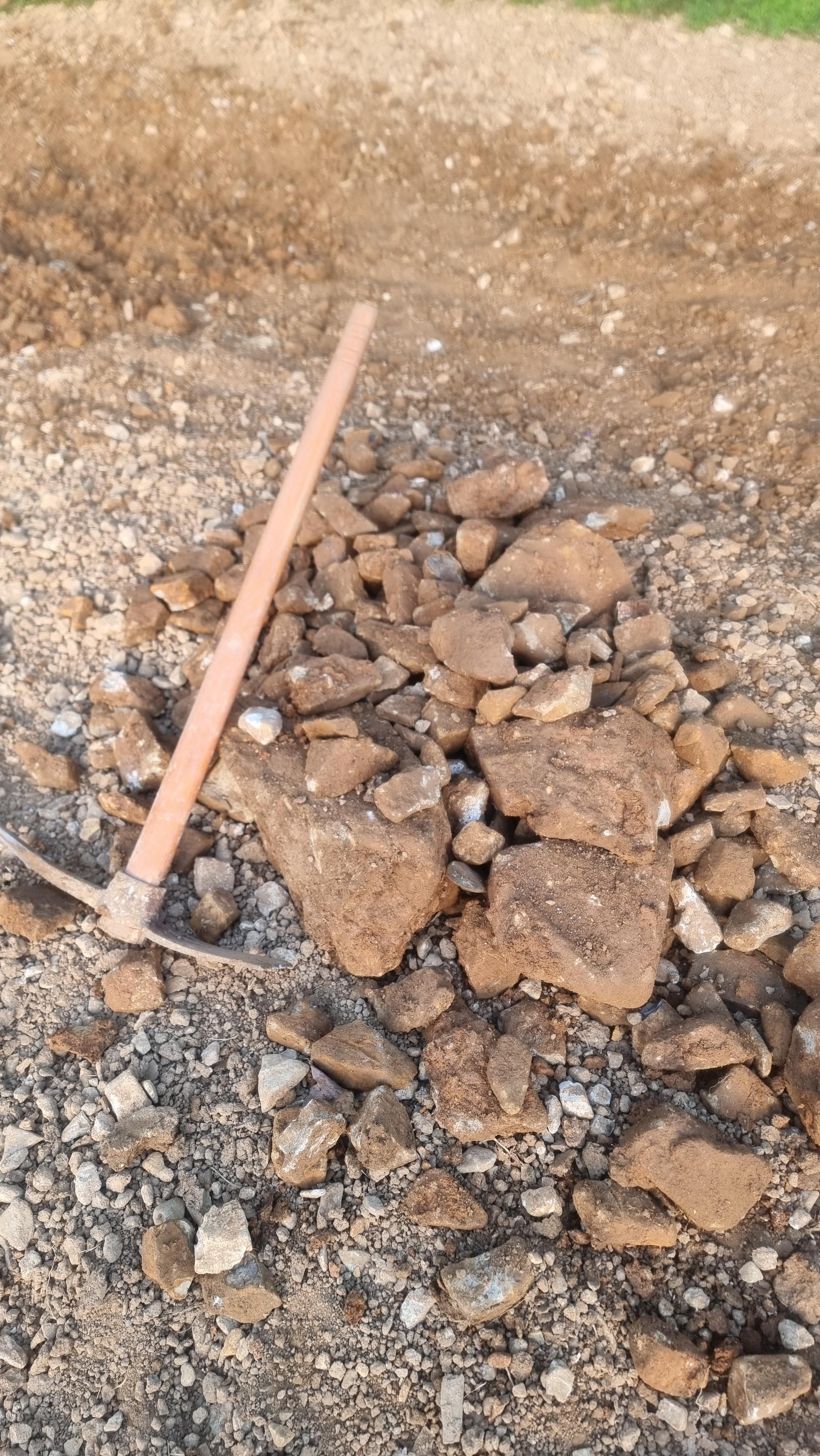 - 오늘은 며칠 동안 곡갱이로 파고, 경운기로 로터리 작업을 해 놓은 곳에 있는 잔돌들을 골라냈다. 바닥에 흙이 보이지 않을 정도로 잔돌들이 많다. 이 잔돌 중 일부는 아랫채에 '작물 보관 창고'로 사용할 예정인 곳의 바닥을 만드는 데 깔았다.