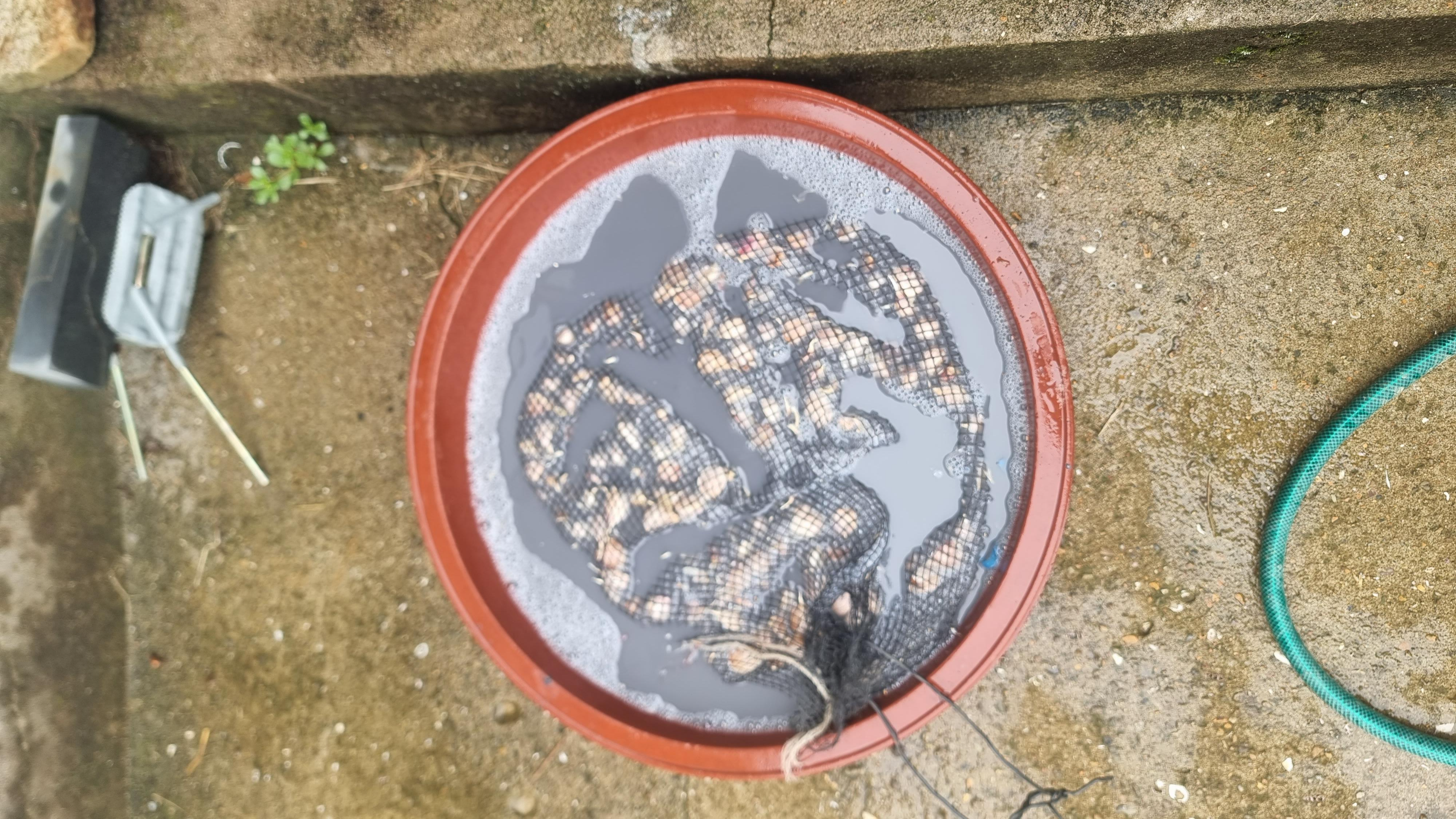 - 아침을 먹고 오전에는 씨마늘 고르는 작업과 골라낸 씨마늘에 살균 작업을 했는데, 마늘 중 상태가 좋은 것을 고르는 작업인데도 쉬운 일은 아닌 듯하다, 힘이 들어서가 아니라 지루함이 있어서다. 그물망에 넣은 씨마늘을 살균제를 탄 물 20리터 정도에 약 1시간 정도 담근 후 꺼내어 그늘에 말렸다가 심으면 된단다. 빨래도 했다. 날씨가 흐리긴 하지만 비는 오지 않은 상태다. 만약 비가 내리면 빨래줄 자체를 처마 밑으로 옮기면 된다.