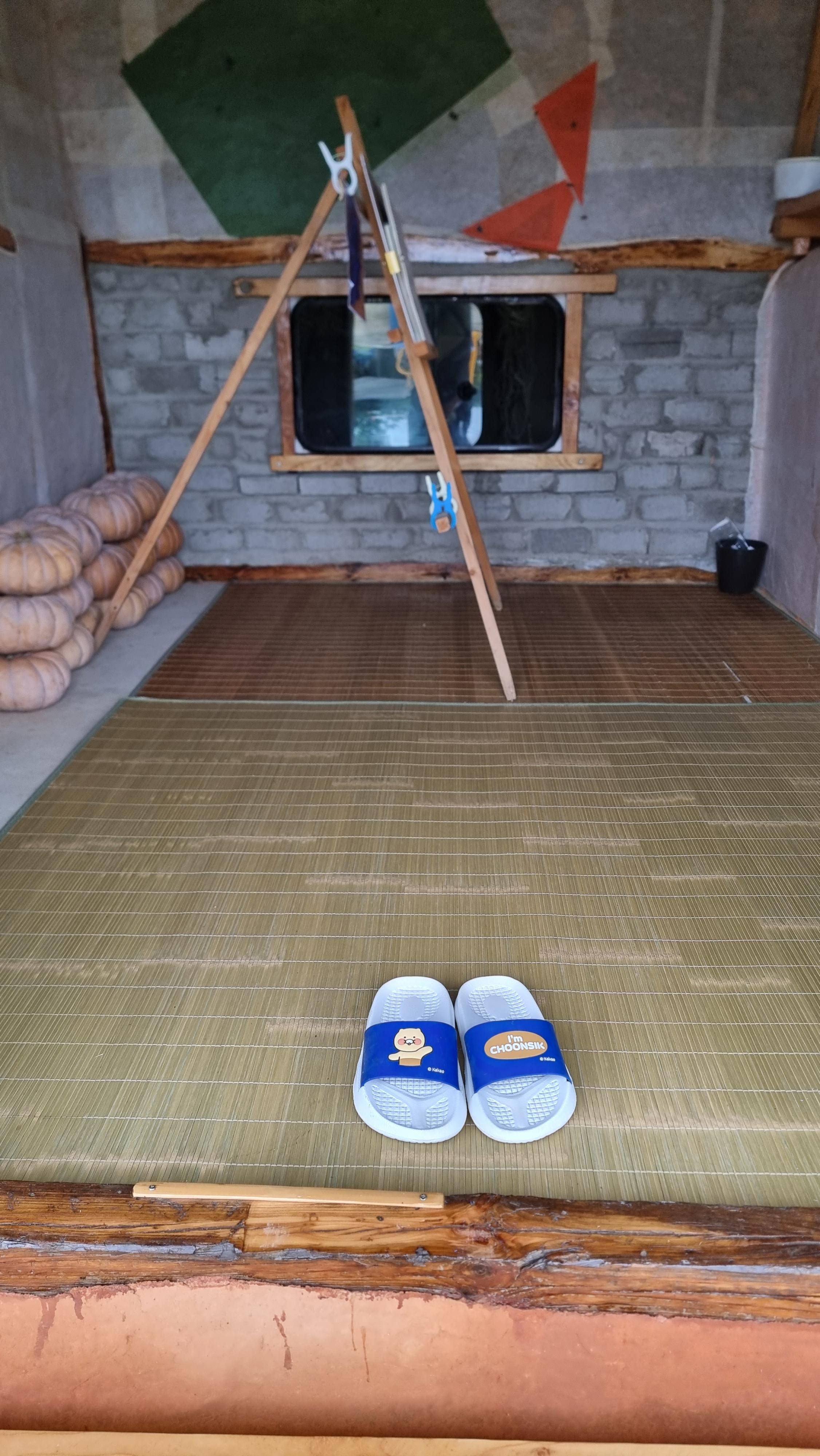 - 그리고 여름 더위를 식혀 주었던 다락 쉼터를 철수시켰다. 철수라 해봐야 작은 모기장을 걷고, 쉼터에 깔았던 대나무 돗자리를 걷어 내는 일이다. 모기장은 내년에 또 사용하기 위해 창고에 두었고, 돗자리는 다실에 깔았다. 지금 다실에는 돗자리 두 개와 호박 여남 개, 가끔 그림 연습을 하는 이젤이 놓여 있다. 오늘 이 호박 중 세 개를 택배로 부쳤는데, 짝지 친구가 달라고 한 모양이다.