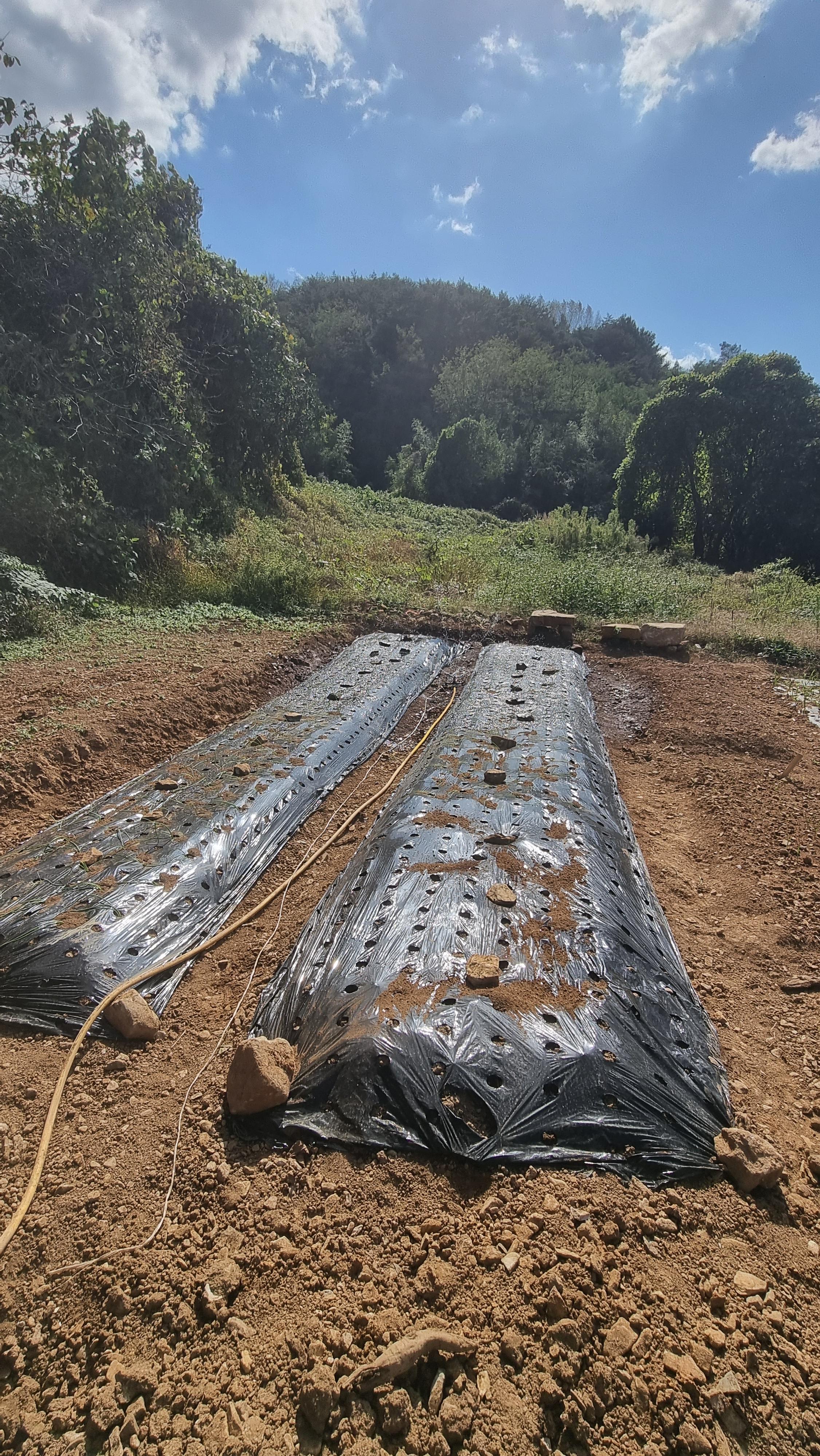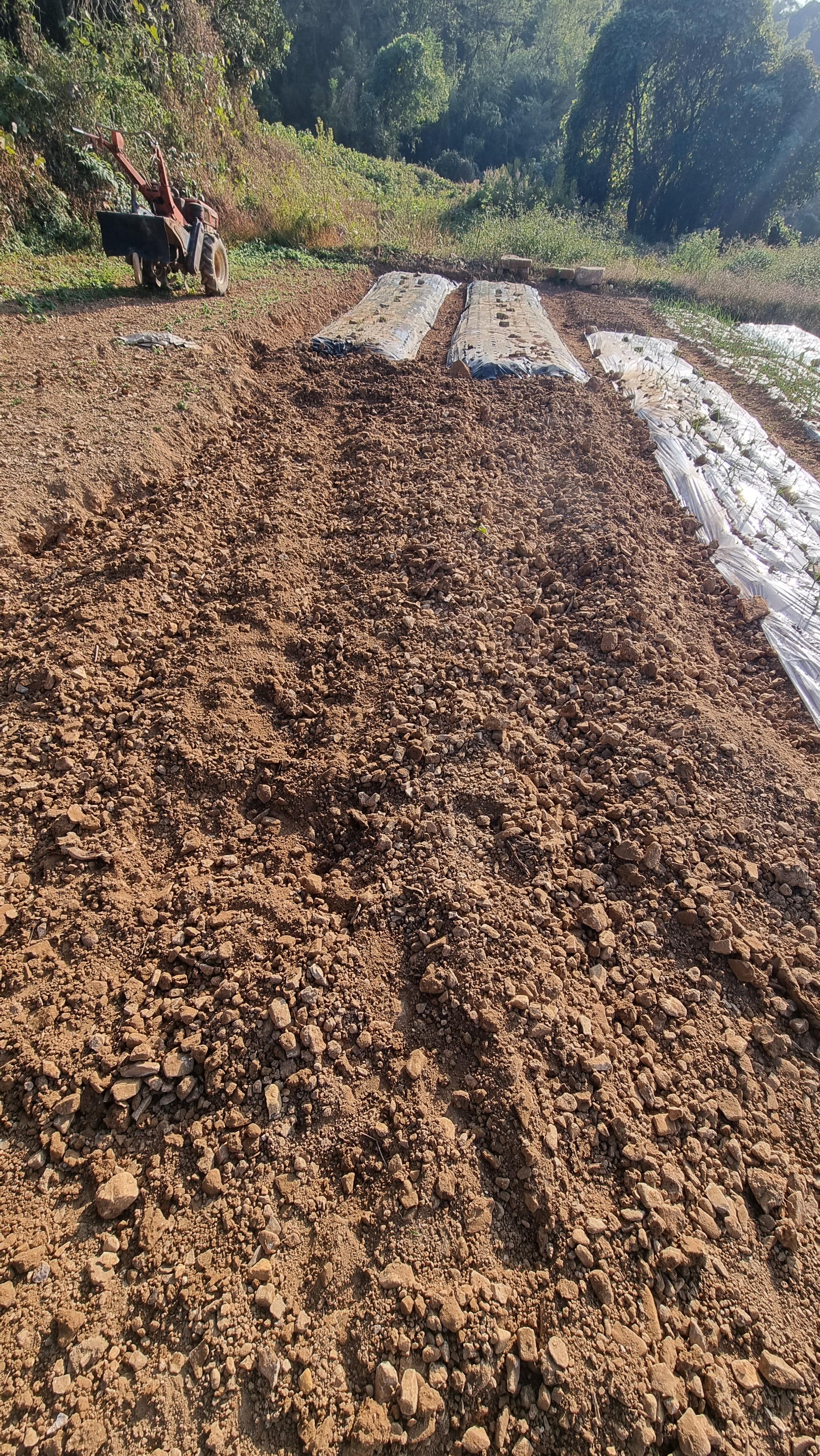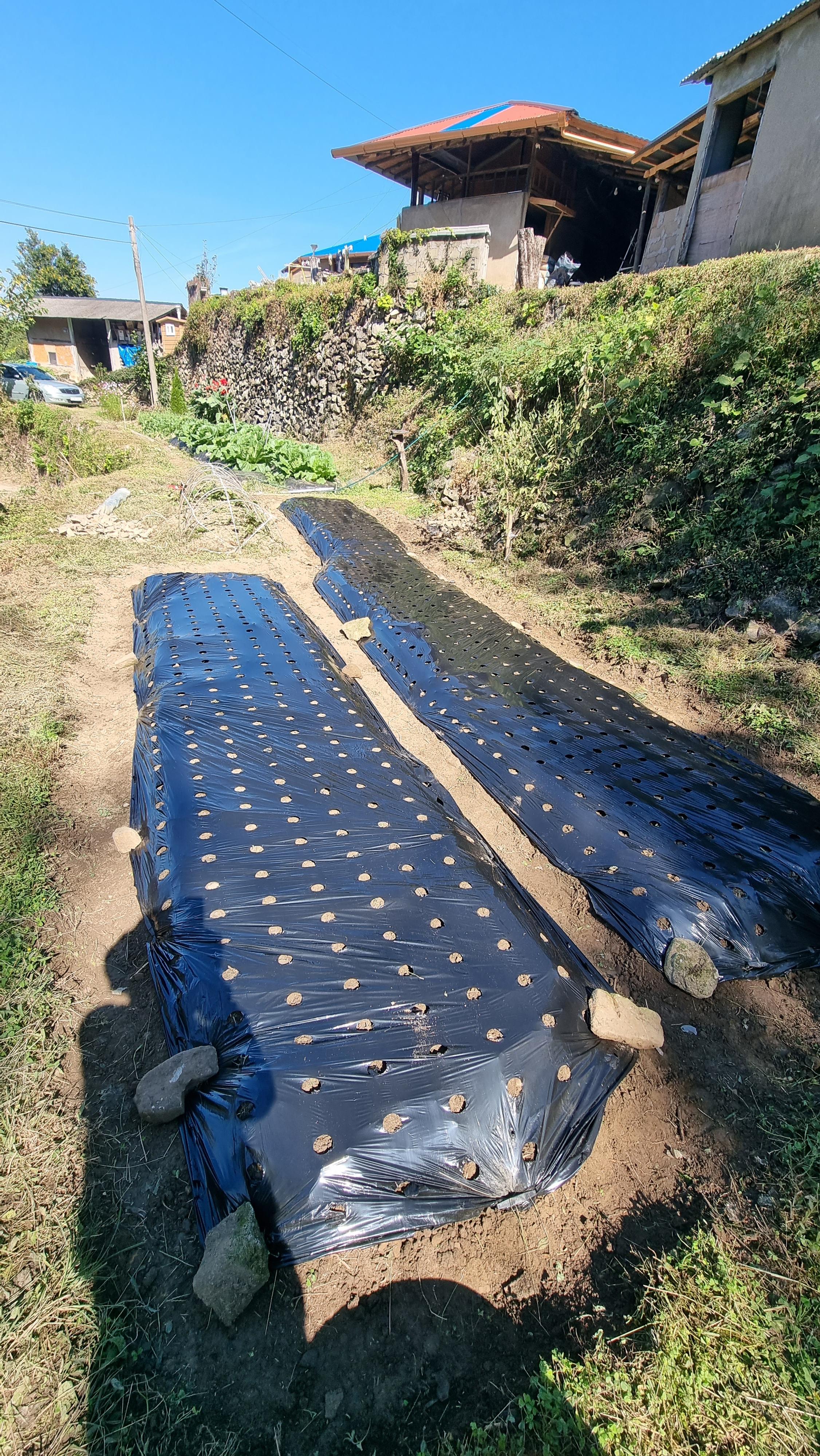 - 양파를 심을 두둑을 만들 생각인데, 이것을 만들기 위해 몇날 며칠에 걸쳐 땅을 파고, 돌을 캐내고, 돌탑도 두 개나 쌓고, 엄청난 잔돌들을 골라냈다. 오늘도 마지막으로 경운기로 로타리를 치고 잔돌들을 수없이 골라냈다. 그리고 두둑을 만들고 구멍난 비닐을 씌워서 마무리했다. 이제 적당한 날에 양파 모종을 사와 심으면 될 듯한데, 마늘을 심는 구멍난 검은 비닐에 한 칸을 띄우고 지그재그로 심을 생각이다. 몇 개나 심어질지는 세어보지 않았다. 심을 때 세어봐야지.