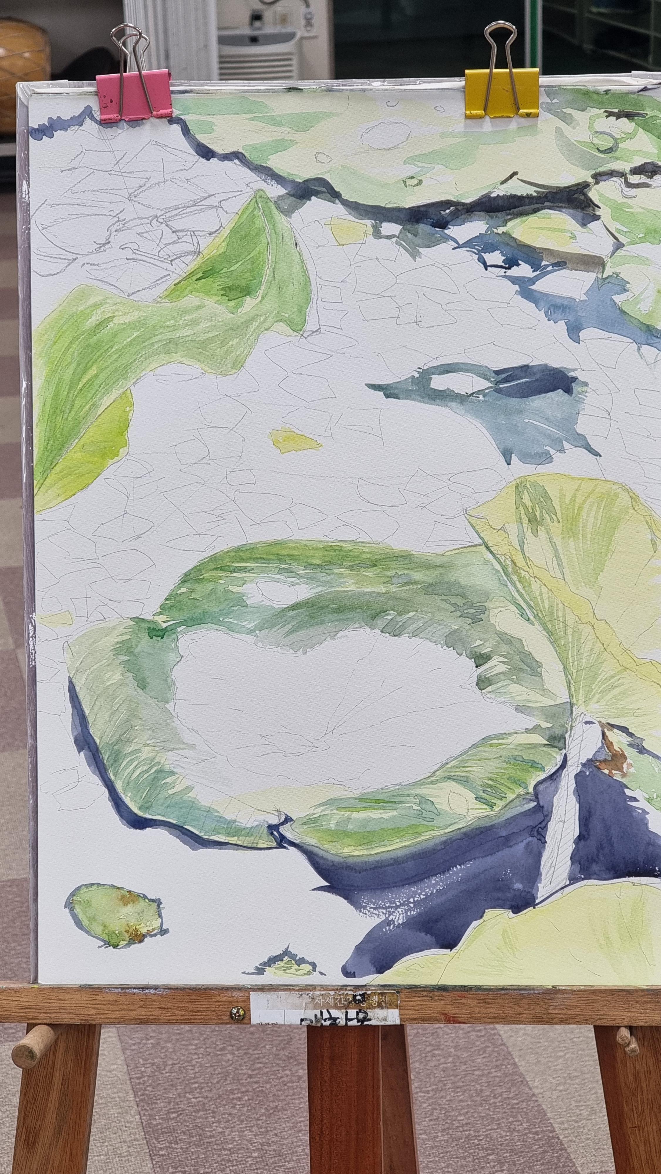 - 오늘 서양화 수업은 지난 시간에 스케치한 '연잎'에 채색을 시작했다. 미리 채색을 어느 정도 해오라고 하셨지만, 그럴 시간을 갖지 못했다. 강사님께서 여러가지 채색 방법을 알려 주셨다. 처음보다는 많이 부드러워졌다신다. 하지만 내가 한 채색은 영 마음에 안든다. 채색할 물감의 양을 어느 정도 만들어야 하는지, 색을 어떻게 섞어야 하는지 등이 영 서툴다.