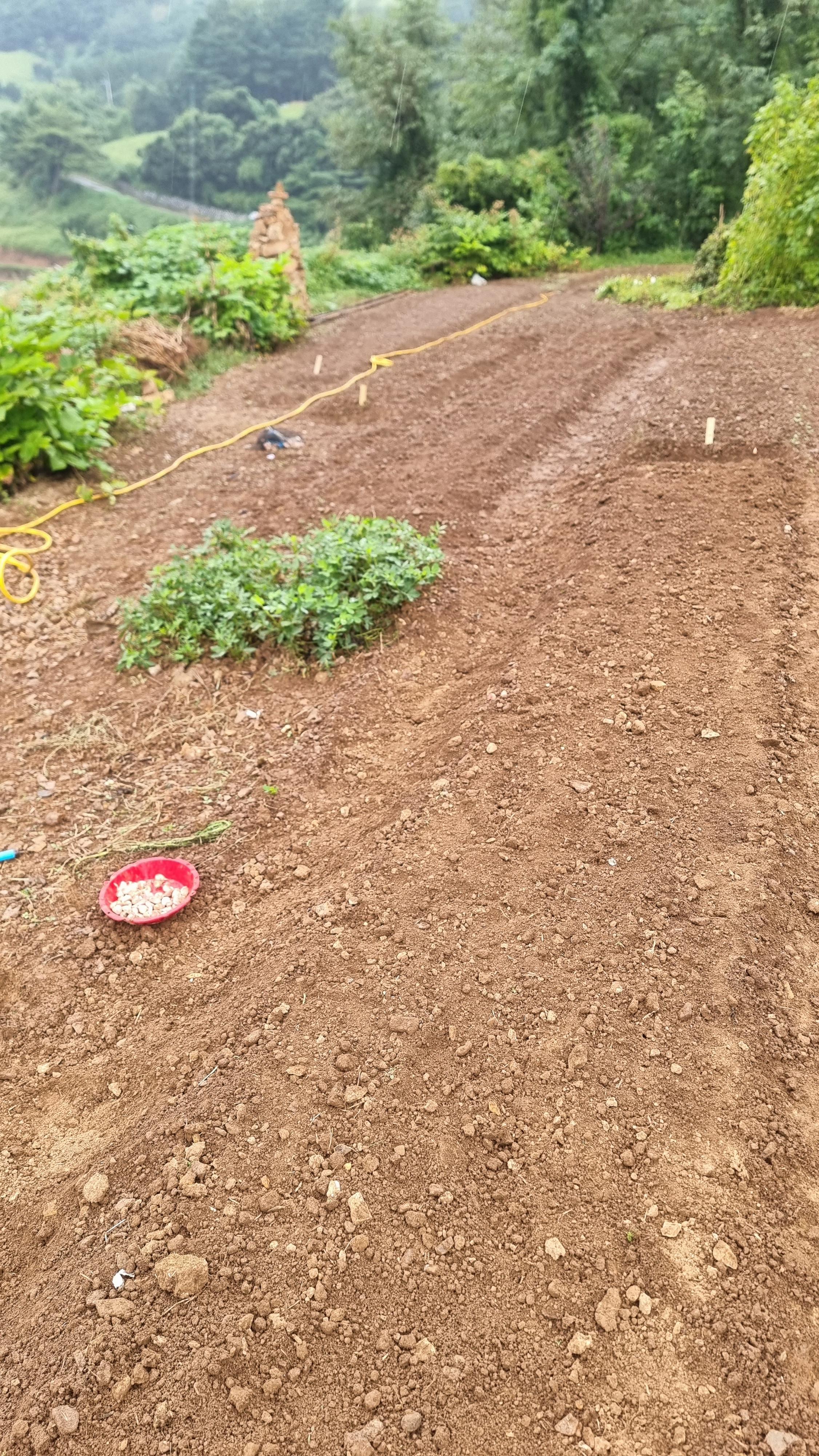 - 아침을 먹고는 시금치 밭과 마늘 밭에 스프링 쿨러를 돌려 놓고, 완두콩 씨앗을 심었다. 시금치와 마늘을 심은 짜투리 공간 네 곳에 심었는데, 거름도 안한 거친 밭이라 제대로 싹이 날지 모르겠다. 또 겨울을 견뎌야 하기 때문에 싹이 날 때쯤 '왕겨' 등으로 보온을 좀 해 줄 생각이다. 완두콩을 심은 뒤 밭에 또 돌 파내기 작업을 했다.