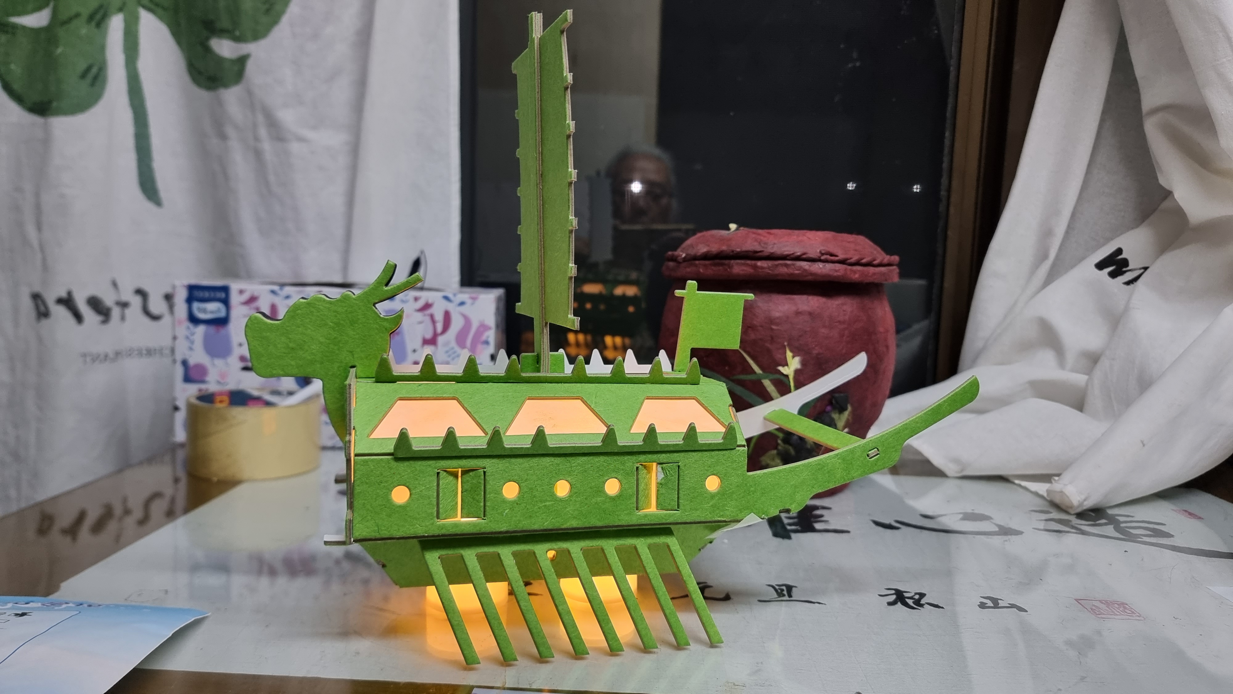 - 서양화 수업을 하고 있는데 '닥종이 공예' 강사님께서 전화를 주셨다. 몇 주 참석을 못했더만 걱정이 되시는 모양이다. 그래서 다른 학생과 함께 점심을 사 주셨다. 그리고 나는 우리 면에 있는 커피점에서 커피를 사 드렸다. 강사님께서 개발하셨다는 '거북선' 모형을 하나 주셨다.