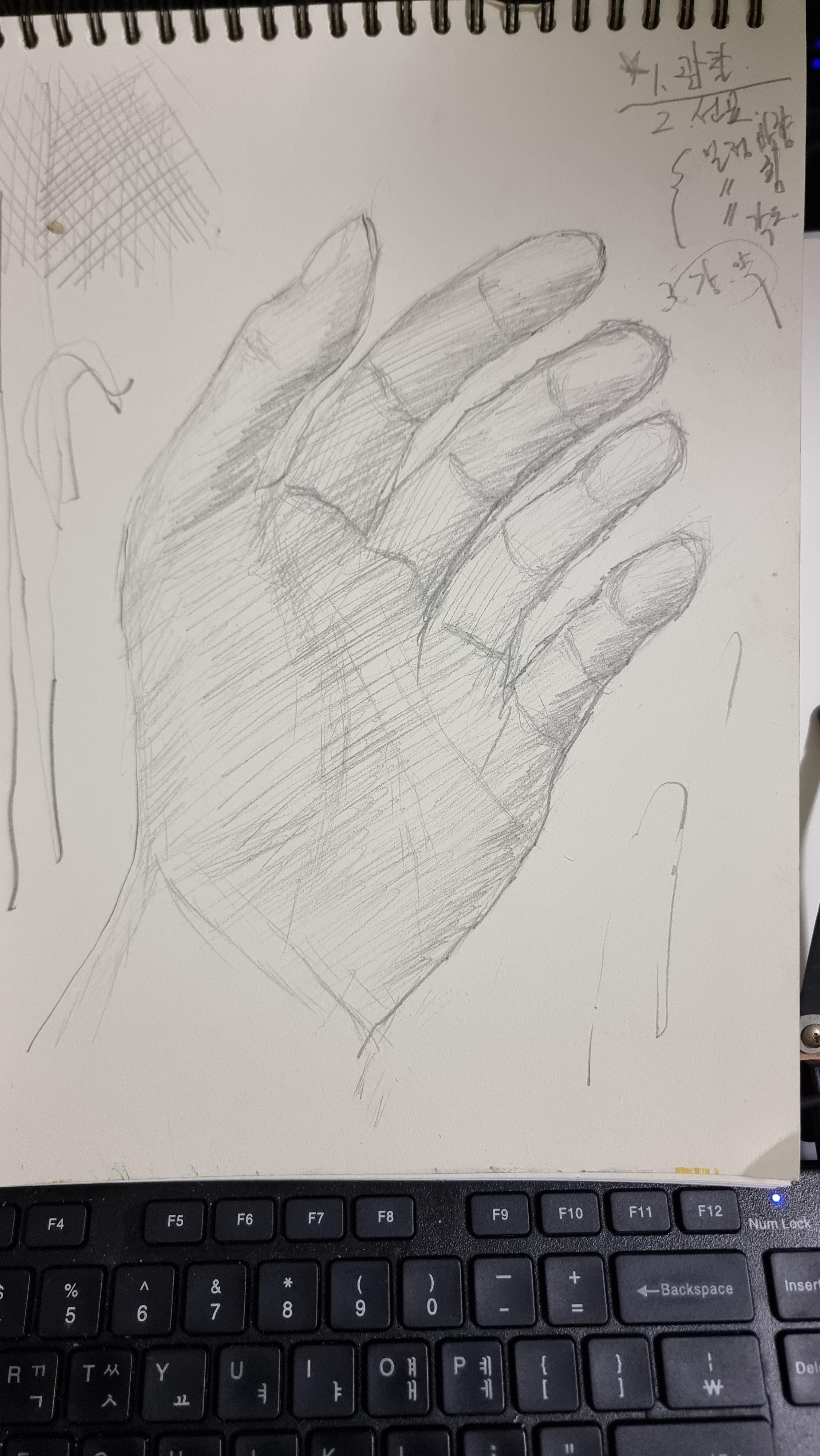 - 오늘은 문화원에서 '드로잉(소묘, 데생)' 첫 수업이 있는 날이다. 그래서 예초 작업을 하고 얼른 아침을 먹고는 집을 나섰다. 조금 일찍 나선 것은 예초기 날과 부속품을 구입하기 위해서인데, 부속품은 예초기를 가지고 와야 같은 것으로 구할 수 있단다. 그래서 부속품은 구하지 못했다. 드로잉 수업의 강사님은 서양화를 가르치는 서양화가이신 선생님께서 하신다. 오늘은 자기 손을 한 번 그려보라 해서 이렇게 그렸다.