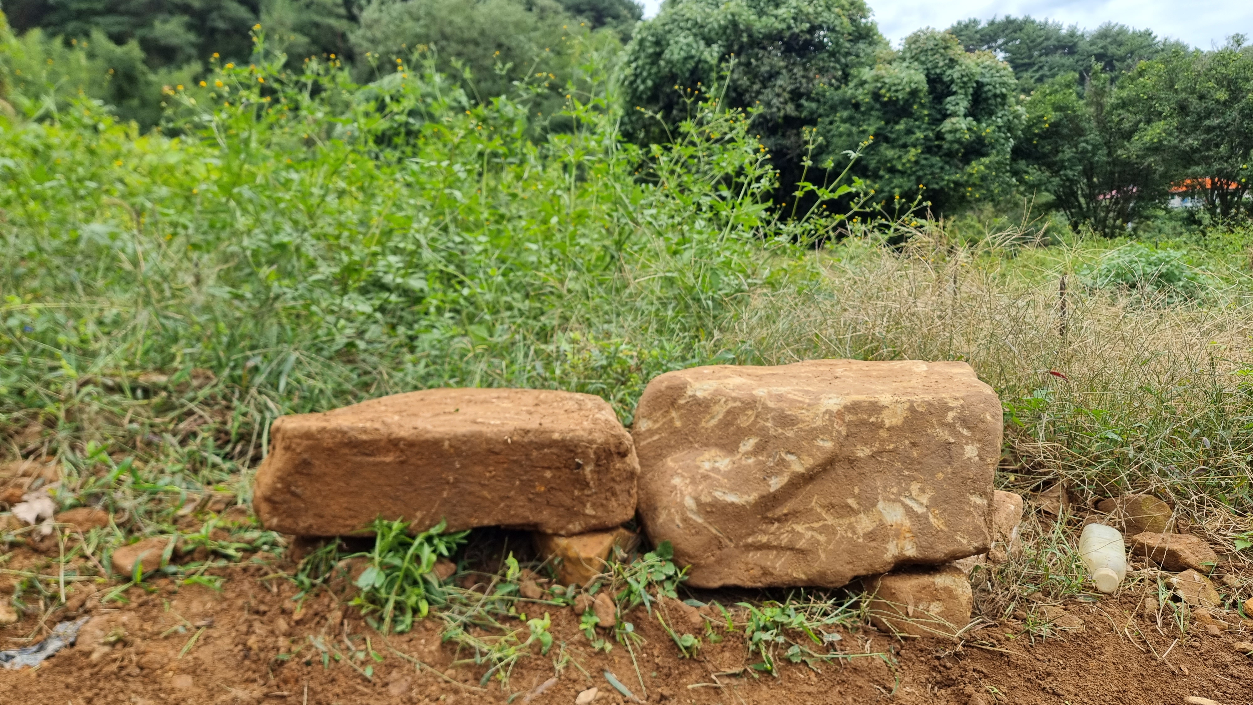 - 오늘은 아침을 먹기 전, 아침을 먹은 후, 점심을 먹고 나서 오후에도 밭 일구기를 했다. 어제 파다 중단한 돌은 몇 시간의 씨름 끝에 파냈다. 그 돌은 도저히 옮길 방법이 없어 몇 조각으로 돌을 깬 후 돌탑을 쌓는데 이용했다. 오후에도 큰 돌을 하나 파 냈는데, 그 돌은 면이 반듯해 앃고 있는 다섯 번째 돌탑 옆에 놓았다. 가끔 앉아서 쉴 수 있는 자리인 셈이다.