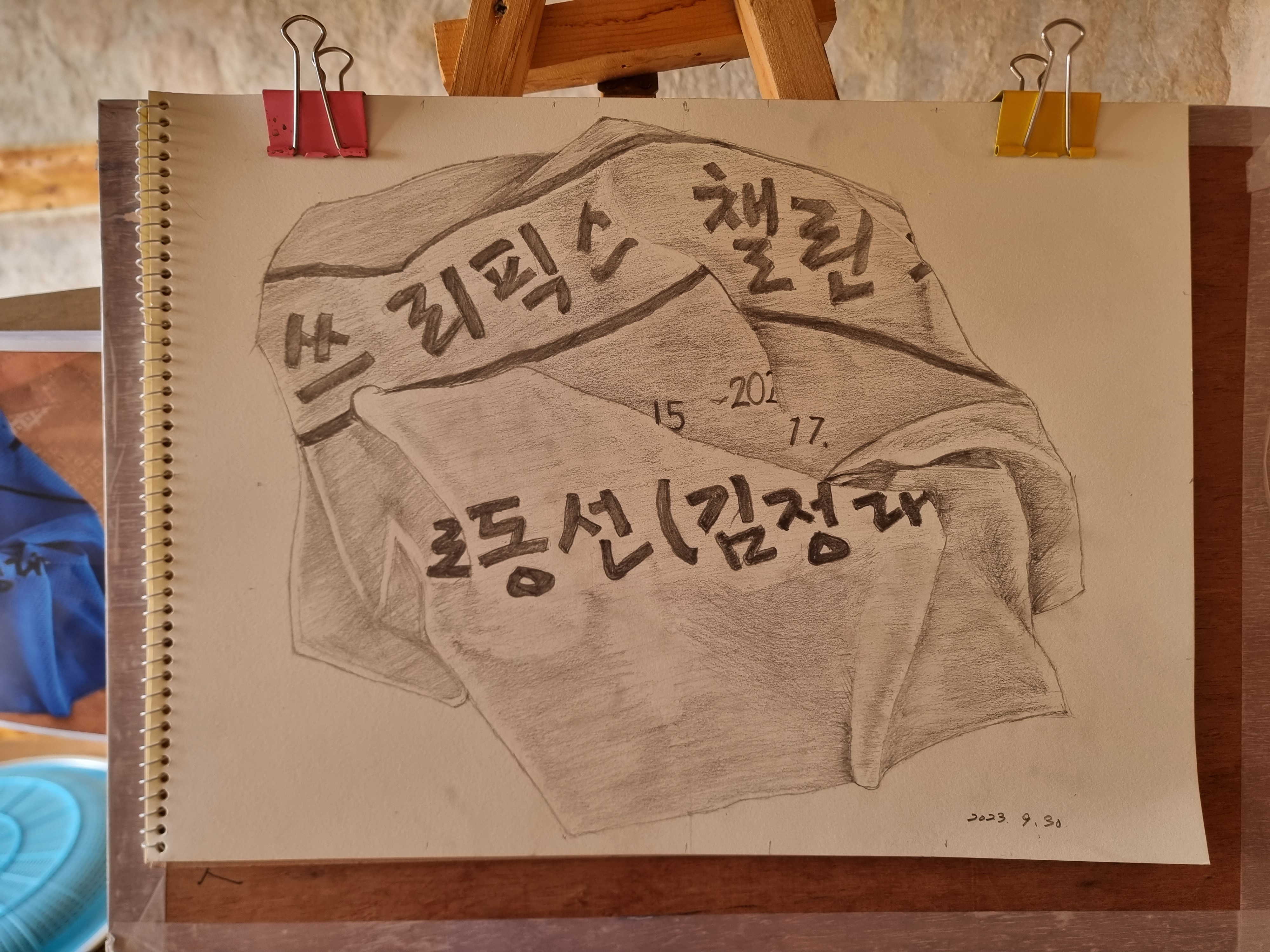 - 9시 20분쯤 집을 나섰다. 문화원까지 20분 가량 걸린다. 오늘도 내가 제일 먼저 도착했는데, 그럴 때가 자주 있다. 오늘은 젊은 신입생을 비롯하여 평소보다 많은 분들이 참석했다. 둥글게 앉아 있는 수강생들의 한 가운데 수건이 걸린 의자를 놓고, 각자의 위치에서 수건을 그리는 작업이다. 문화원 수업을 마치고 나올 때는 보슬비 같은 비가 살짝 내리고 있었다.