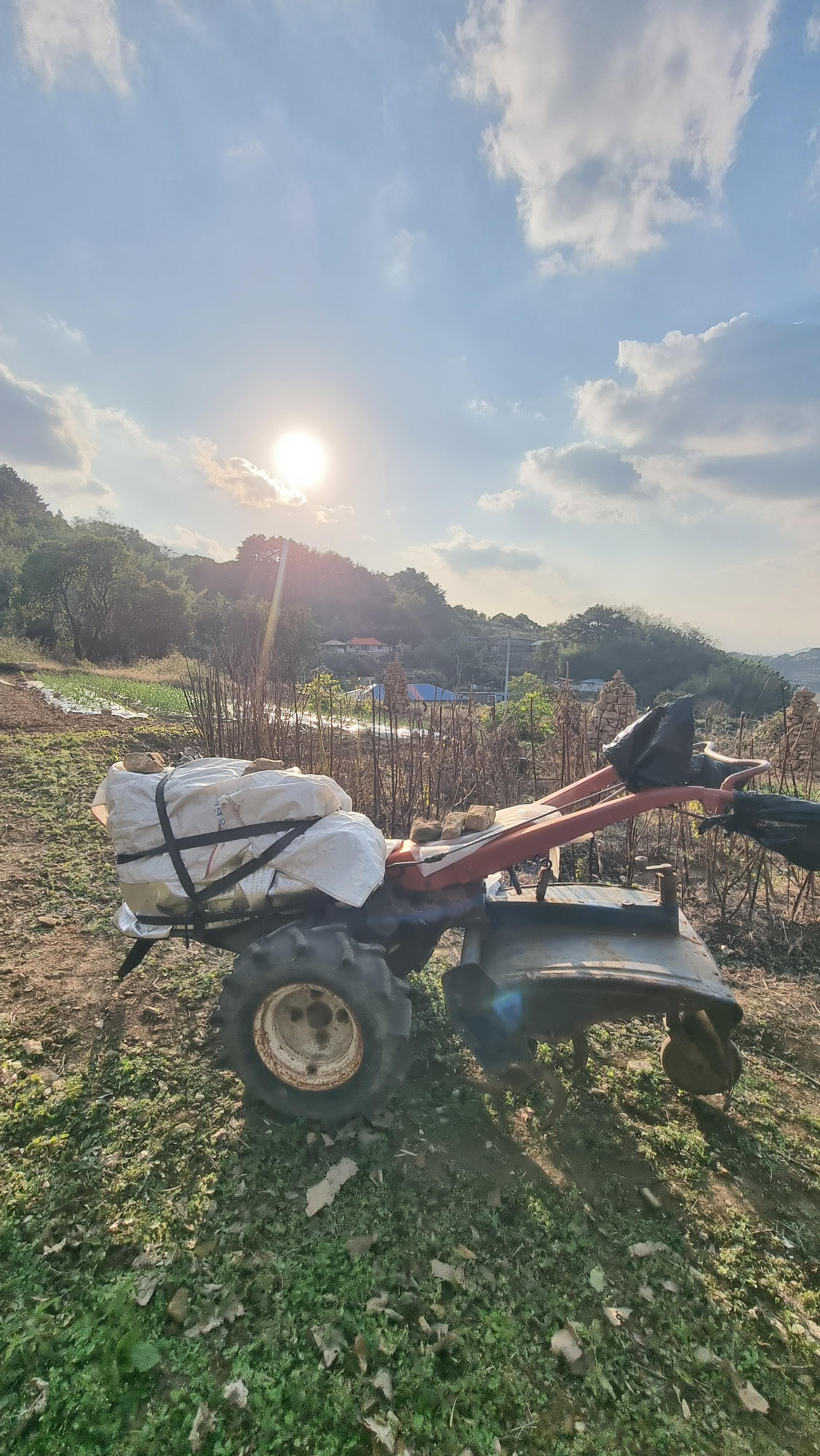- 점심을 먹고는 올해 더 이상 운행할 일이 없을 듯한 경운기가 혹 추위에 얼지 않게 보온재로 감쌌다. 야외용 깔개를 여러 겹으로 둘러싸고 바람에 날려가지 않도록 단단히 묶어 주었다. 그렇게 하지 않아도 괜찮겠지만 부식도 방지할 겸 해서 그랬다. 도라지와 더덕 주위에 있던 들깨대도 뽑았다. 이것은 말려서 불 쏘시개로 쓰면 된다.