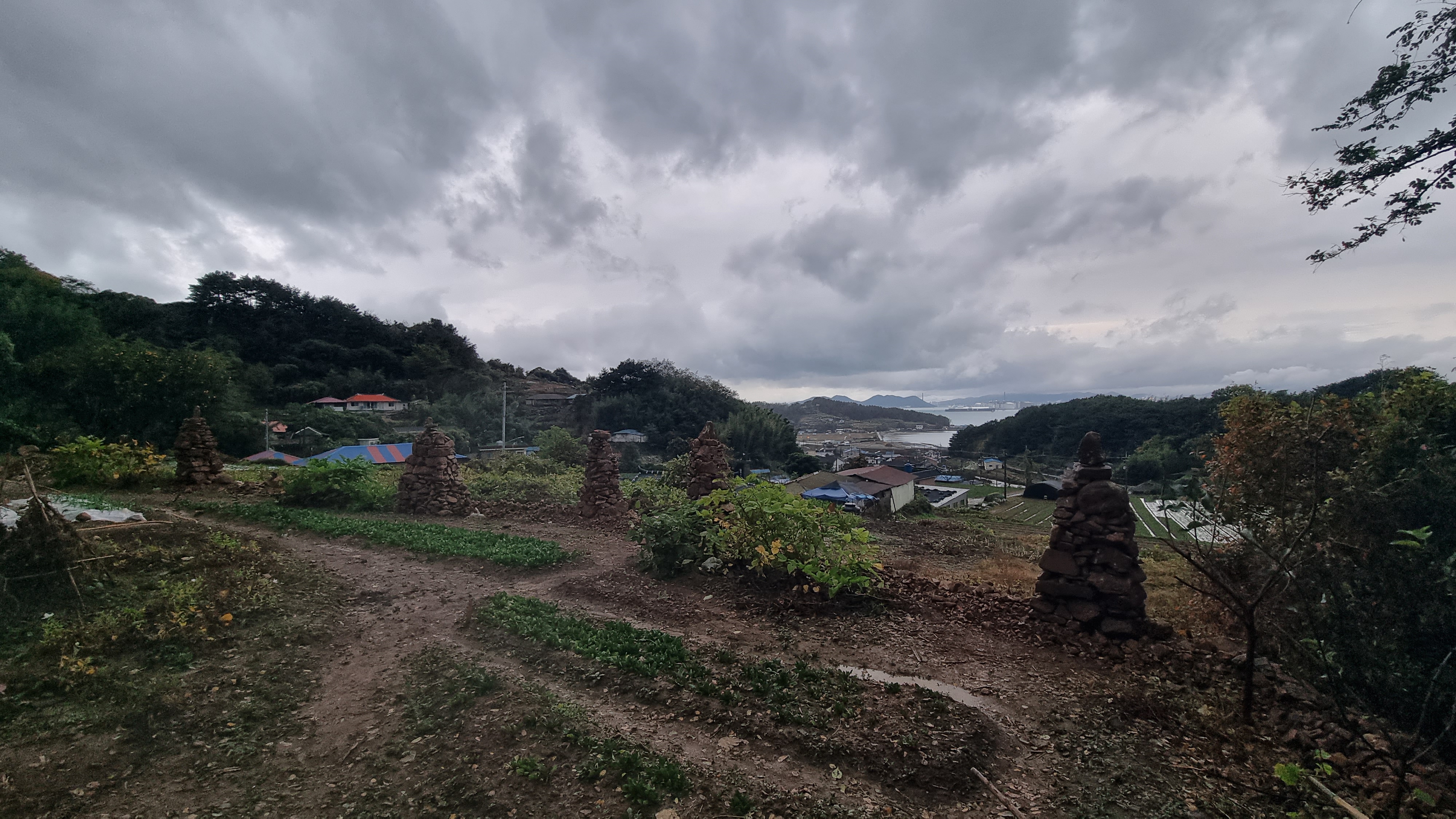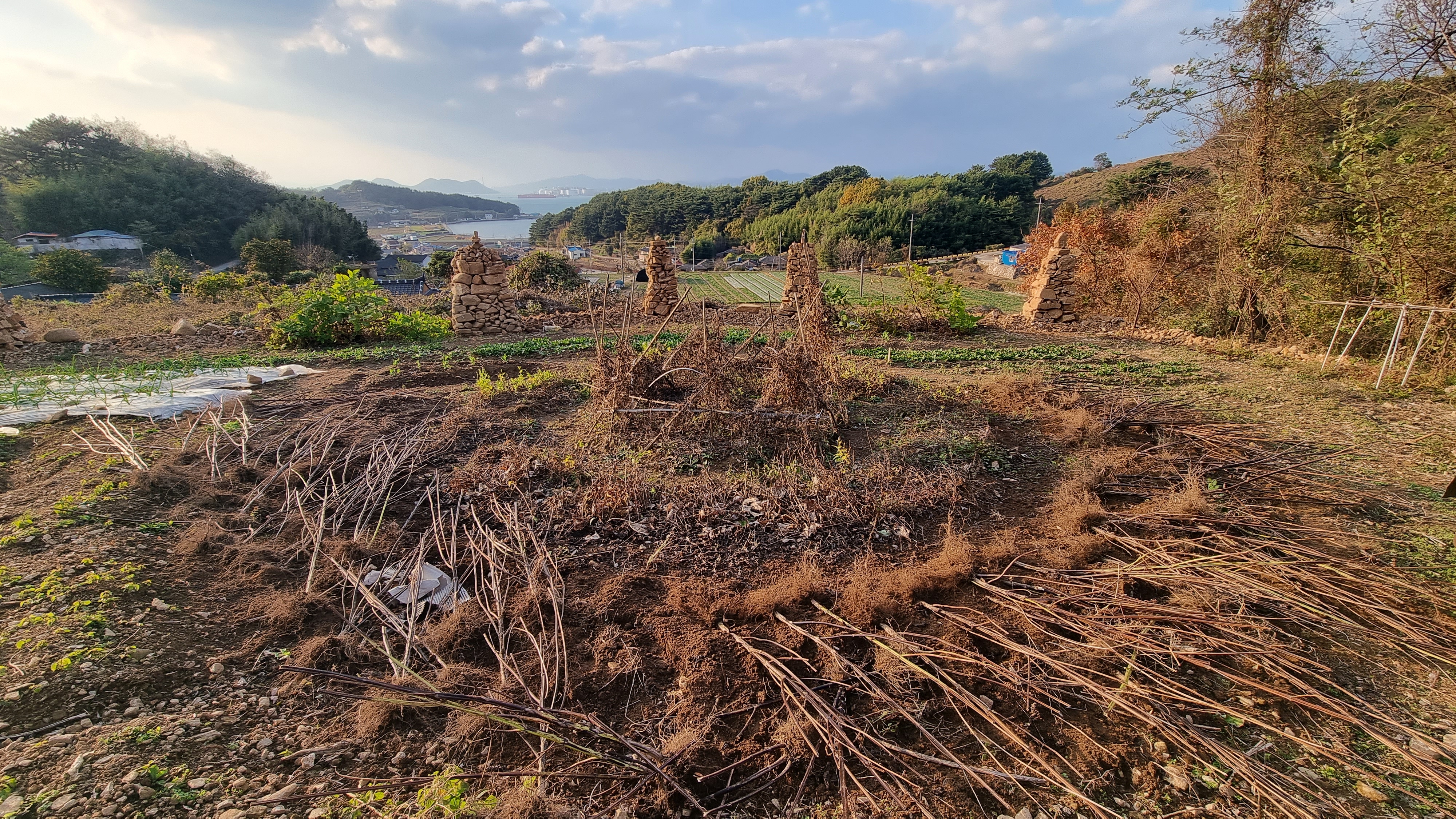 - 간밤에 바람이 세개 불긴 불었나보다. 곧 수확을 해야할 듯한 유자가 제법 많이 떨어져 있었고, 마늘을 씌워 놓은 비닐이 군데군데 벗겨져 20센티미터 정도 되는 마늘잎이 많이 꺾여 있었다. 그런데 염려했던 다섯 개의 돌탑은 이상이 없었다. 바람에 날렸던 비닐을 다시 고쳐 덮고 마늘잎들을 비닐 구멍으로 빼내는 작업을 오전 내내 했다.