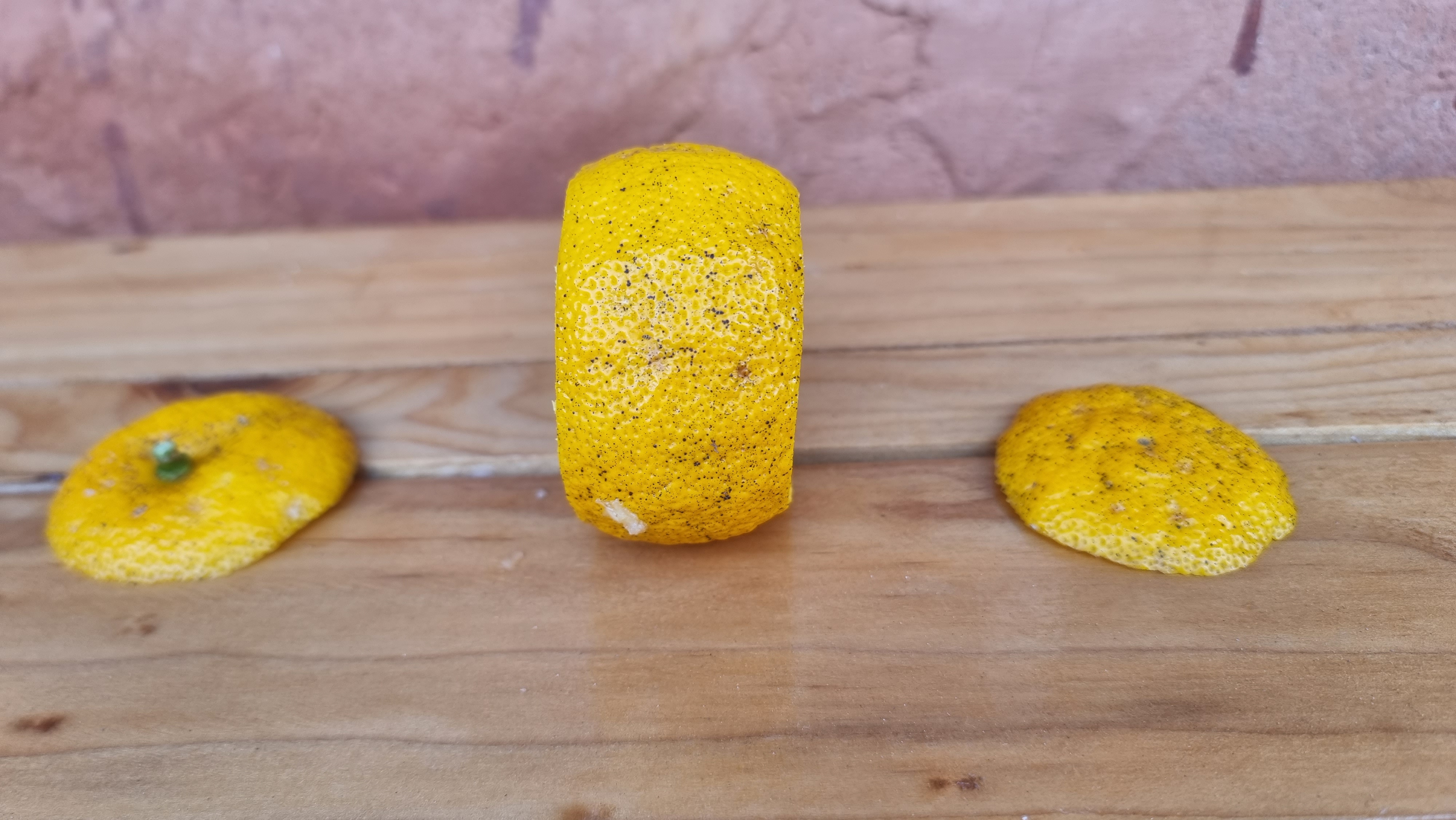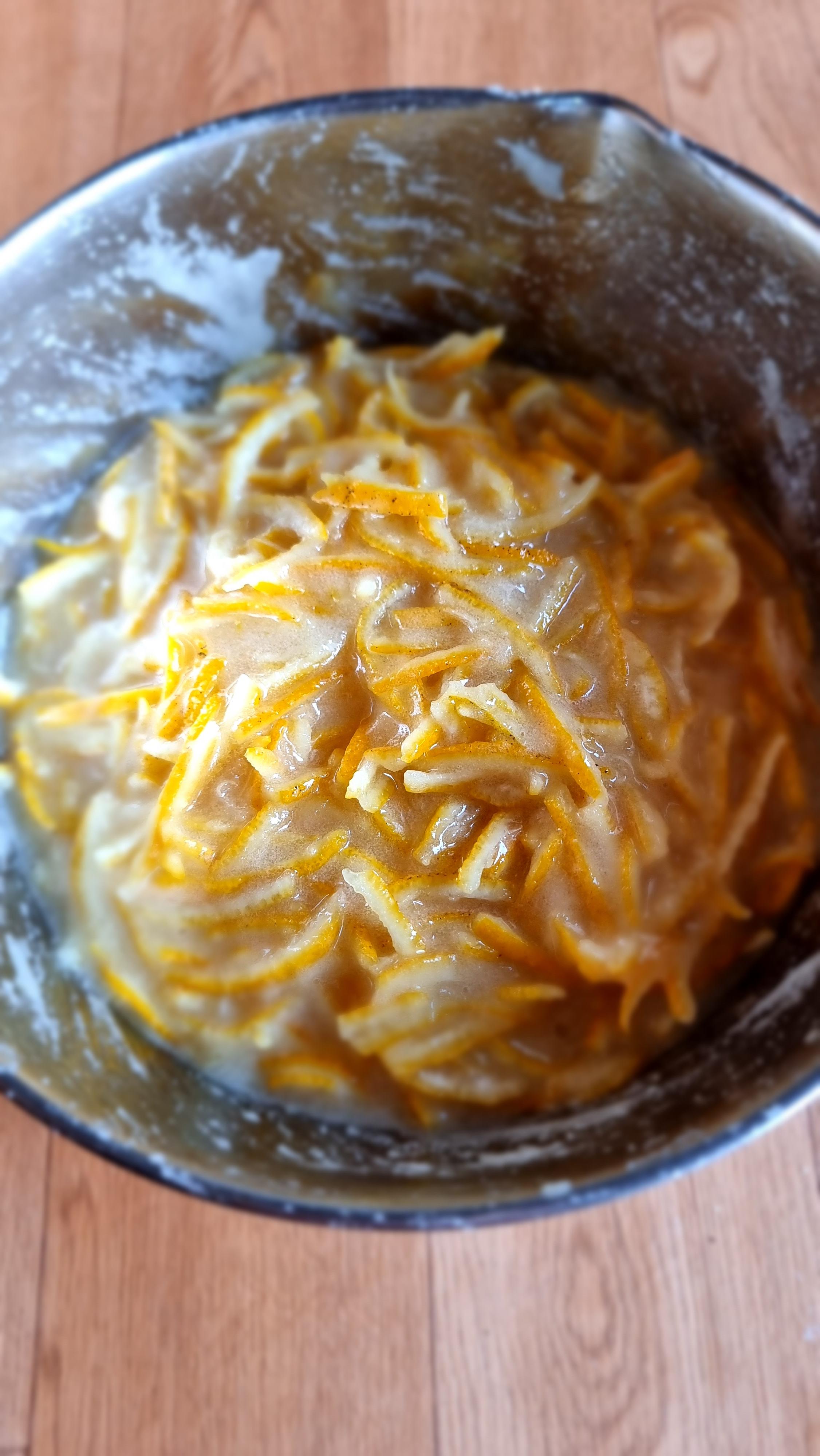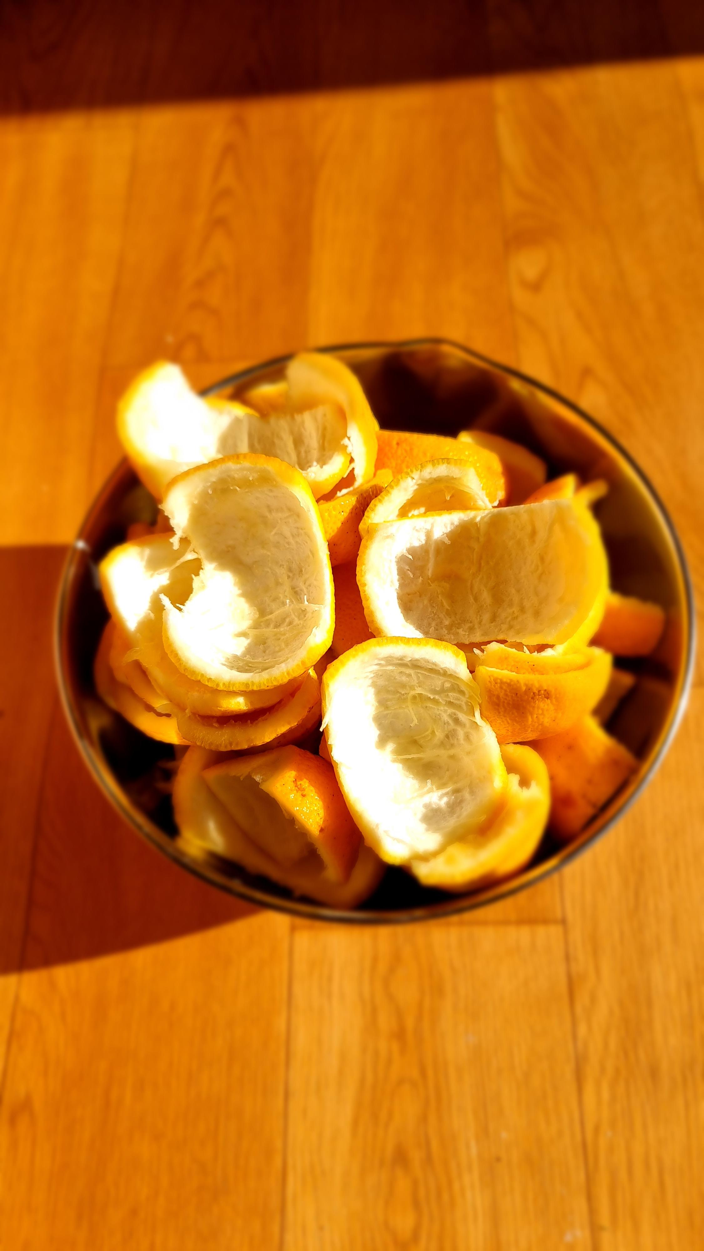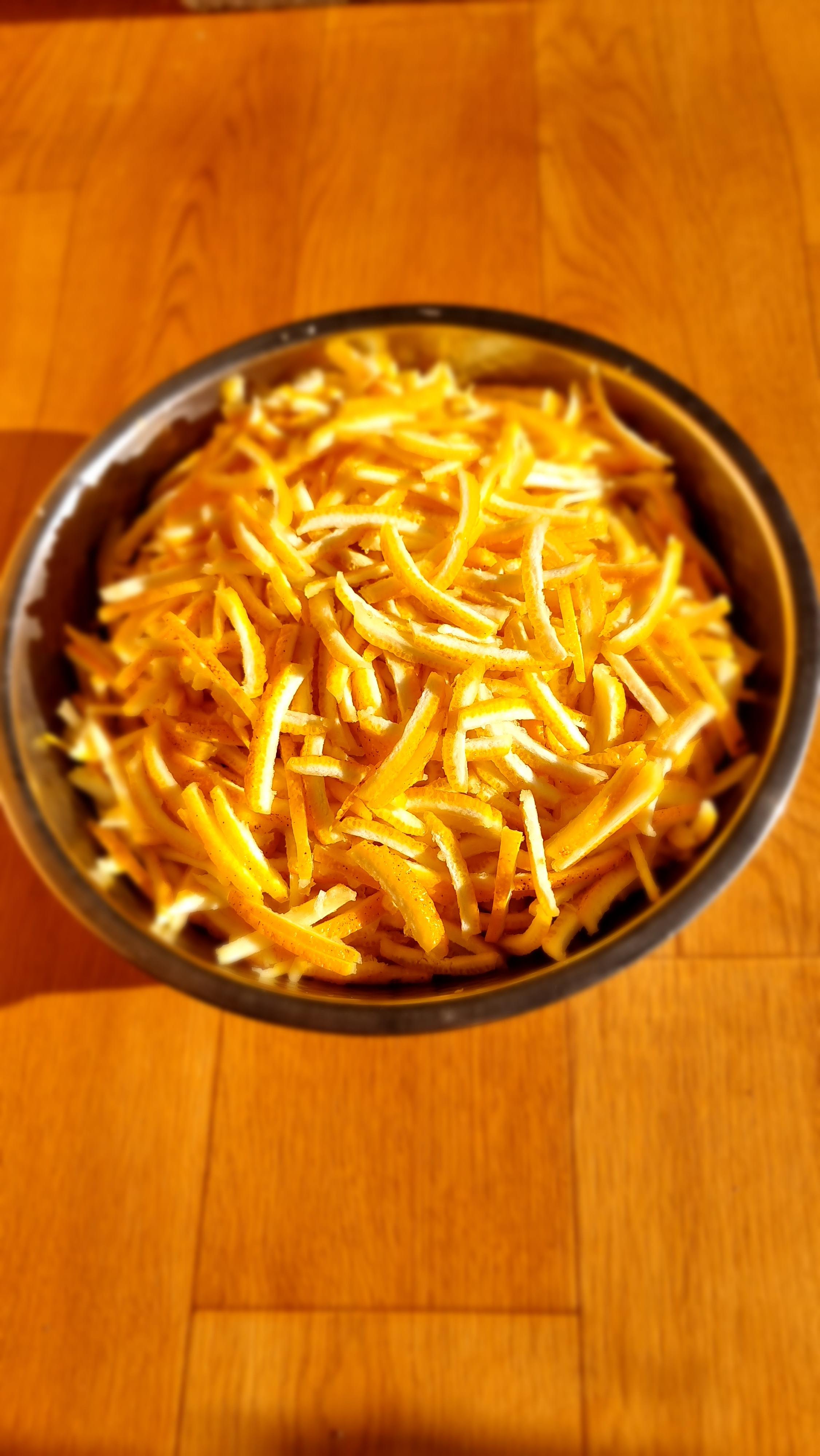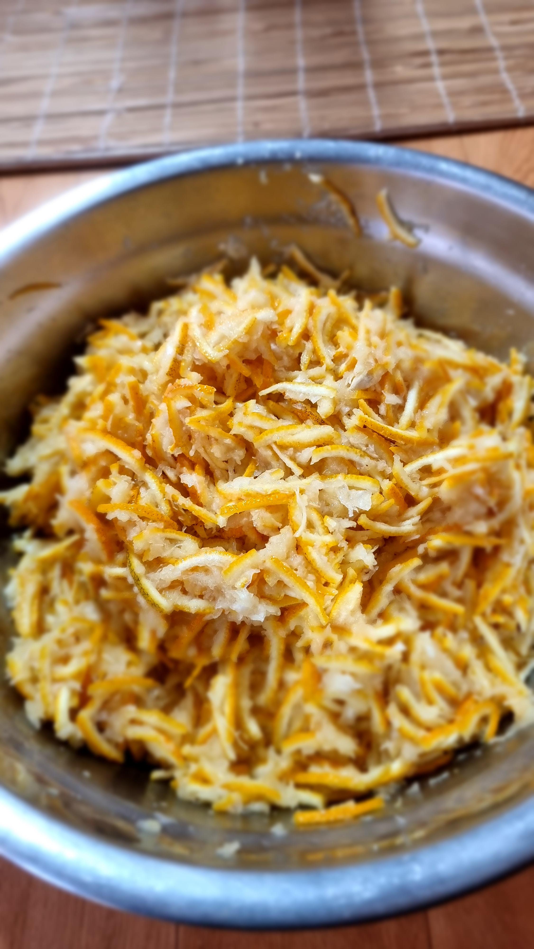 - 유자를 따서, 수세미 등으로 깨끗이 씻어야 하는데, 씻을 때 물이 들어가지 않도록 꼭지를 따는 것이 아니고, 꼭지가 달려 있는 상태로 씻는 것이 좋단다. 씻은 후 마른 수건으로 물기를 완전히 닦거나, 말려 물기를 없앤다. 그런 후 꼭지 부분과 꼬리 부분을 잘라 내고, 껍질을 속과 껍질을 분리한다. 껍질은 잘게 채를 썬다.