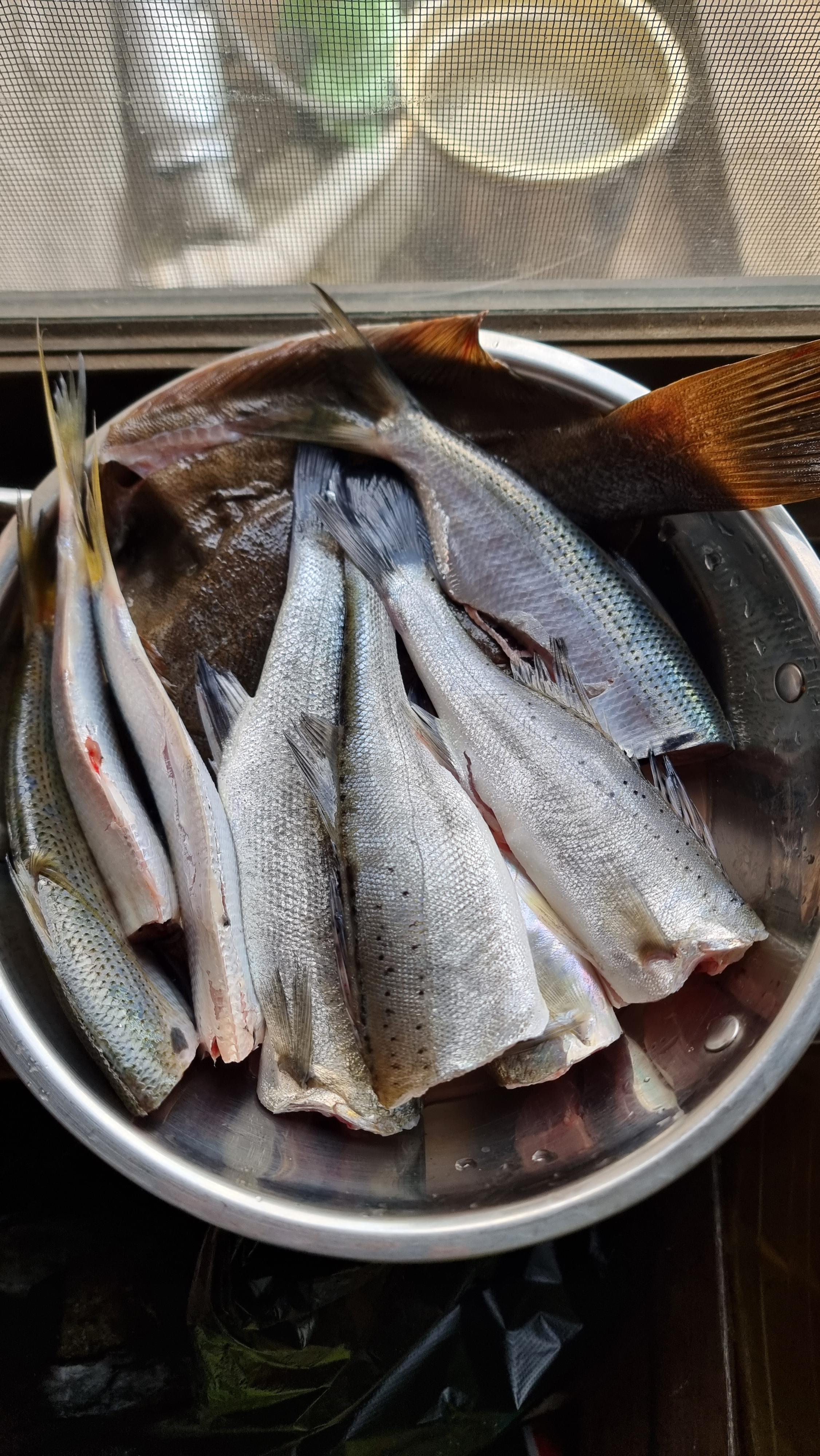- 오늘도 늦은 아침을 먹었다. 아침을 막 먹었을 때, 이웃집 할머니가 도다리, 깔따구(농어 새끼), 전어, 전갱이 등 생선을 열댓 마리 가져 오셨다. 추운 날씨고 걷기도 불편하실텐데....깔따구는 살아 있는 거라 회로 먹어도 된다신다. 참 고마운 분이시다. 아마 가까운 분 중에 고기를 잡는 분이 계신지 가끔 싱싱한 생선을 주시곤 하신다. 할머니가 가시고 그 생선을 다듬는데 오전 시간을 보냈다.