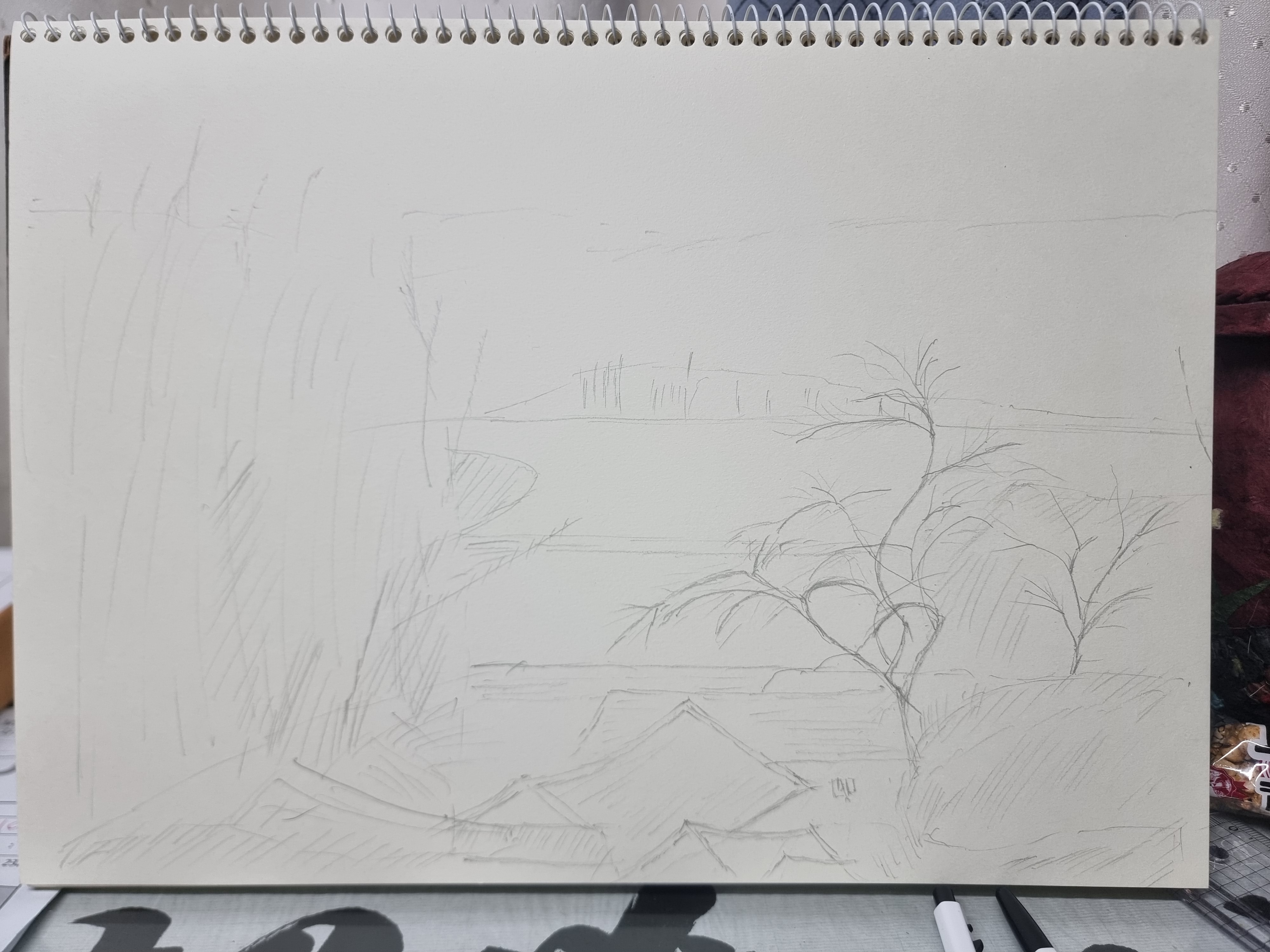 - 아침 일찍부터 시작한 일이 11시 반이 지나서야 끝났다. 결국 아침을 12시 넘어서 먹었는데, 자연스럽게 점심이 되어버렸다. 점심을 먹고는 그림 연습을 좀 했는데, 어제 스케치한 집에서 본 서쪽 방향의 풍경이다. 맑았을 때 사진은 파란 하늘이 있던 더 멋진 풍경이지만, 이런 모습도 연습이 되지 않을까 해서다. 조금씩 나아지겠지.