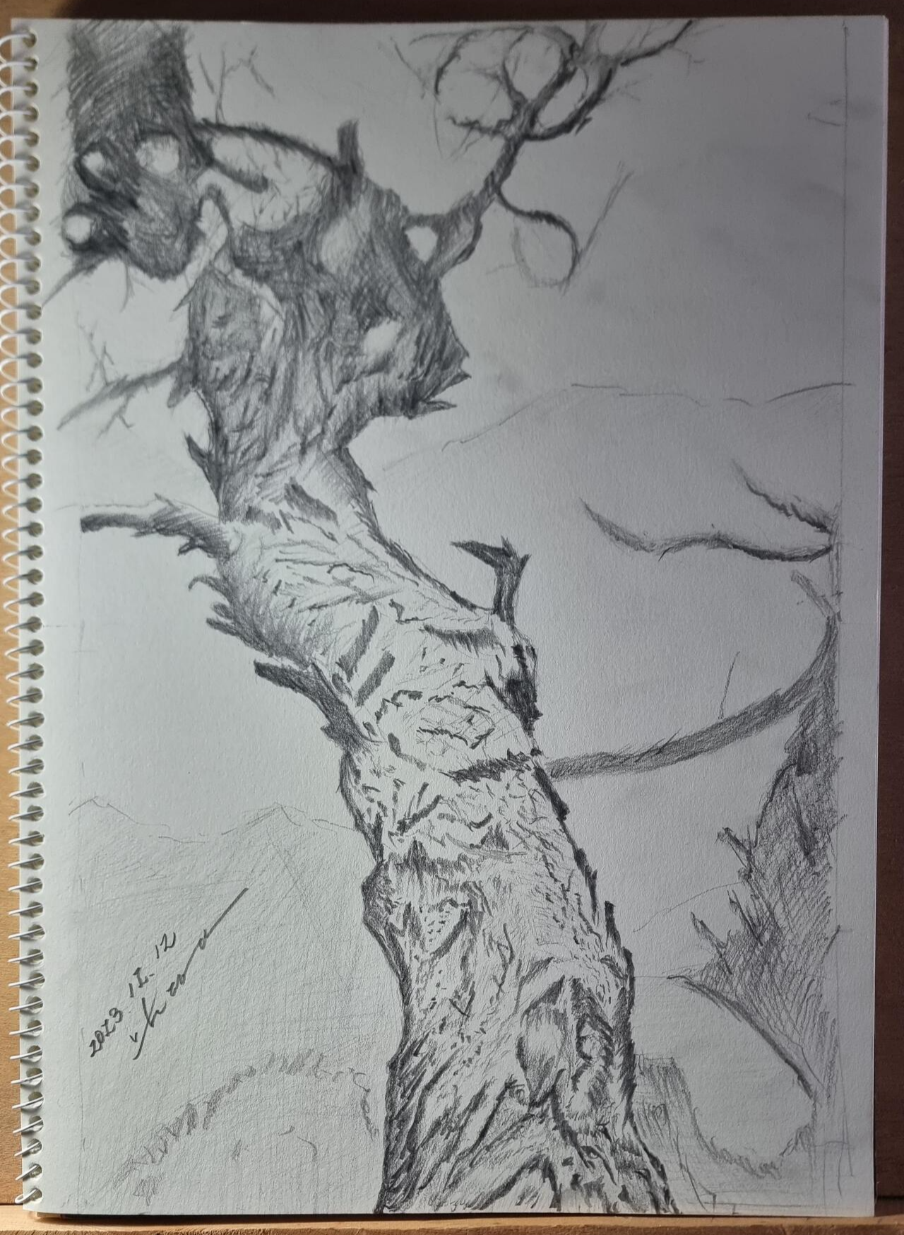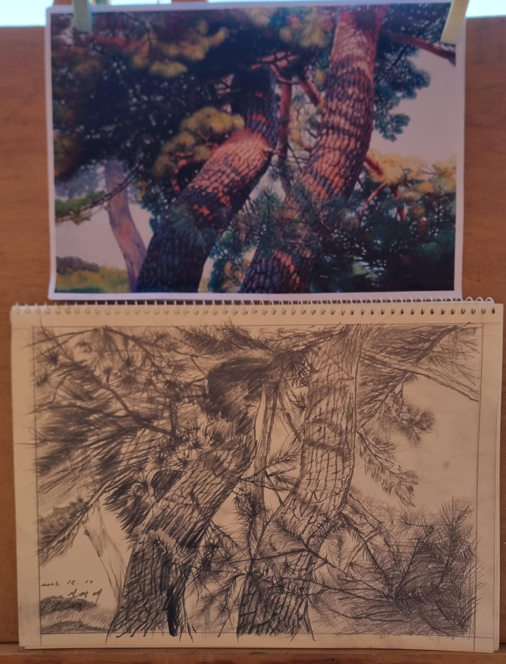 - 그래서 오늘은 아침을 먹고 그림 연습을 좀 했다. 수업시간에 그리던 소나무를 어느 정도 마무리 했다. 올 후반기부터 시작한 드로잉 수업이 내년에 폐강이 된다니 아쉽긴 하지만, 이건 어짜피 연필로 하는 것이라 사물이나 풍경을 비슷하게 그리면 될 듯해서 가끔 해 볼 생각이다. 오랜만에 앞집 박사장님께서 오셨다. 우리집에서 차도 마시면서 한참을 놀다가셨다. 점심을 먹고도 몇 년 전에 갔다온 울주 백운산 겨울 사진을 놓고 그려보기도 했다.