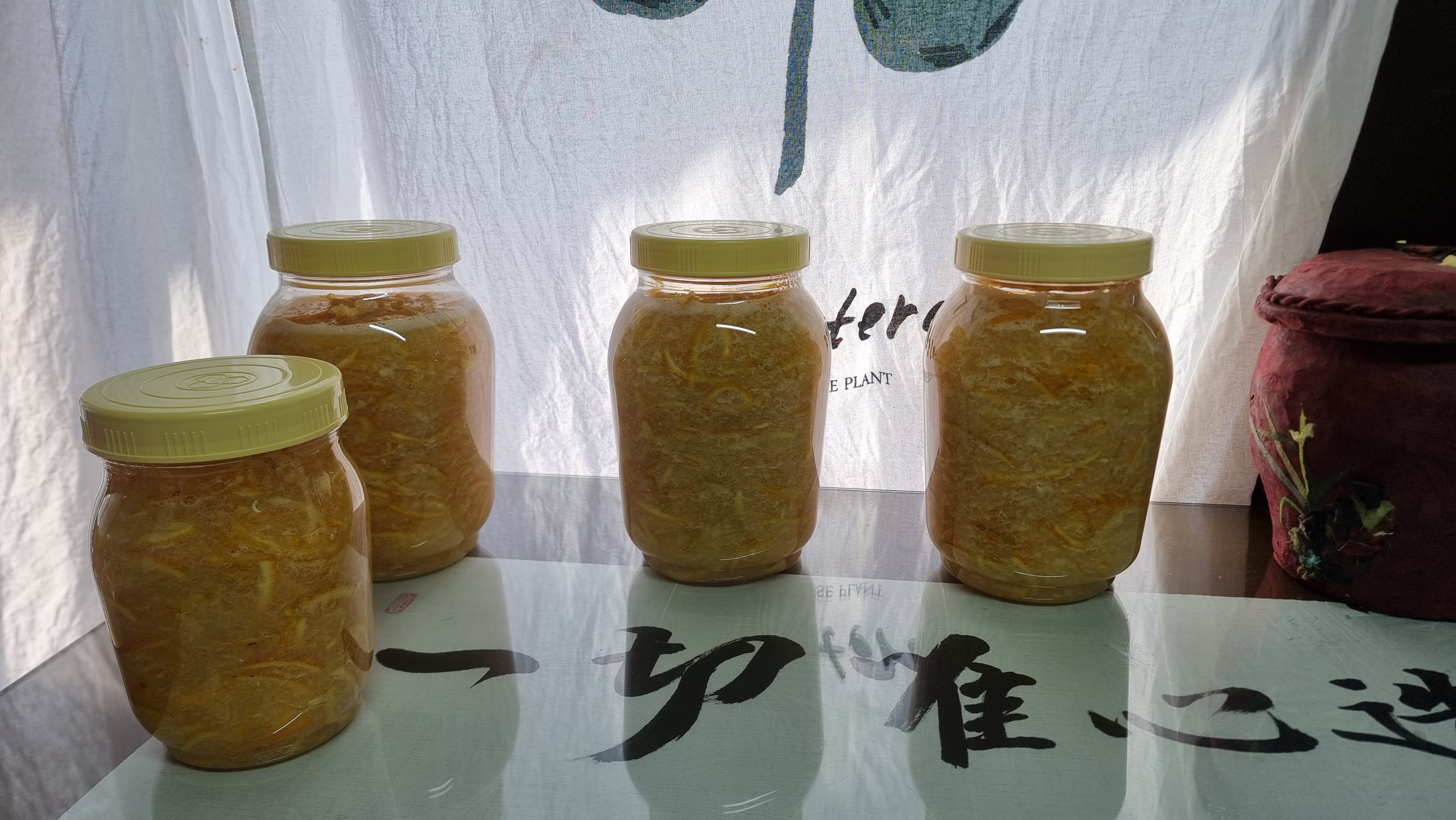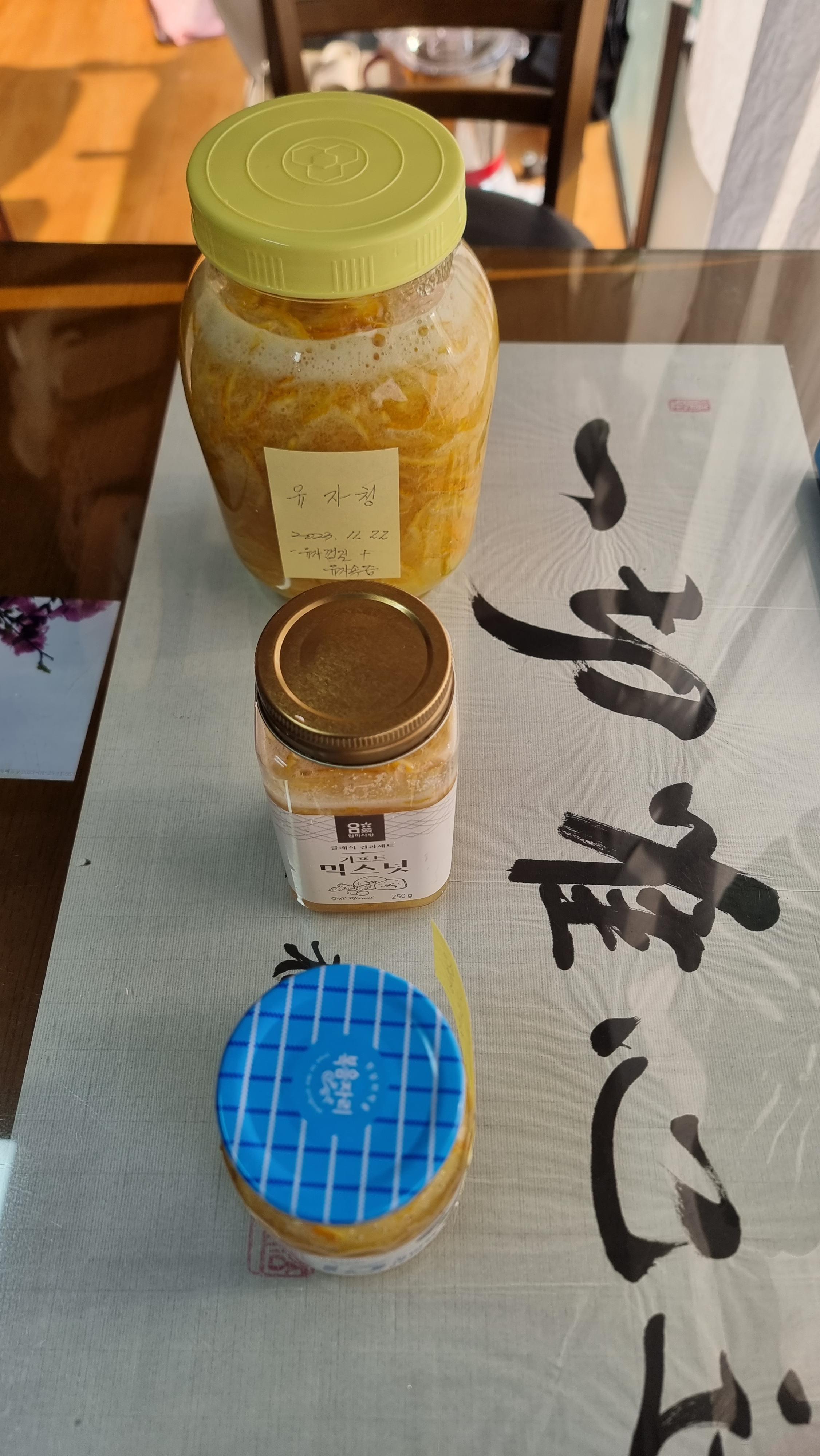 - 집에 와서 점심을 먹고는 어제 만들어 숙성시켜 놓은 유자청을 병에 담았다. 예상했던 대로 큰 병 하나와 작은 병 둘, 딱 맞게 들어갔다. 그리고 유자청 첫 잔을 안방 가운데 놓고 마음 속으로 고했다. '이 집을 잘 보살펴 주세요' 하면서....