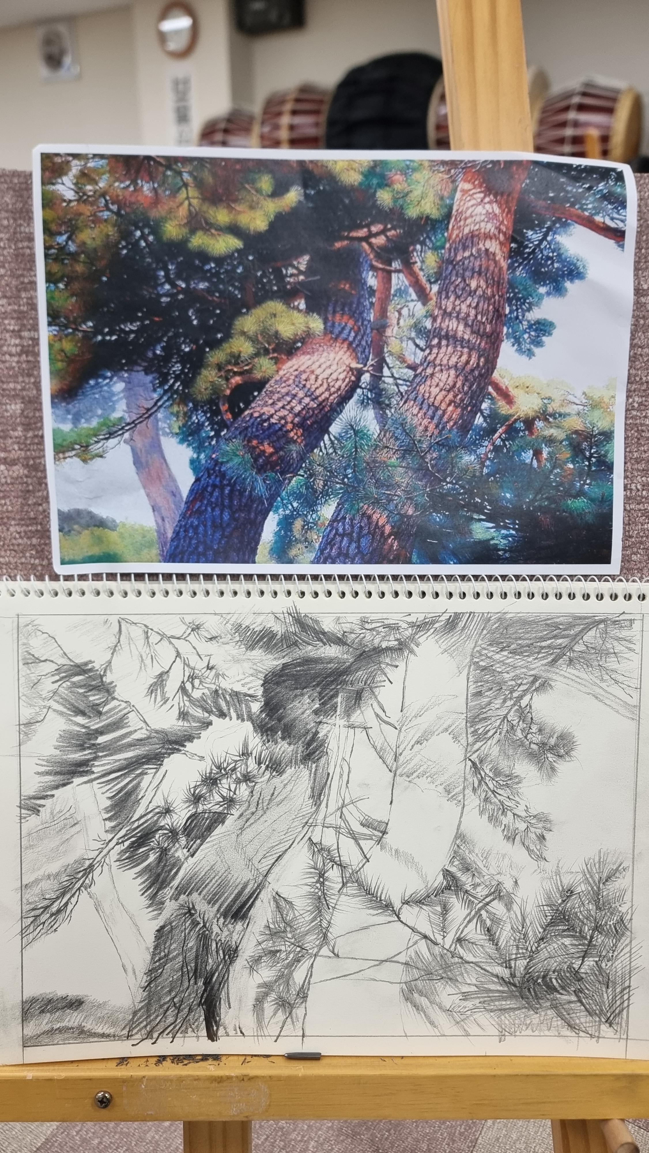 - 요즘은 해가 짧아 문화원 수업이 있는 날이면 바쁘다. 5시 전후로 일어나기는 하지만 바깥 활동은 7시 정도 시작된다. 그때 쯤 아침운동을 하고, 집 주변을 한바퀴 돌고, 아침을 지어 먹고 하면 그렇게 된다. 오늘도 서둘러 문화원으로 갔다. 오늘은 드로잉 수업이 있는 날인데, 고정적으로 참여하는 인원은 5 ~ 6명 내외다. 오늘은 소나무를 그렸다.