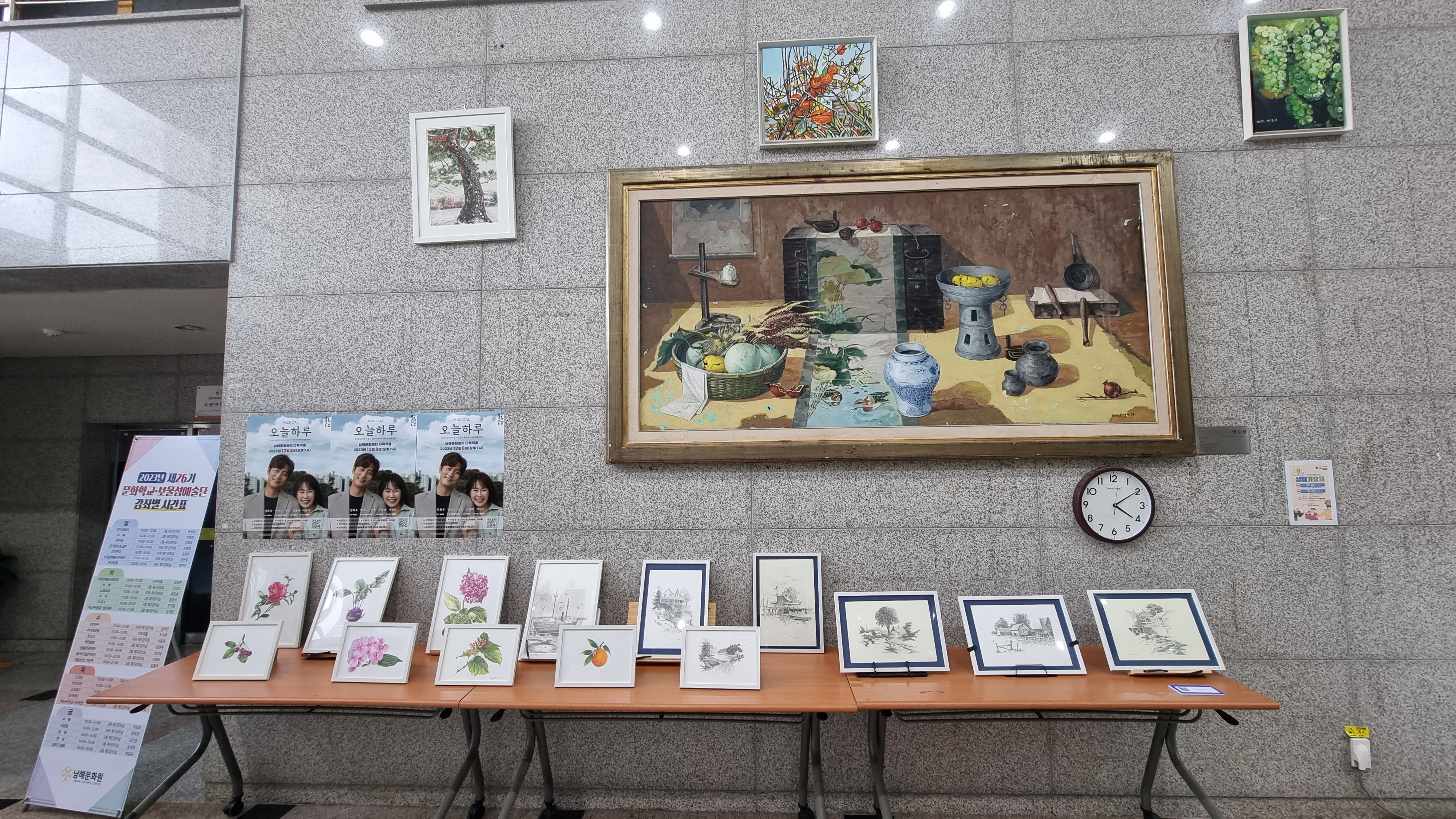 - 문화원 수료식 시간에 맞춰 문화원에 갔더니 제법 많은 사람들이 객석에 앉아 있었다. 곧이어 식전 행사가 시작되었는데, 판소리 공연, 양반춤 공연, 아코디언 연주, 오카리나 연주, 시니어 모델 워킹, 장구놀이 공연, 라인댄스 공연, 섹스폰 연주 등이 있었다. 모두 문화원 수강생들이 하는 공연과 연주라 조금 서툰 점도 있었지만 훌륭했다. 또 문화원 로비에는 내가 속해 있는 서양화반, 드로잉반을 비롯한 색연필화반, 서예반, 문인화반, 도자기반, 폼아트반, 민화반, 캘리그리피반 등의 수강생들의 작품이 전시되고 있었다. 식전 행사가 끝나고 수료식이 간단하게 진행되었고, 수료식이 끝나자. 제7회 보물섬 실버가요제 본선 진출자 12명의 노래 경연도 펼쳐졌다. 개중에는 거동 조차 불편한 나이 많으신 분들도 계셨는데, 노래 만큼은 기성 가수 못지 않는 솜씨를 뽐냈다.
