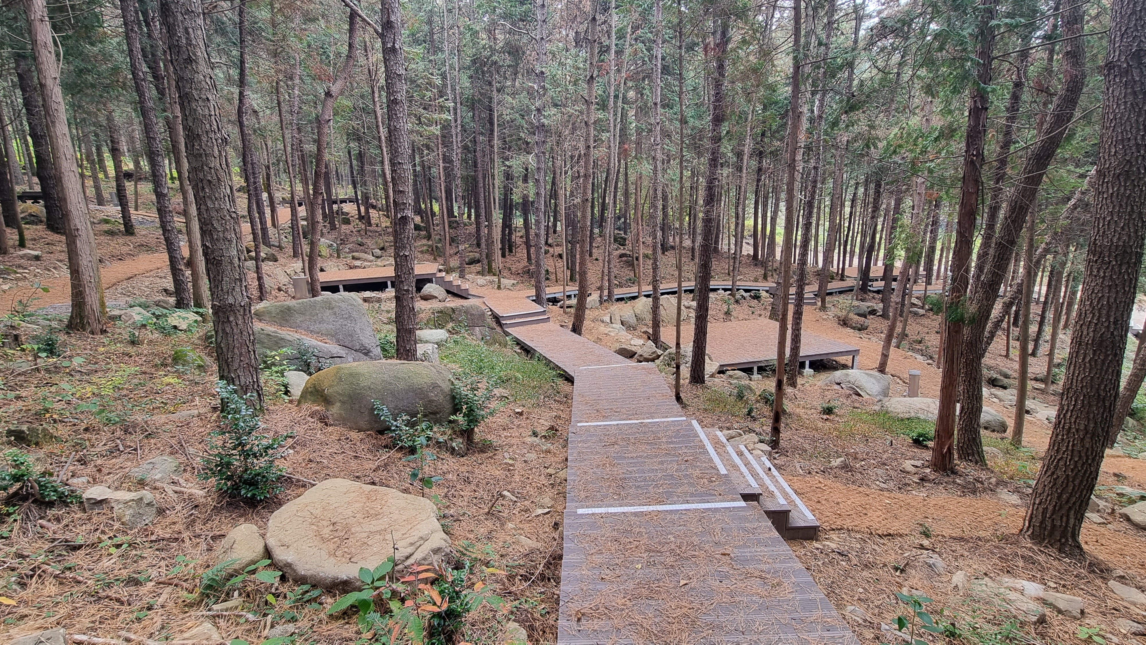 - 분진이 가라 앉을 동안에 간단한 간식을 챙겨 마을 옆길로 산책을 나섰다. 자동차 한 대 정도가 무리없이 다닐 수 있도록 포장된 도로지만 밭을 지나고, 소나무와 편백나무 숲이 있는 곳으로 이어져있다. 계속 가면 어디와 연결되어 있는지는 알 수 없다. 한 시간 정도 산책을 한 셈이다. 그 숲에는 야영장이 만들어져 있는데, 어느 데크 옆에 이상한 모양을 하고 있는 작은 바위가 있었다. 그 바위 안에 작은 돌이 박혀 있는 것 같았다.