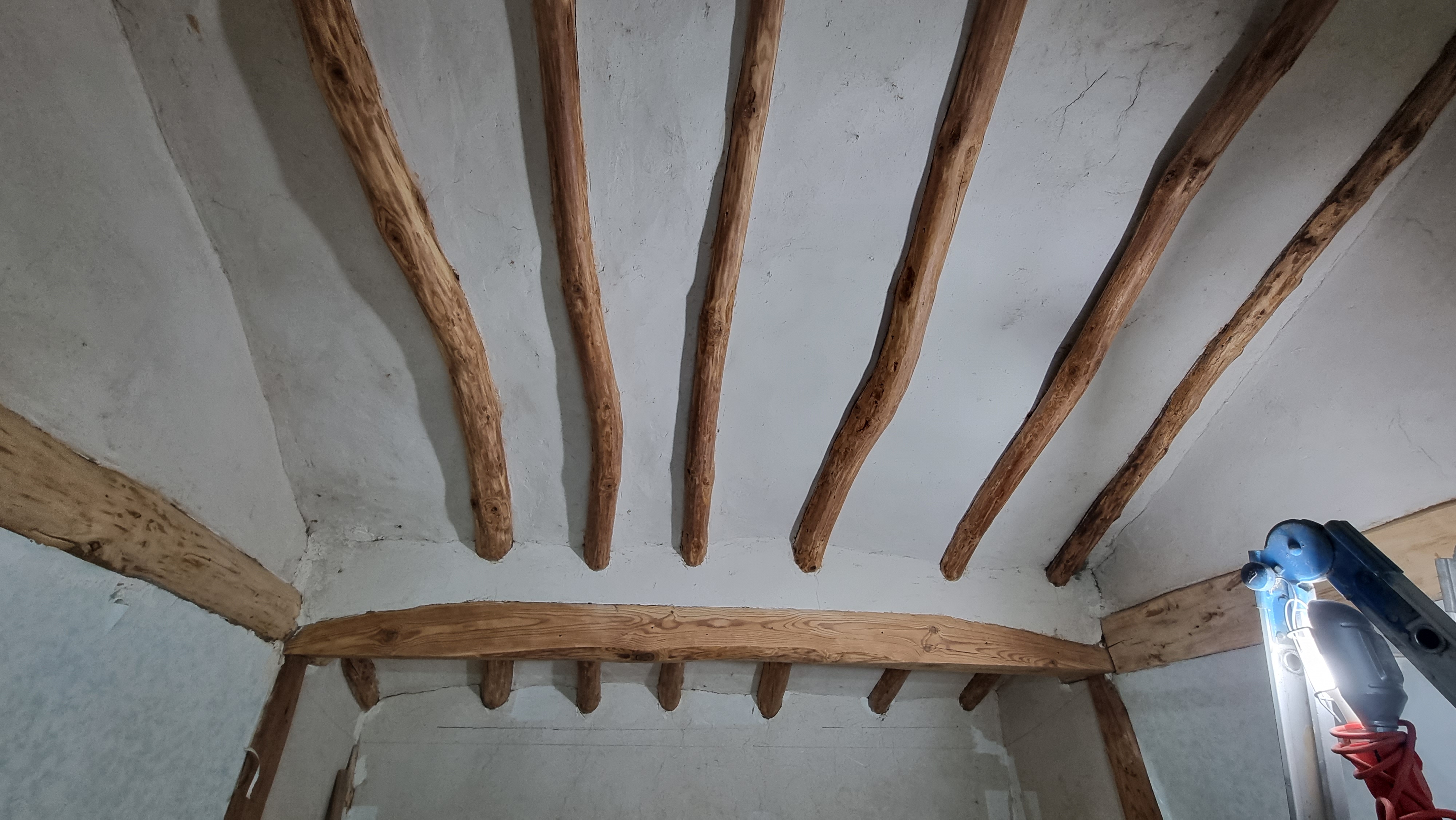 - 오늘부터는 본채의 안방을 조금씩 수리해볼까 한다. 우선 생각하고 있는 것은 서까래가 있는 천장부분을 수리할 생각인데, 서까래, 기둥 등 목재로 되어 있는 부분을 전동 그라인더로 연마하고, 니스를 칠한 후, 서까래와 서까래의 사이 회칠이 되어 있는 천장은 흰색 페인트를 칠할 생각이다. 만약 내 생각대로 잘 된다면 아주 멋진 천장이 되지 않을까 한다.
